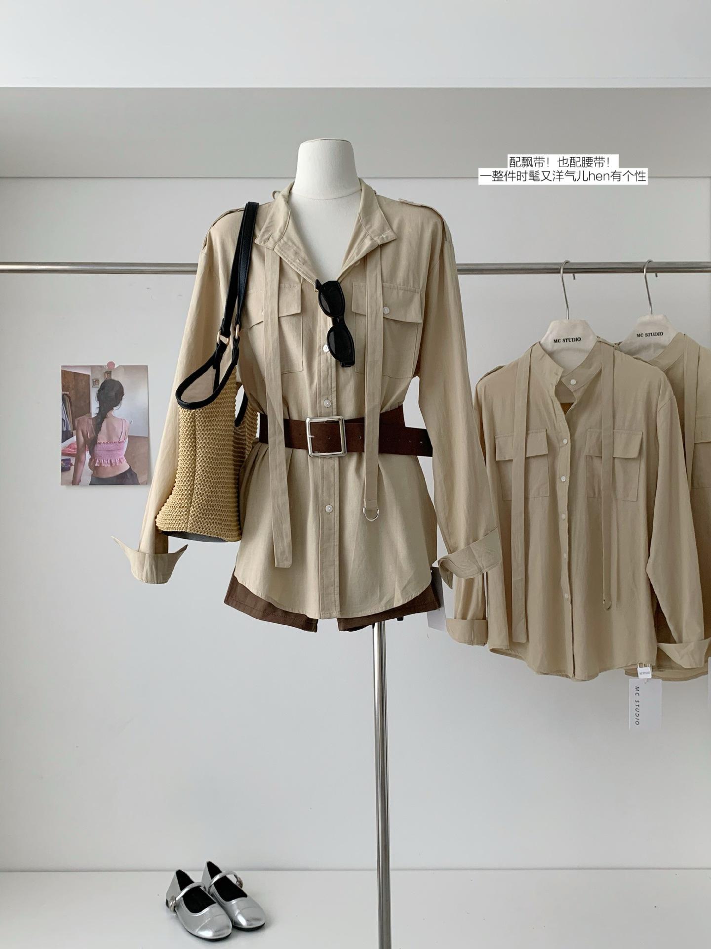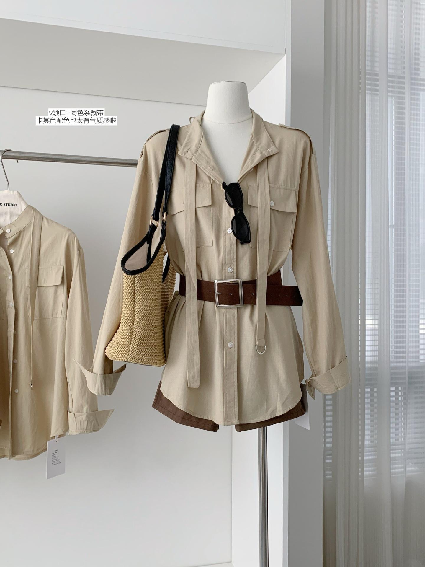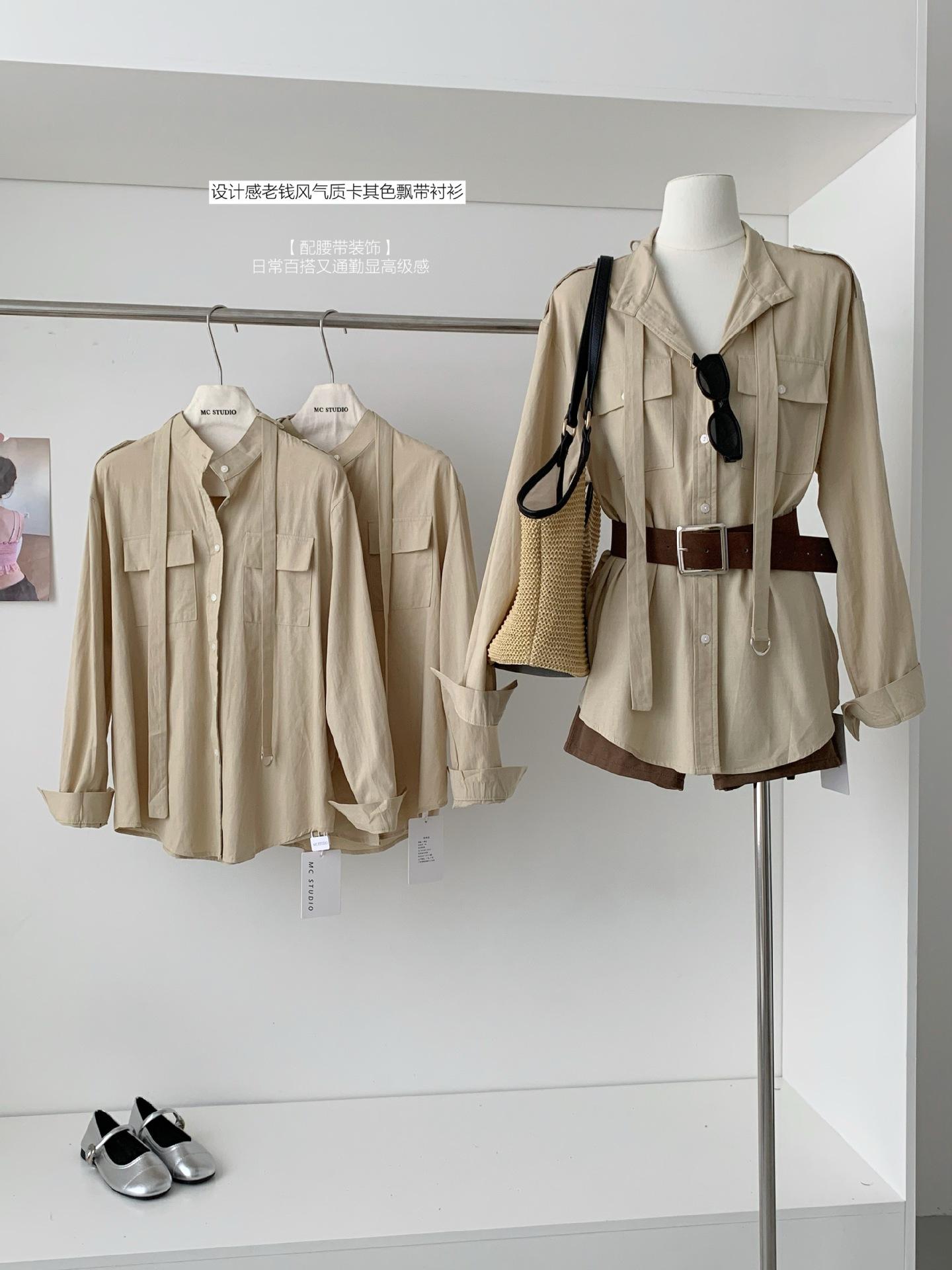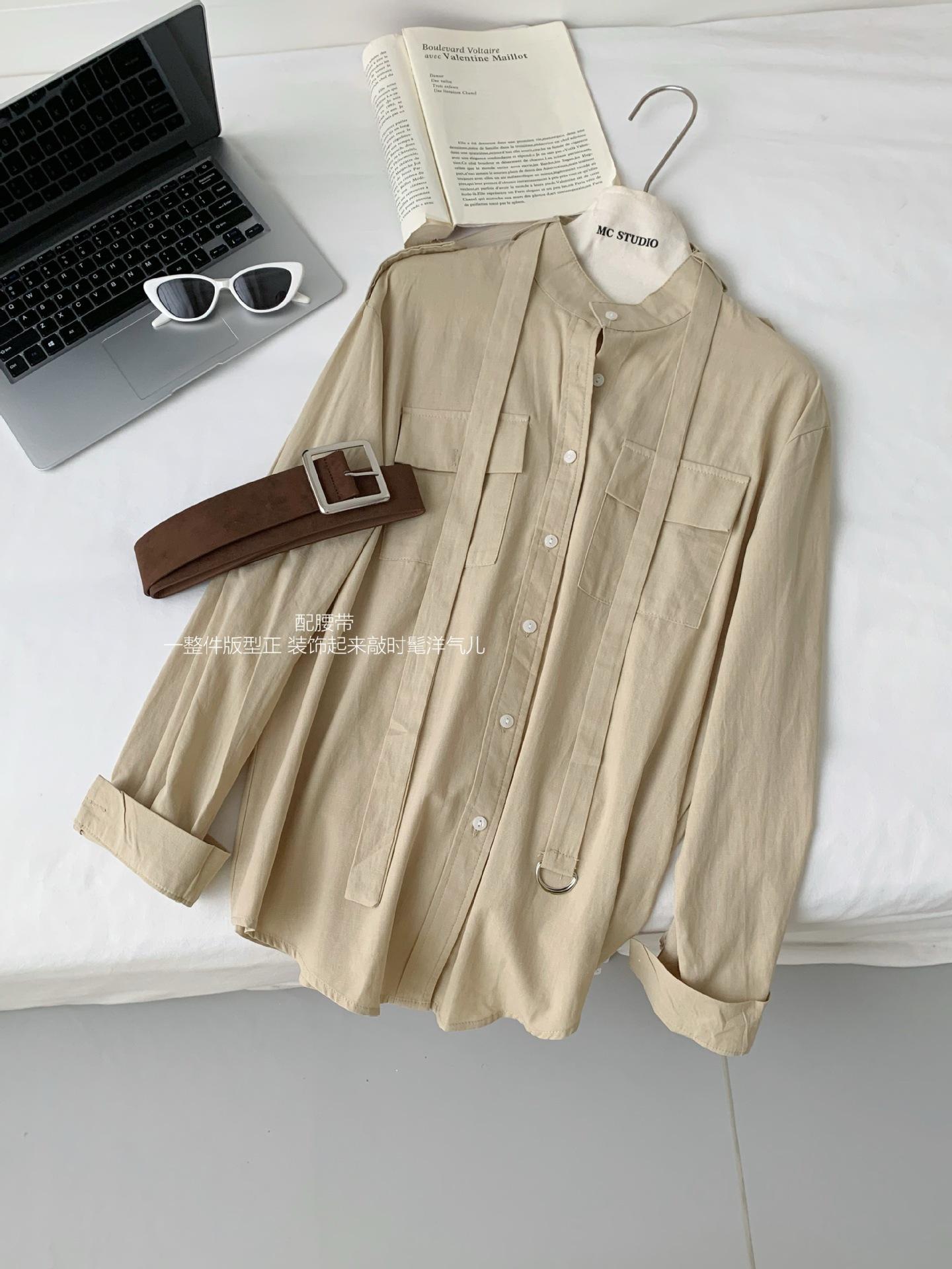 Camisa de moda de diseño nicho francés para mujer, temperamental, de largo medio, holgada, de una sola botonadura, con cinturón y manga larga