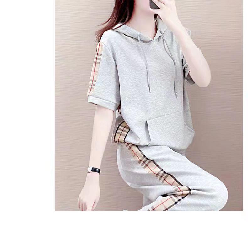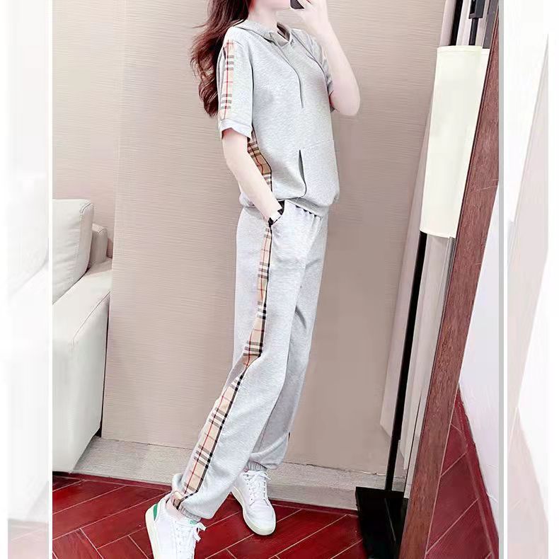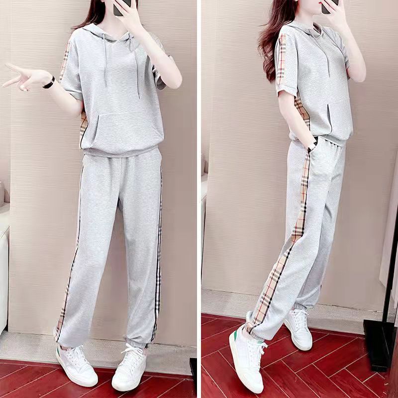 2025 Nueva Moda Suéter Holgado de Manga Corta con Capucha Traje Deportivo Verano Elegante Reductor de Edad Casual Conjunto de Dos Piezas
