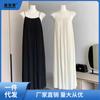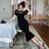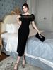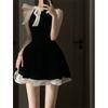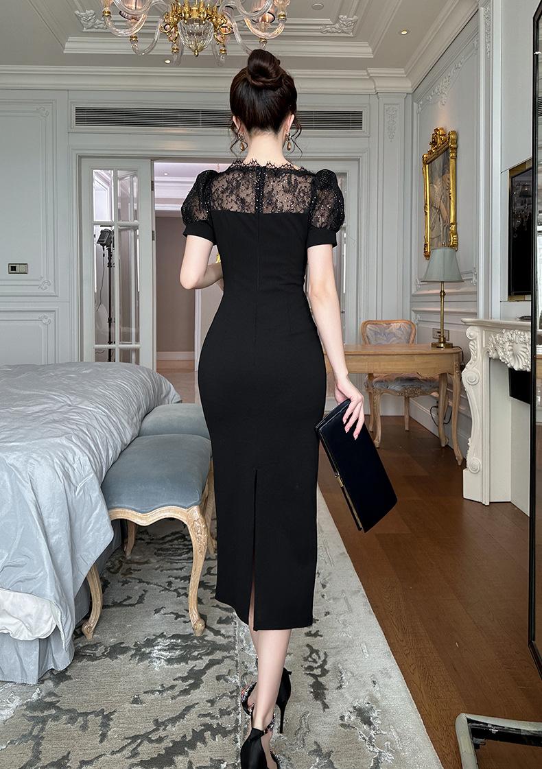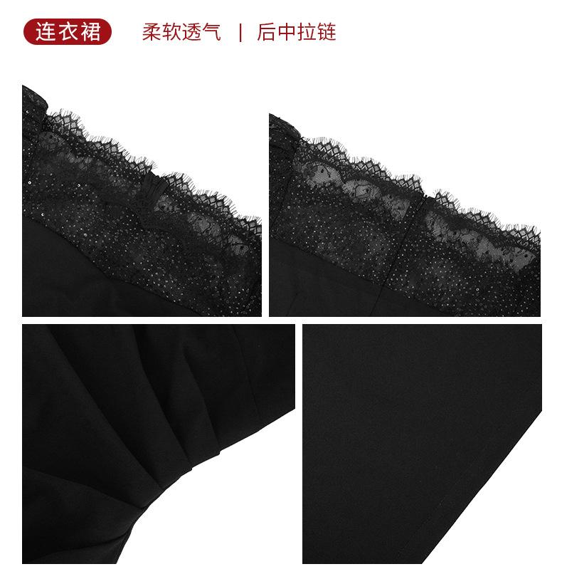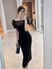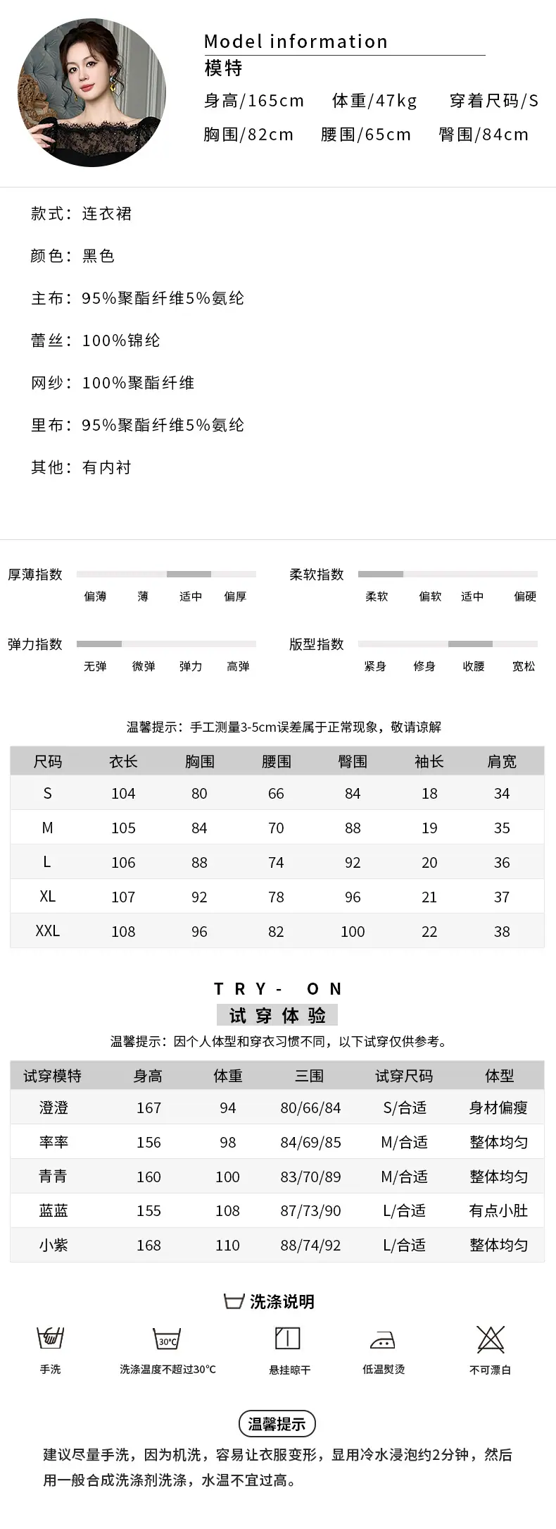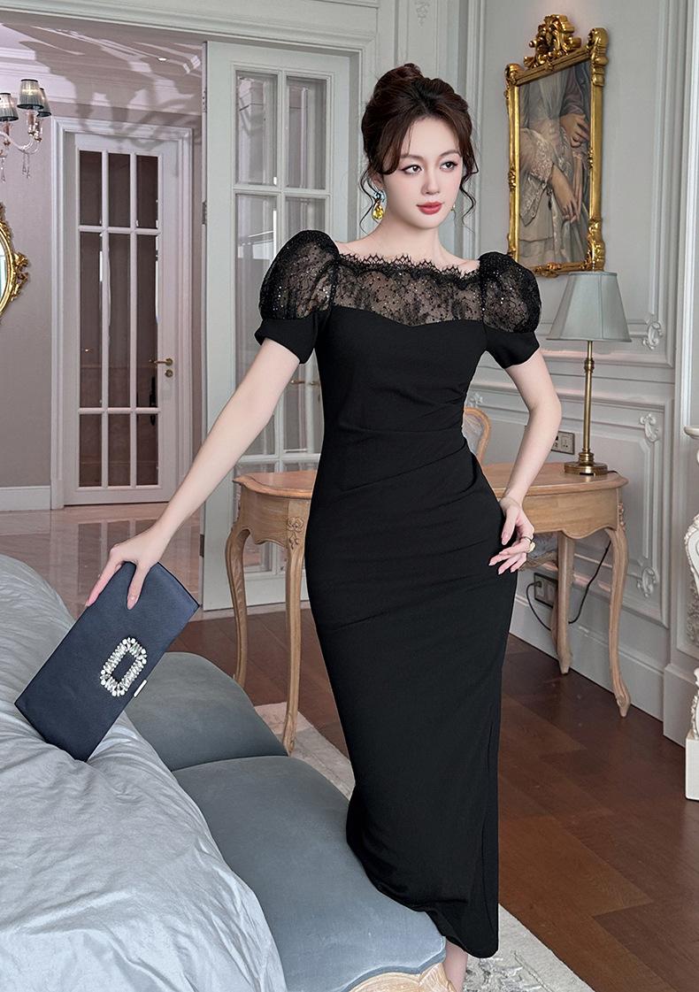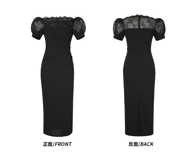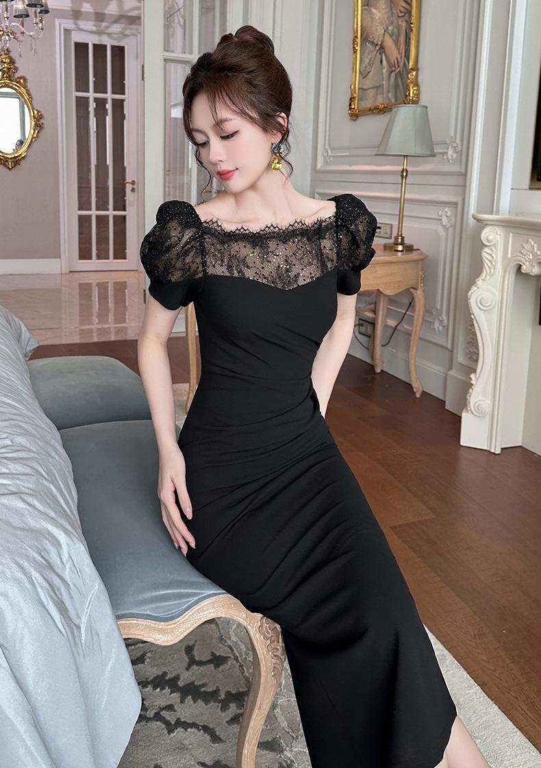 Vestido Negro Entallado con Pliegues Estilo Francés Cuello de un Carácter con Encaje Costurado Cintura Alta Vestido Negro Ajustado con Pliegues Estilo Hepburn con Sentido del Diseño 21687