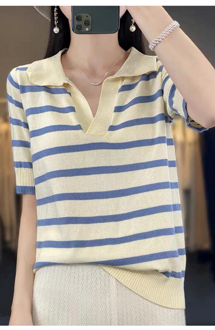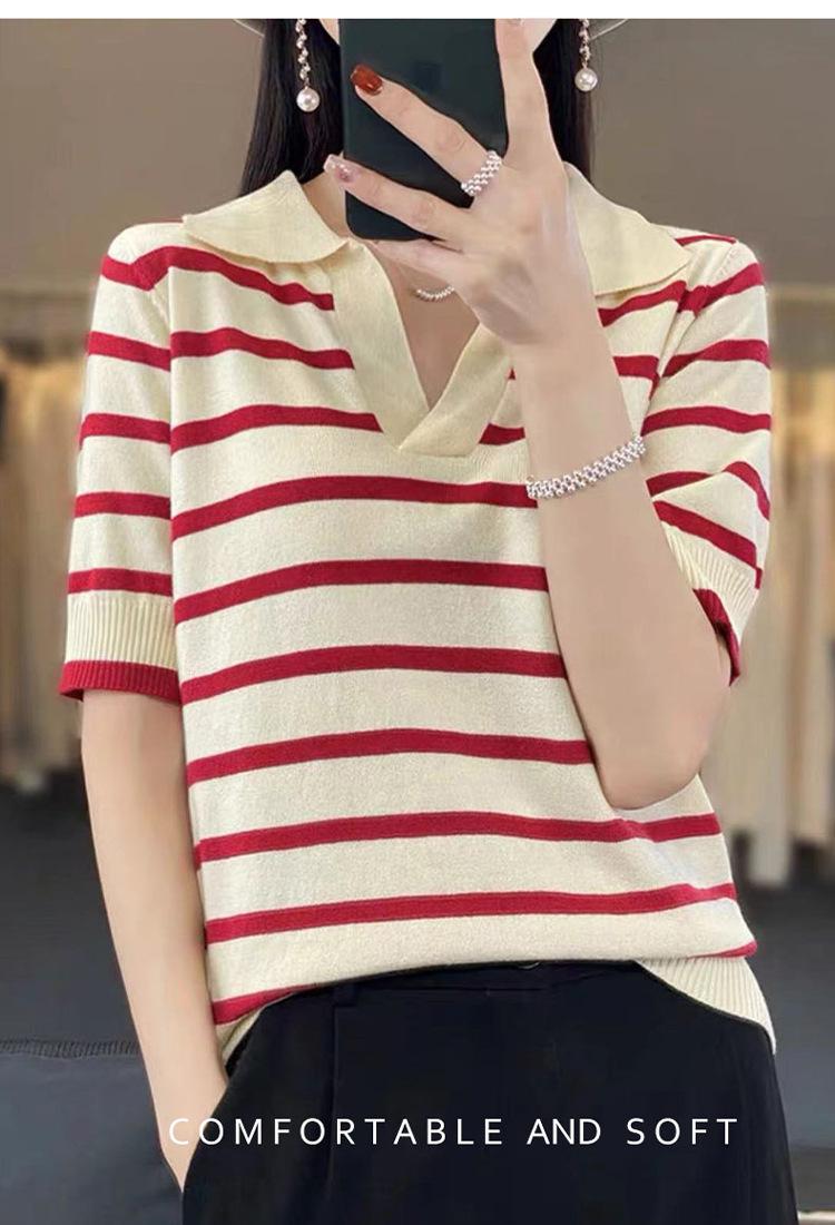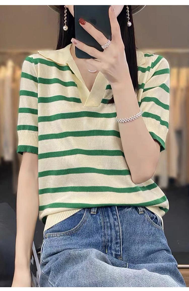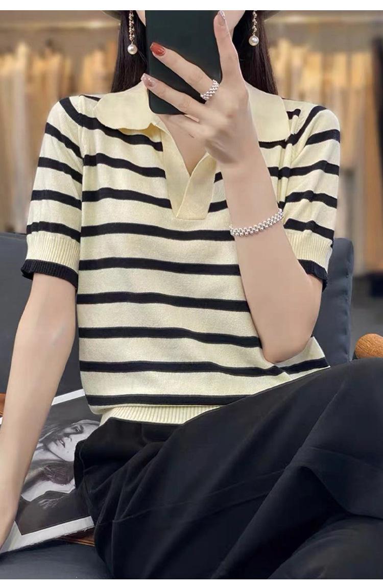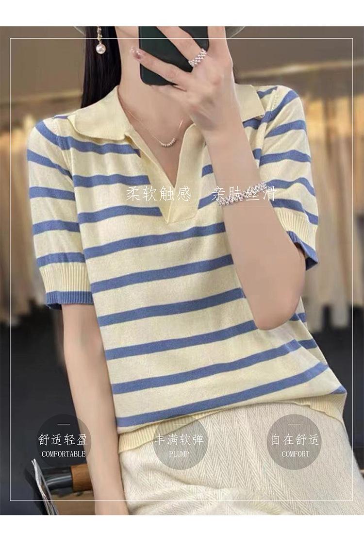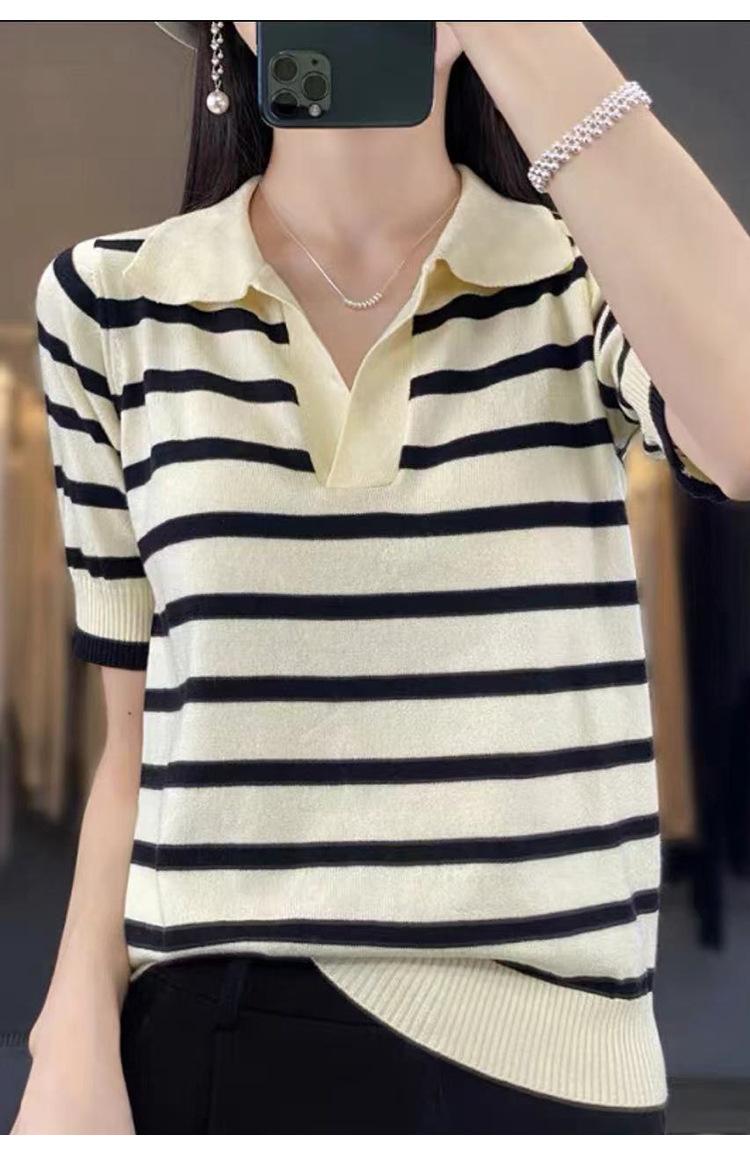 Compra Camisa de Punto de Seda Helada de Verano 2024 con Cuello POLO Delgado, Camiseta de Manga Corta con Rayas de Color en Contraste, Ropa Exterior, Top Elegante para Mujer al por mayor en Joom.pro