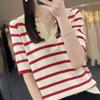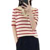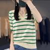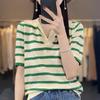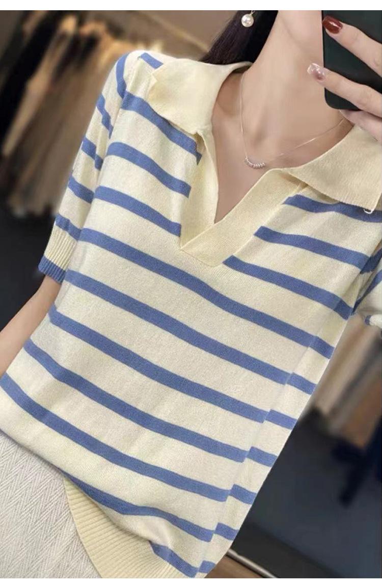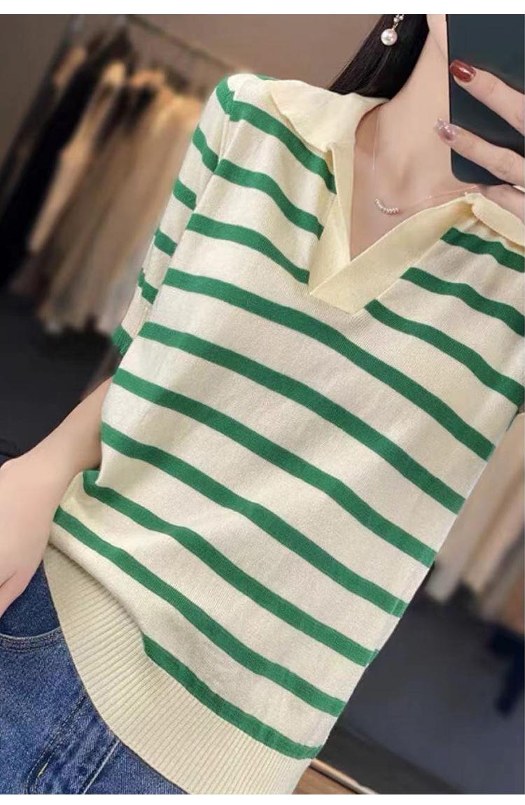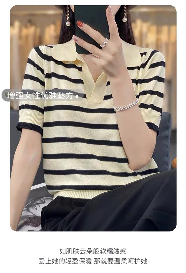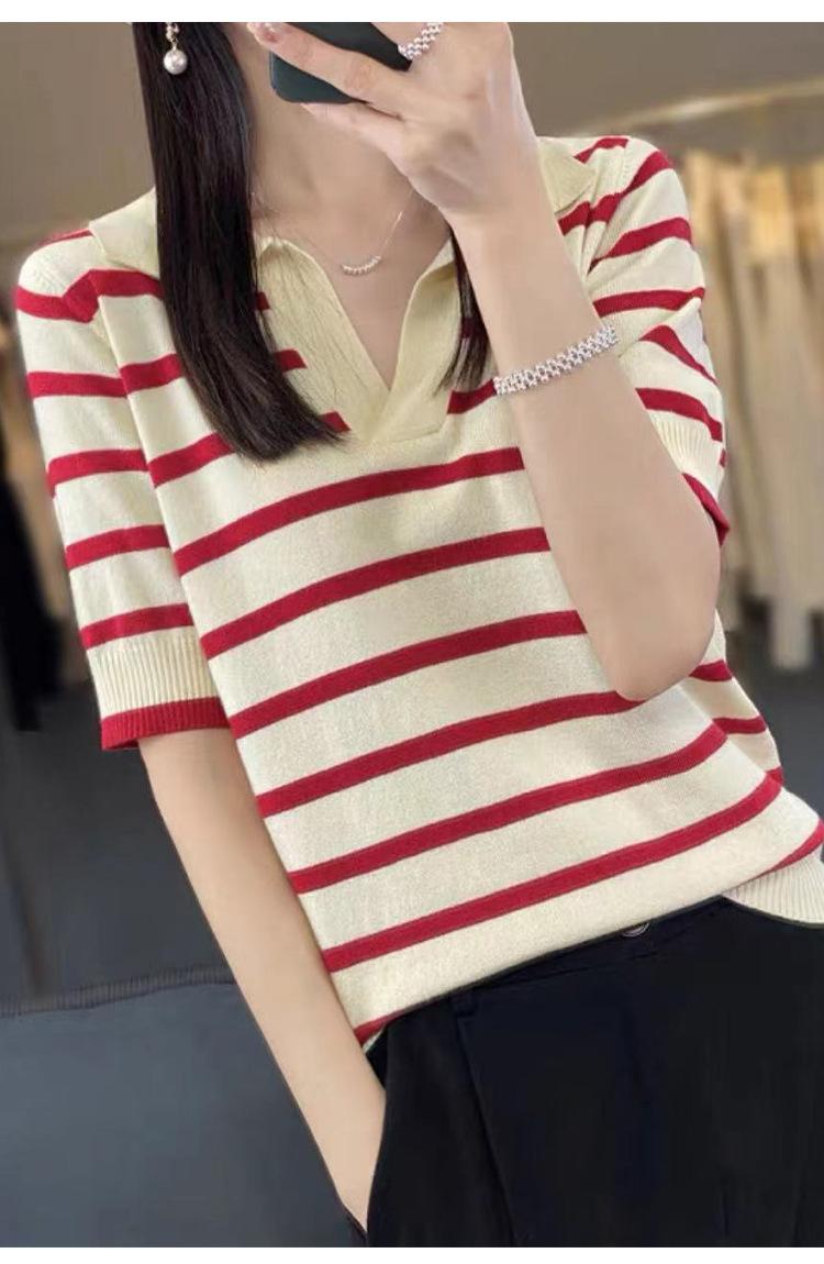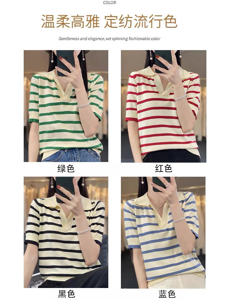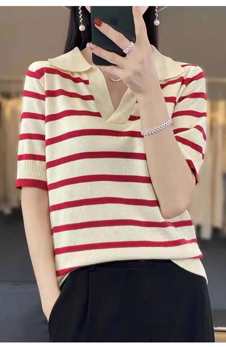 Compra Camisa de Punto de Seda Helada de Verano 2024 con Cuello POLO Delgado, Camiseta de Manga Corta con Rayas de Color en Contraste, Ropa Exterior, Top Elegante para Mujer al por mayor en Joom.pro