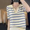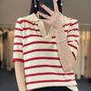 Camisa de Punto de Seda Helada de Verano 2024 con Cuello POLO Delgado, Camiseta de Manga Corta con Rayas de Color en Contraste, Ropa Exterior, Top Elegante para Mujer