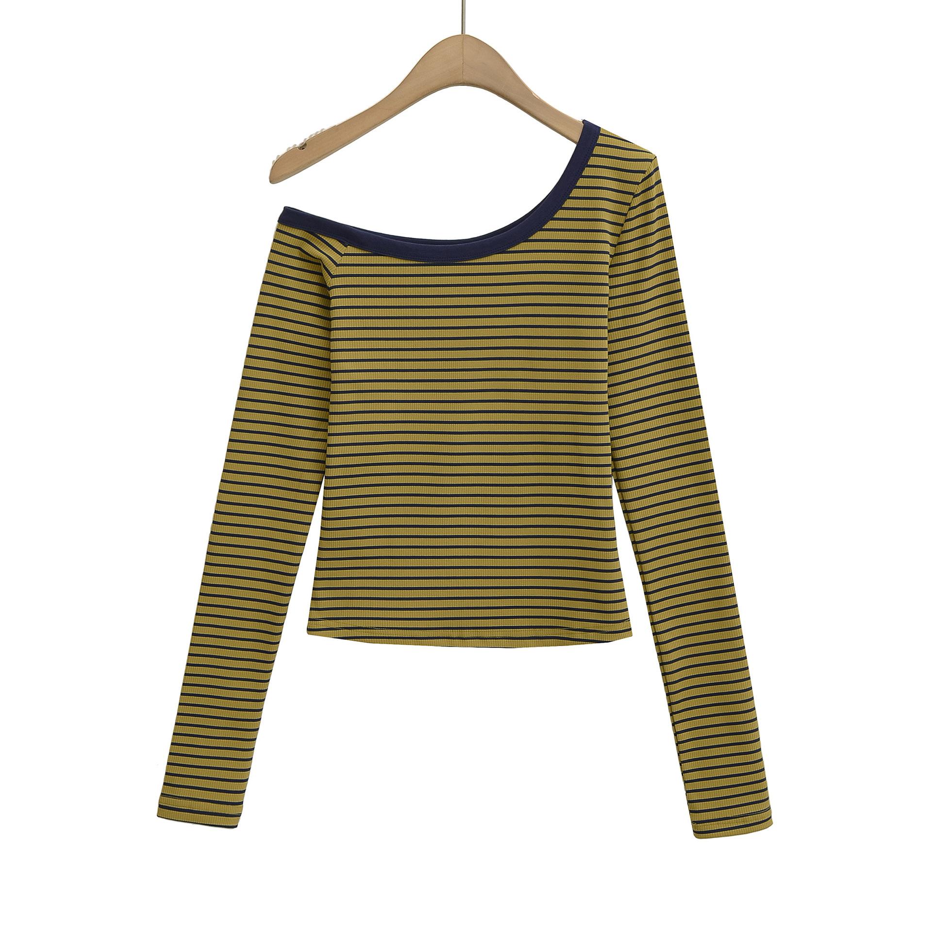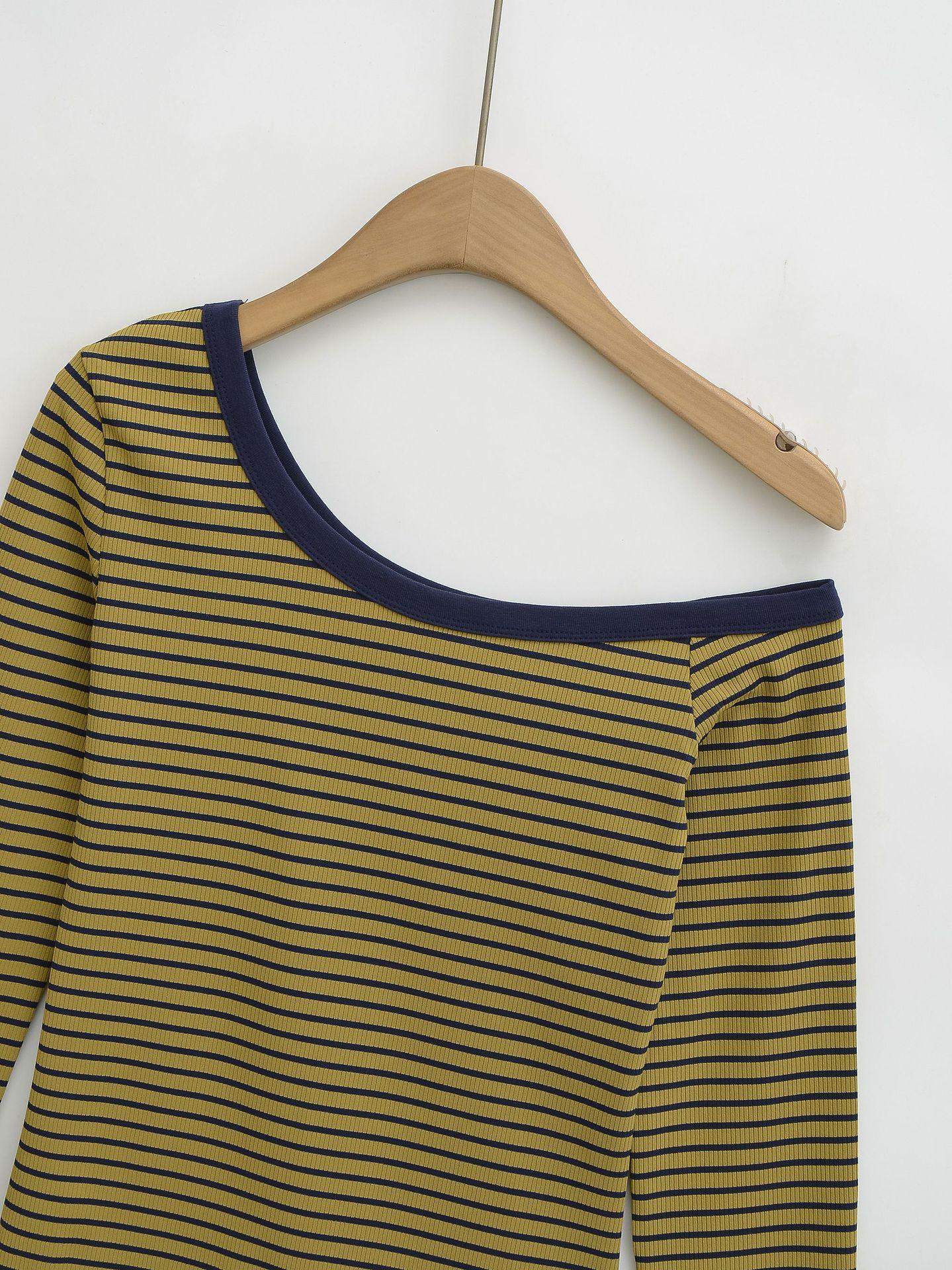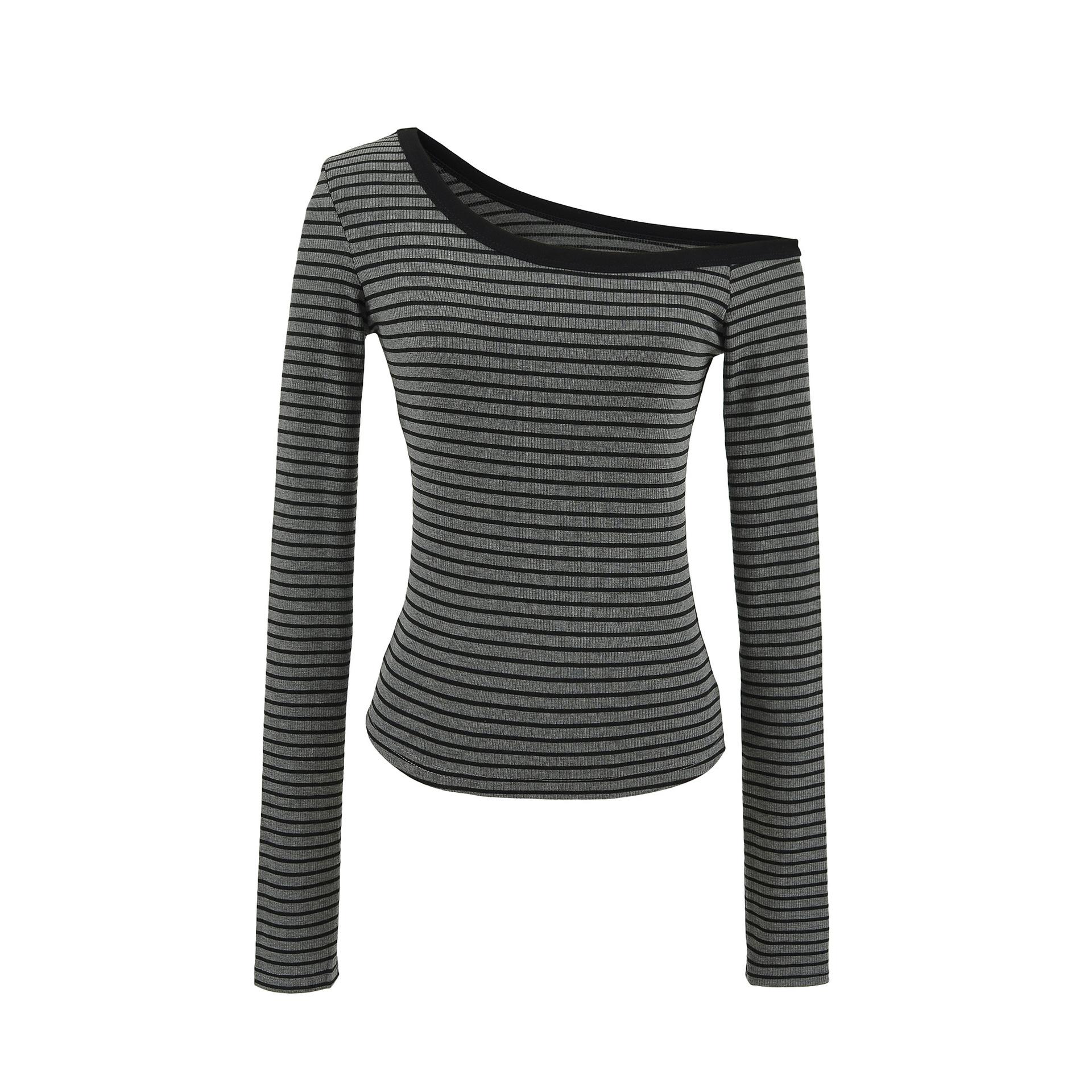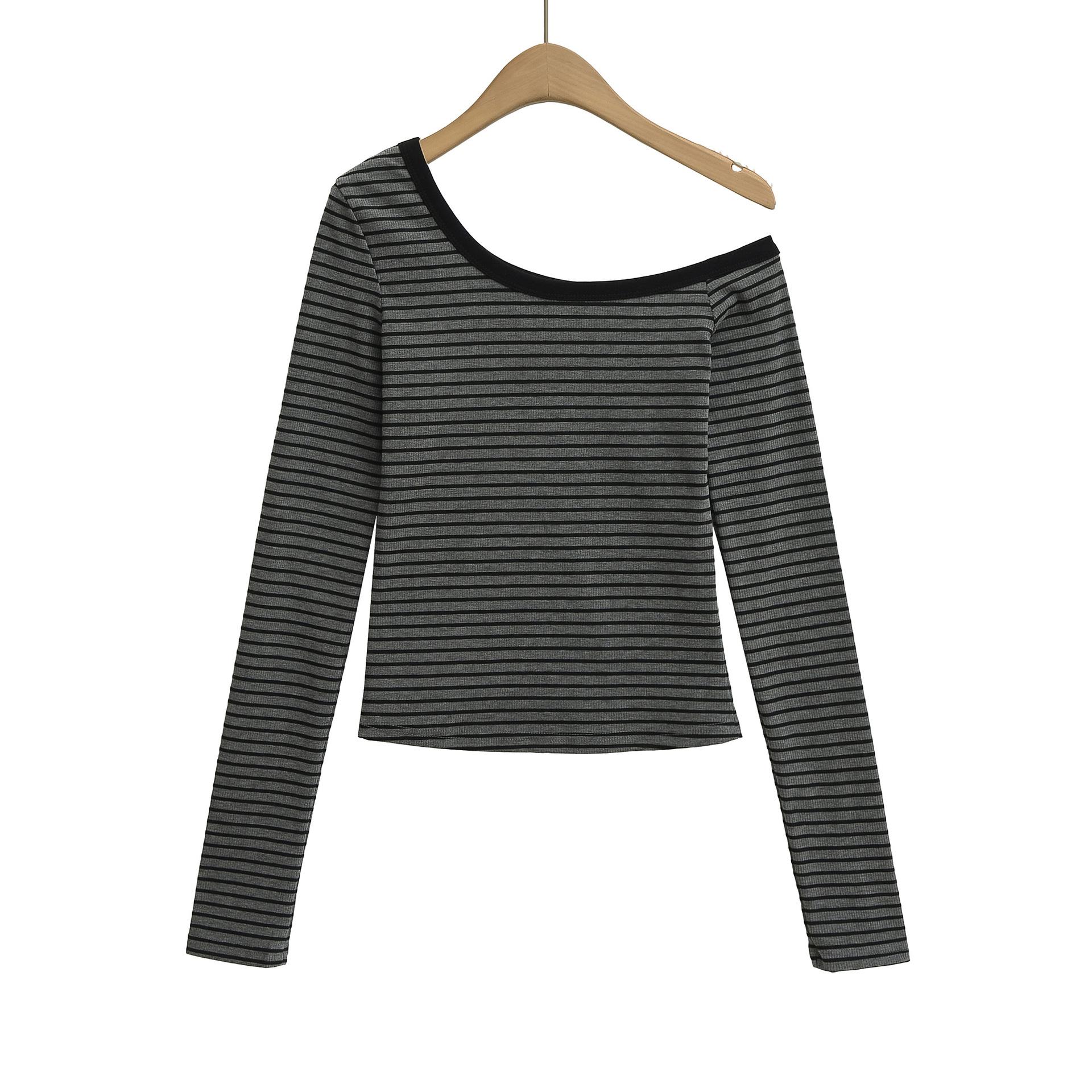 Camiseta Base Corta Sexy para Mujer Primavera 2025 con Hombros Descubiertos Estilo Trendy de Chica Hot a Rayas Asimétrica de Manga Larga