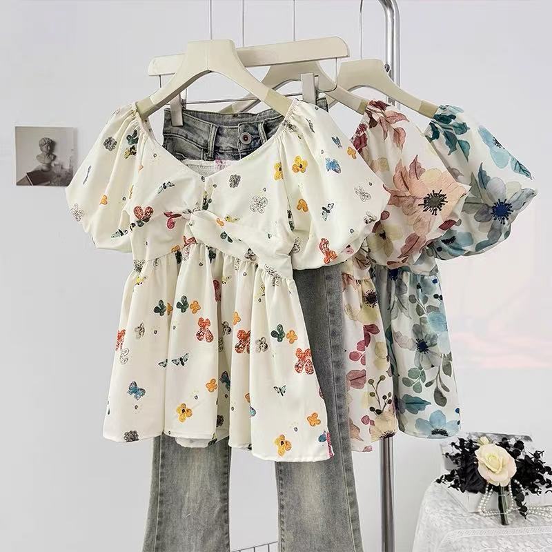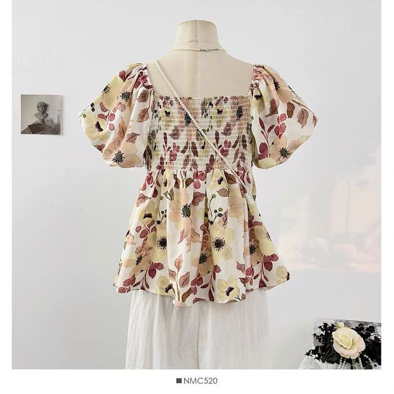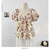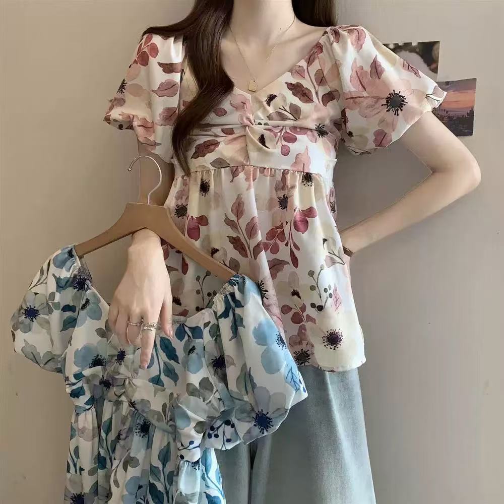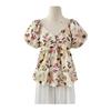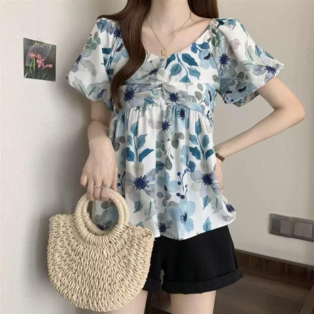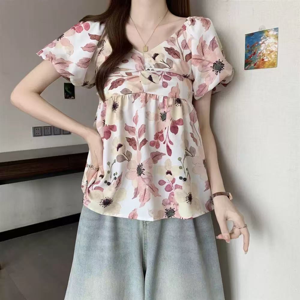 Camisa dulce floral francesa de manga abullonada para mujer, diseño de verano nicho, top de punto holgado adelgazante ins