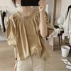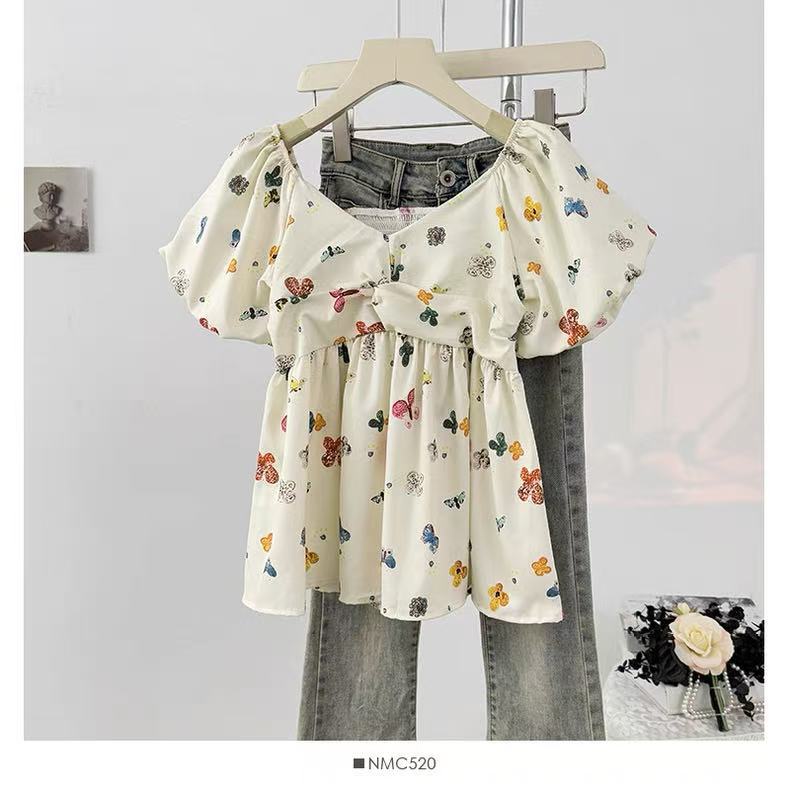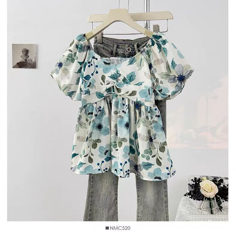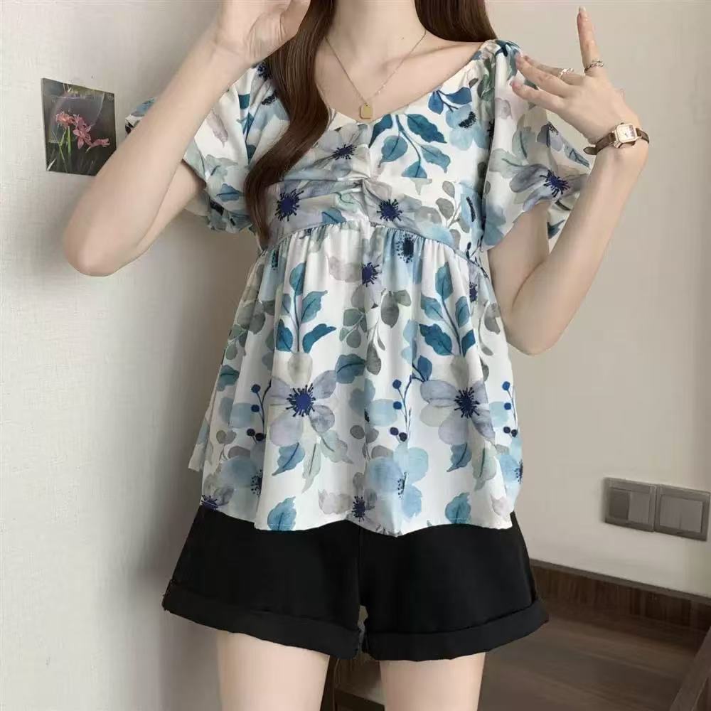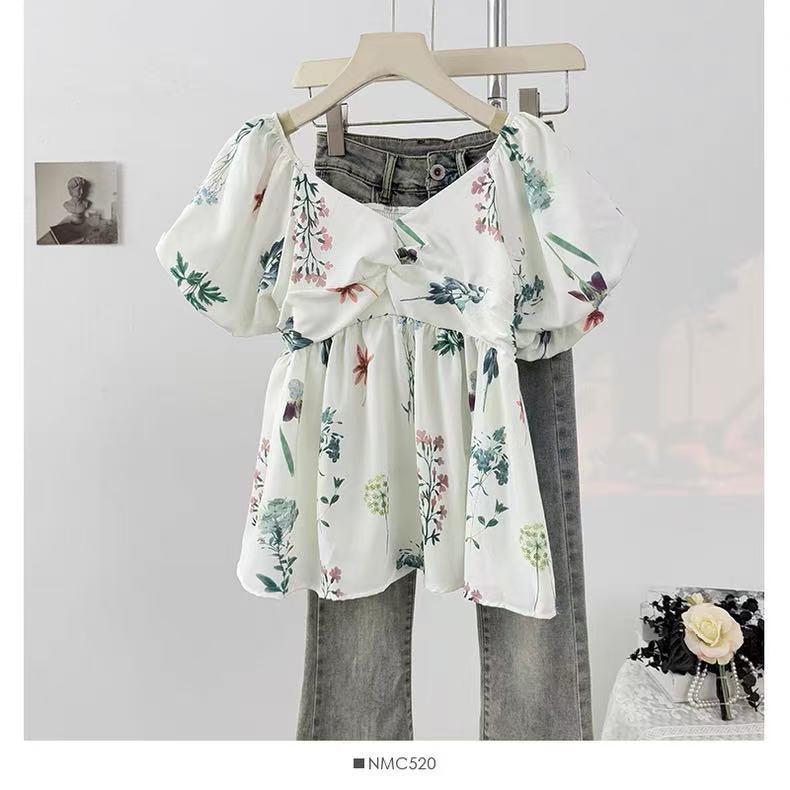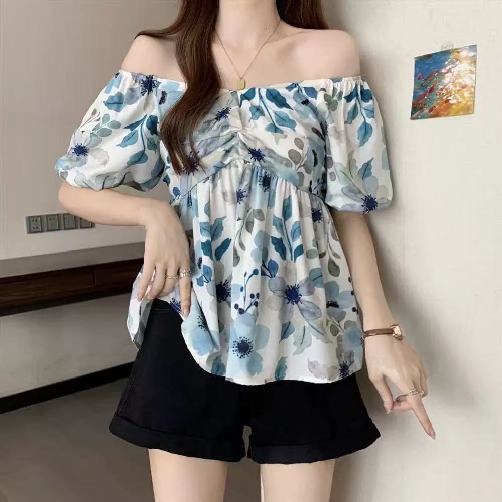 Camisa dulce floral francesa de manga abullonada para mujer, diseño de verano nicho, top de punto holgado adelgazante ins