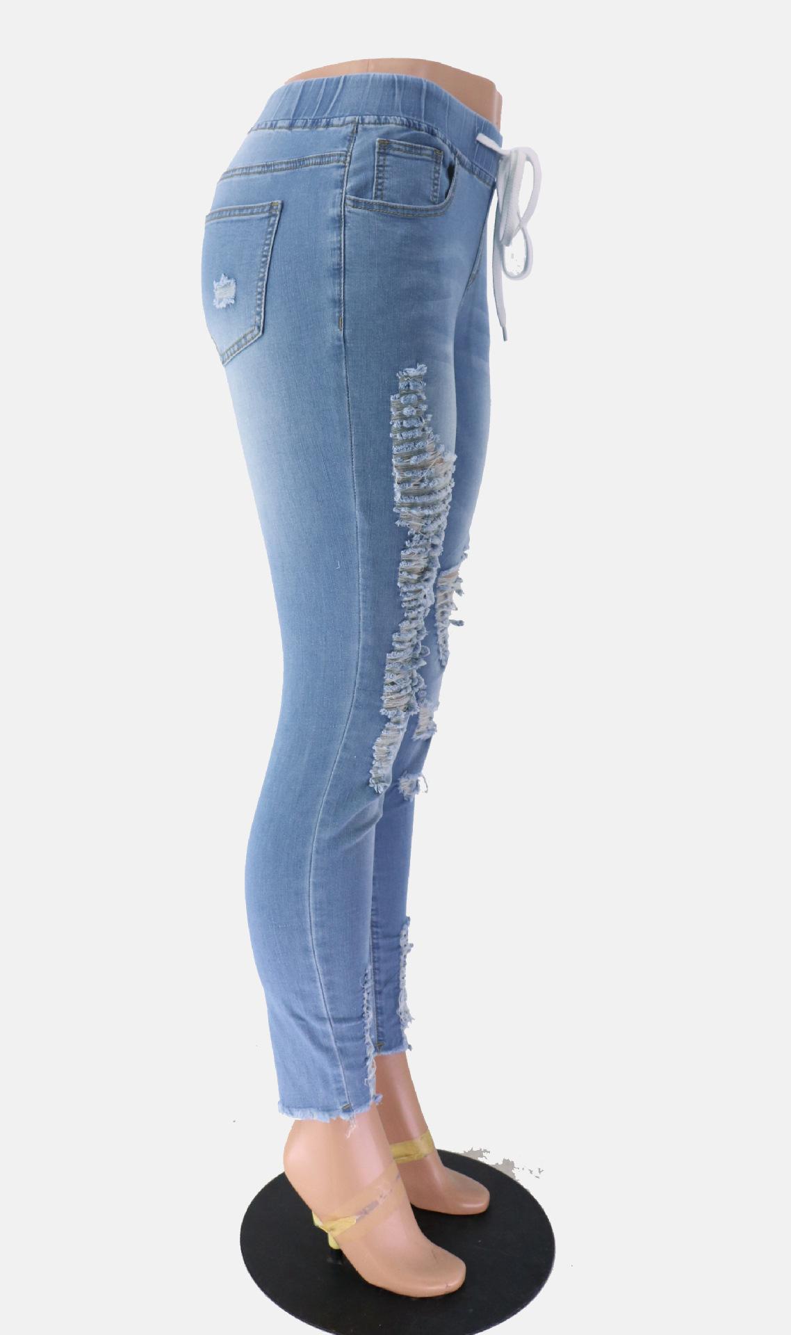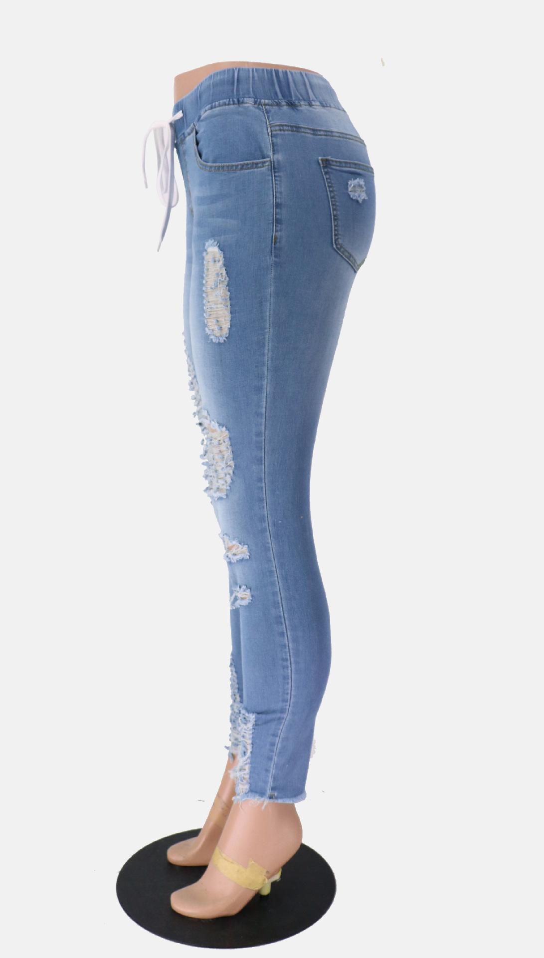 2024 Jeans de Mujer Europeos y Americanos de Primavera Transfronterizos Cintura Elástica Tiro Alto Rotos Ajustados Adelgazantes Pierna Pequeña Pantalones con Cordones