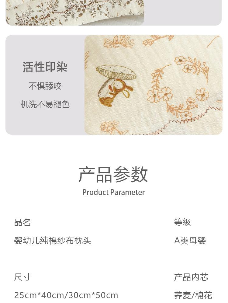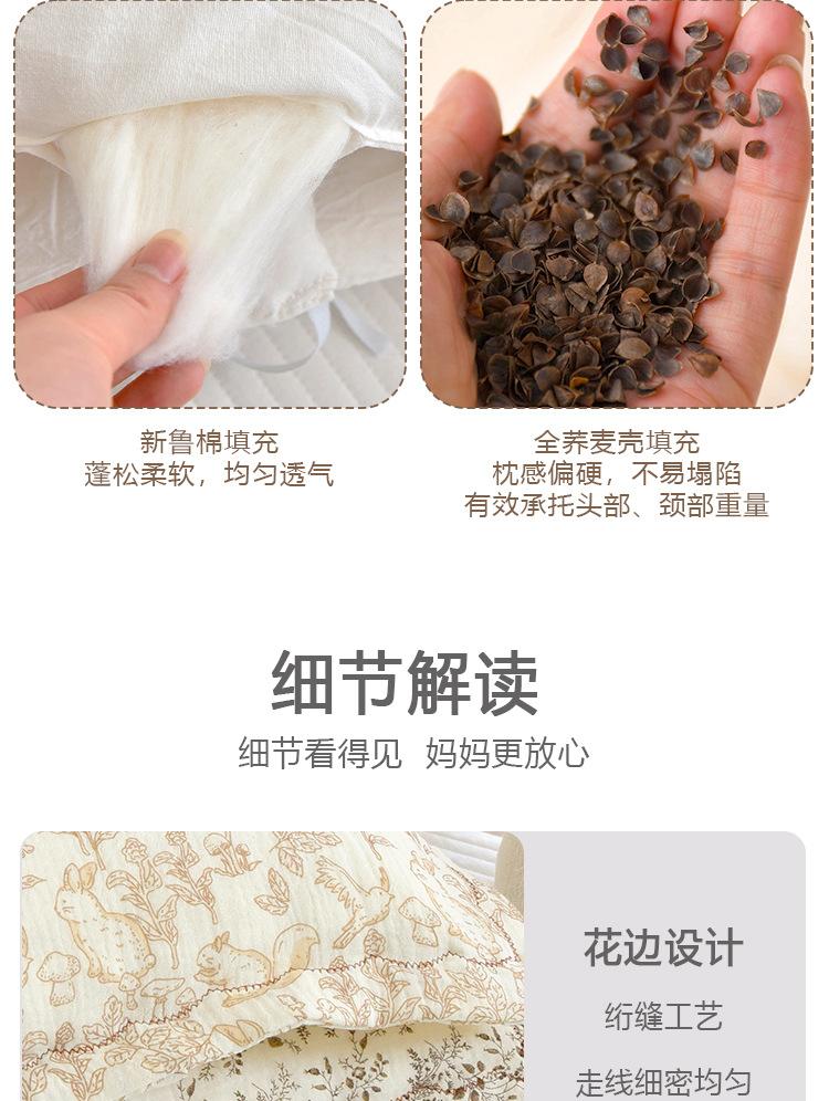 Material: Funda de almohada 100% algodón Núcleo de almohada relleno estilo trigo sarraceno 100% cáscaras de trigo sarraceno Relleno estilo algodón 100% algodón nuevo de Xinjiang Tamaño: 25*40cm, 30*50cm Edad adecuada: el tipo de algodón es adecuado para bebés mayores de 3 meses. Tipo de trigo sarraceno adecuado para bebés mayores de 6 meses Recomendaciones de lavado: La funda de almohada es removible y se puede lavar a mano con agua tibia a menos de 30°C Colgar para secar, no enjuagar, se puede planchar, no apto para exposición al sol. (El núcleo de la almohada no se puede lavar, pero se puede secar con regularidad) El patrón y la dirección del corte son aleatorios, así que tenga cuidado si le importa. Medición plana manual, el error de 1-3 cm es normal~