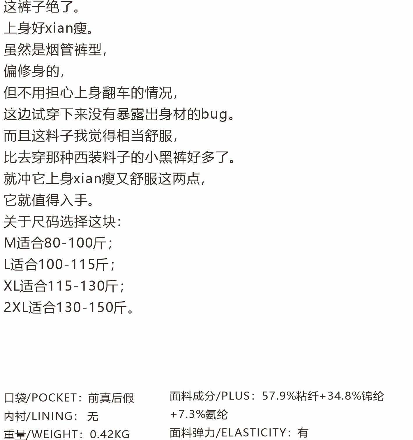 | tamaño | cintura | Caderas | Longitud del archivo | hermético | becerro | dobladillo del pantalón | largo de los pantalones | Uso diario |