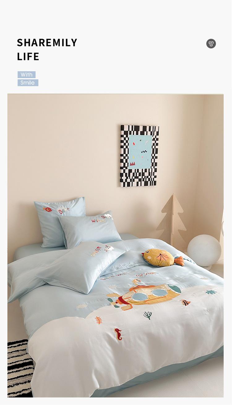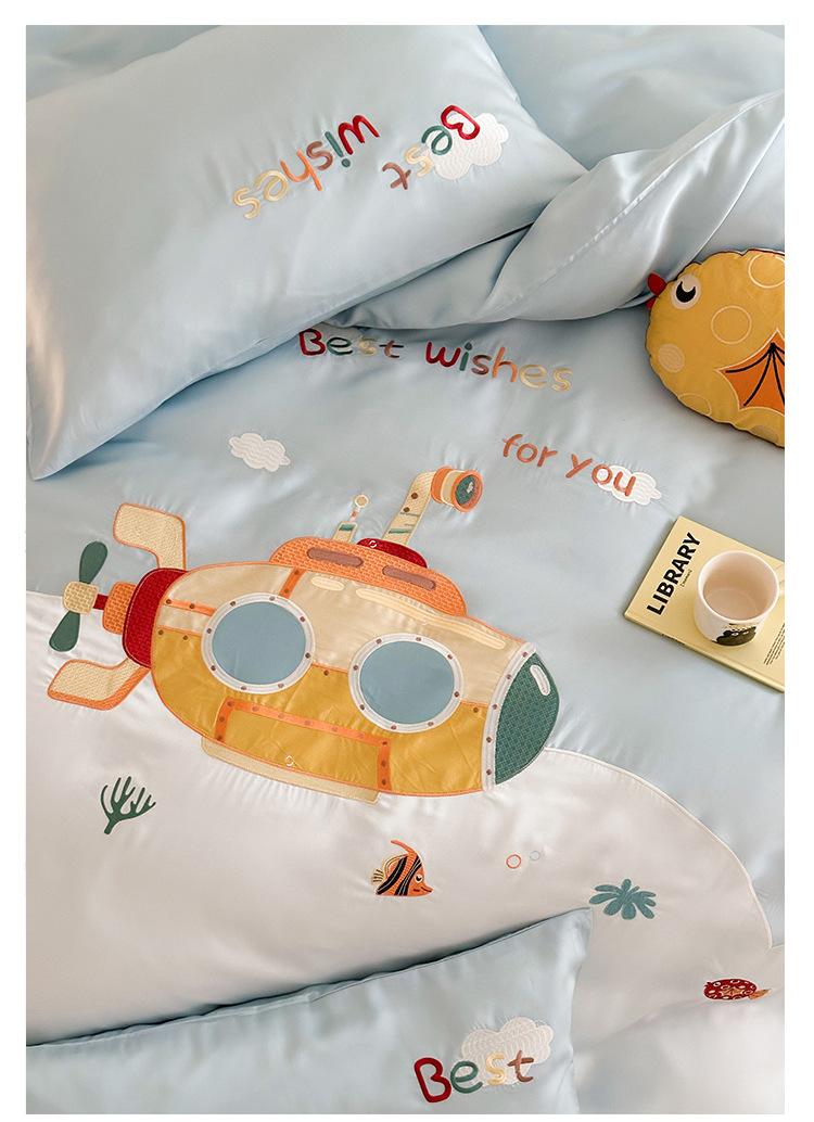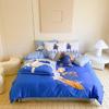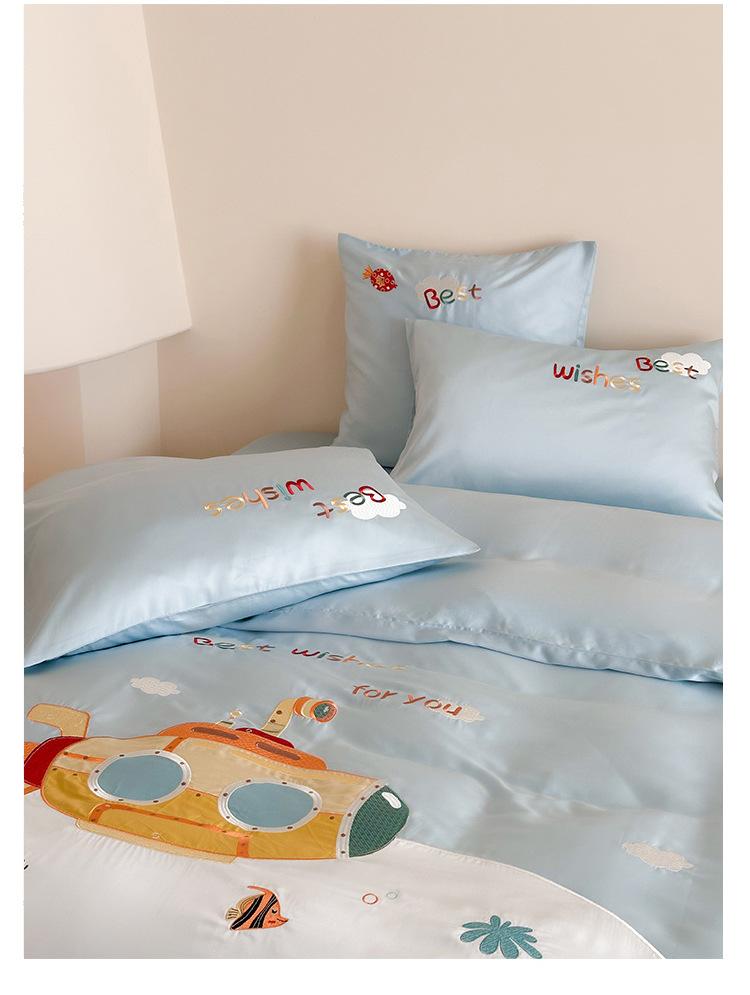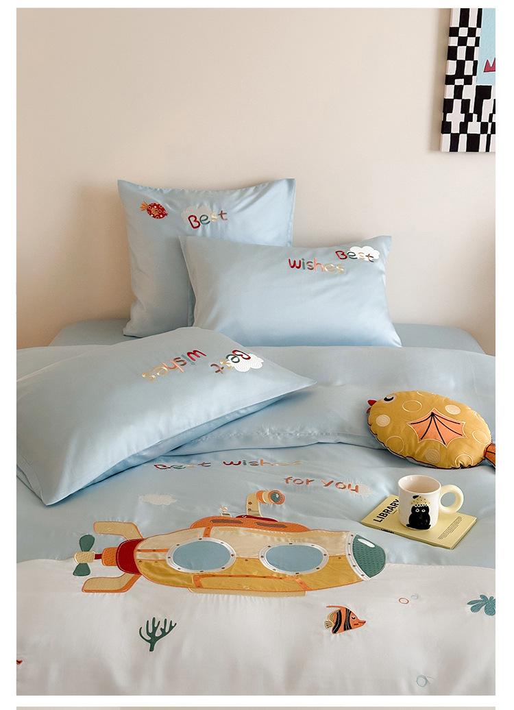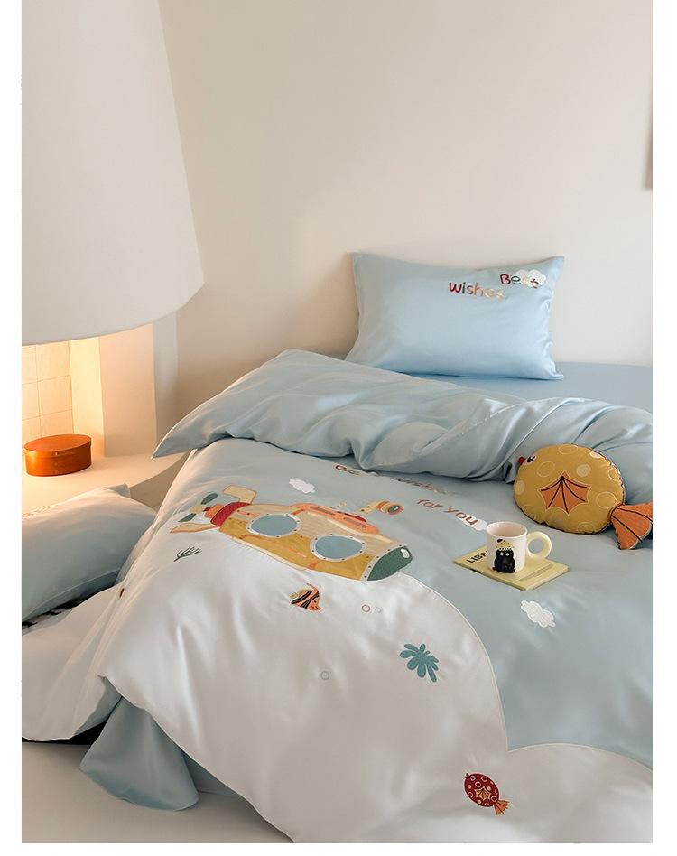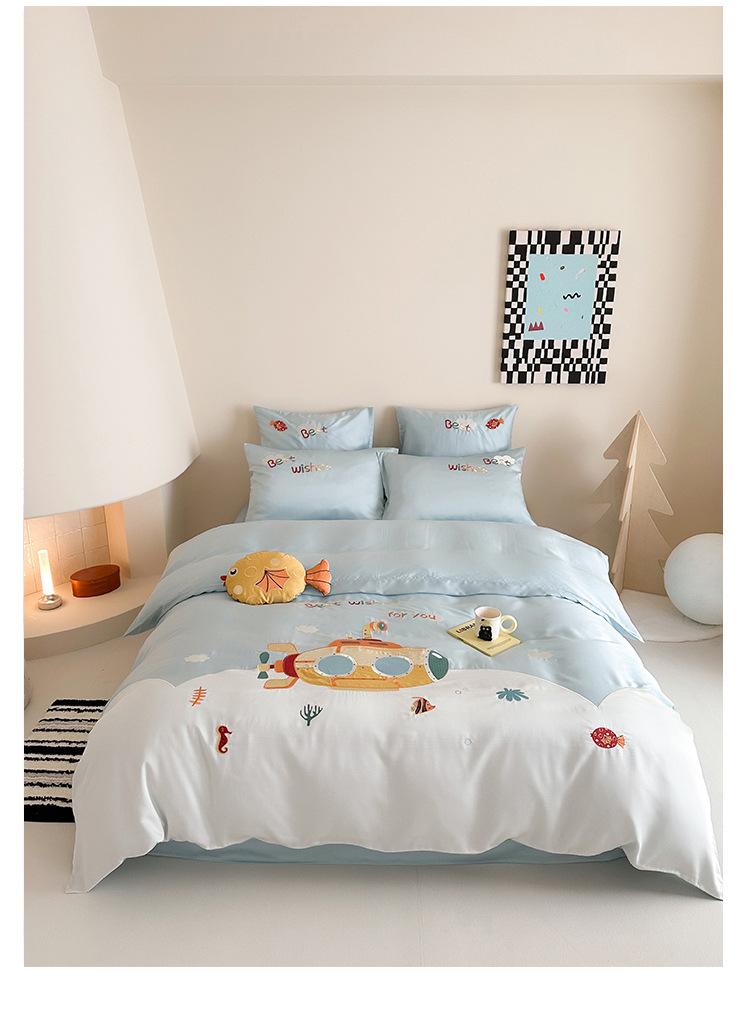 Juego de cuatro piezas de algodón para niños estilo caricatura Bordado Mundo Submarino Algodón Puro Lindo Funda Nórdica Ropa de Cama 1.2 Azul
