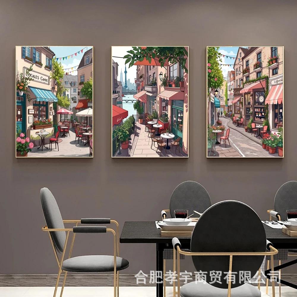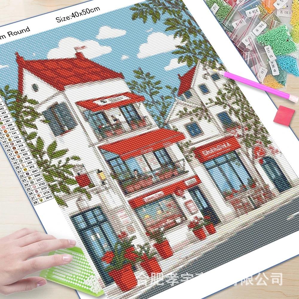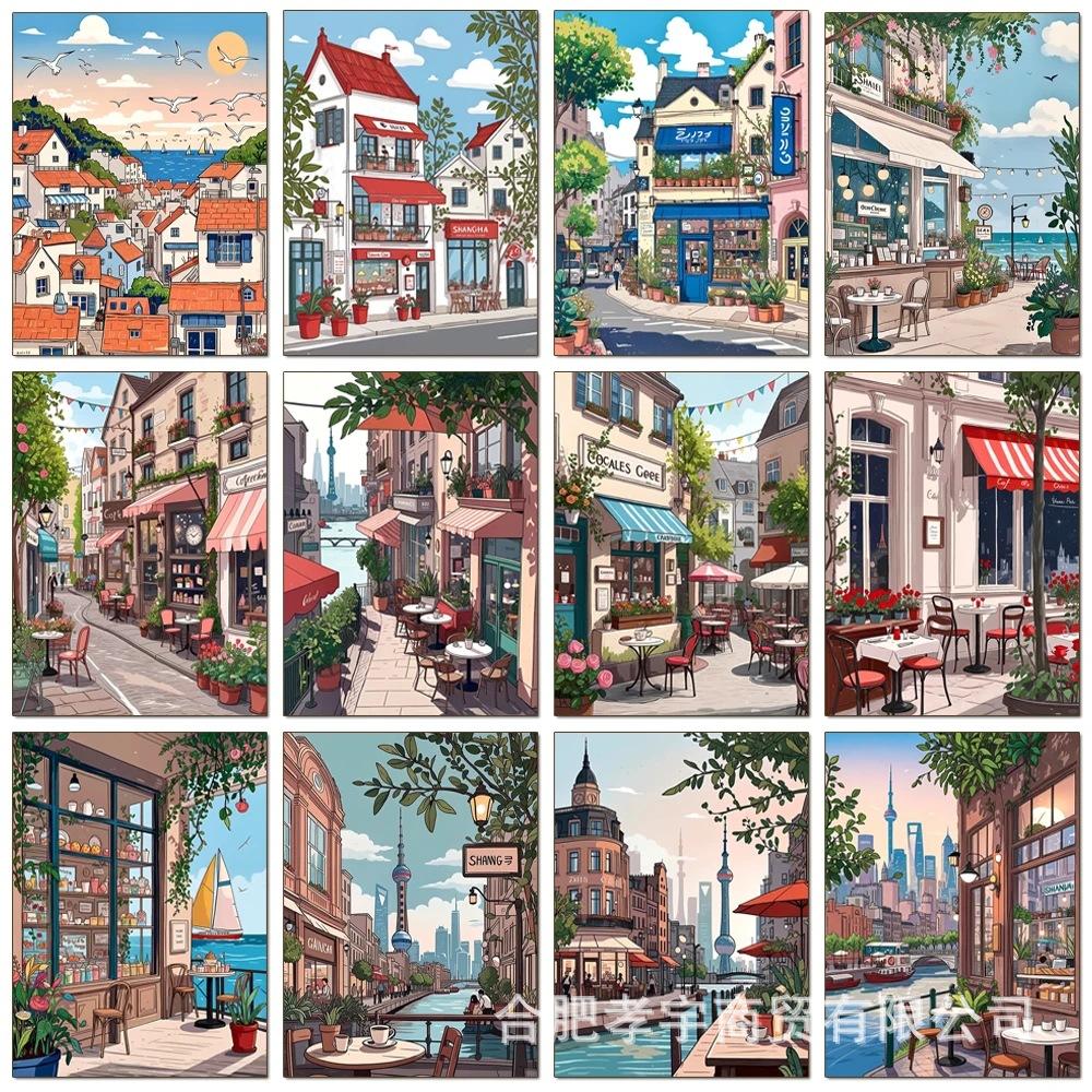 Más Vendido Transfronterizo DIY Escenario de Ciudad de Dibujos Animados Serie de Edificios de Cafetería Diamante Completo Pegatinas de Decoración de Restaurante Pintura de Diamantes