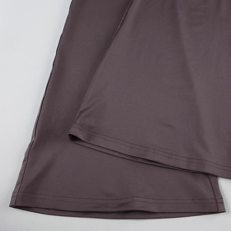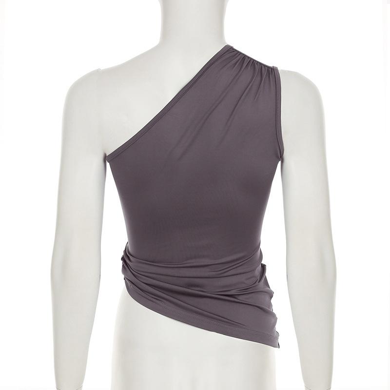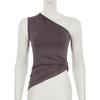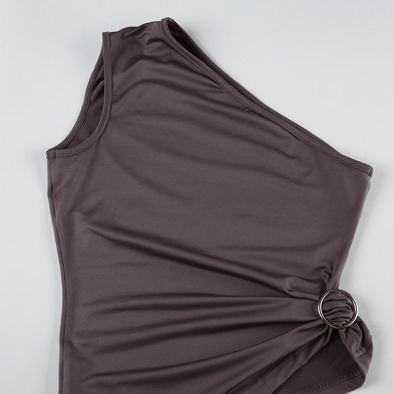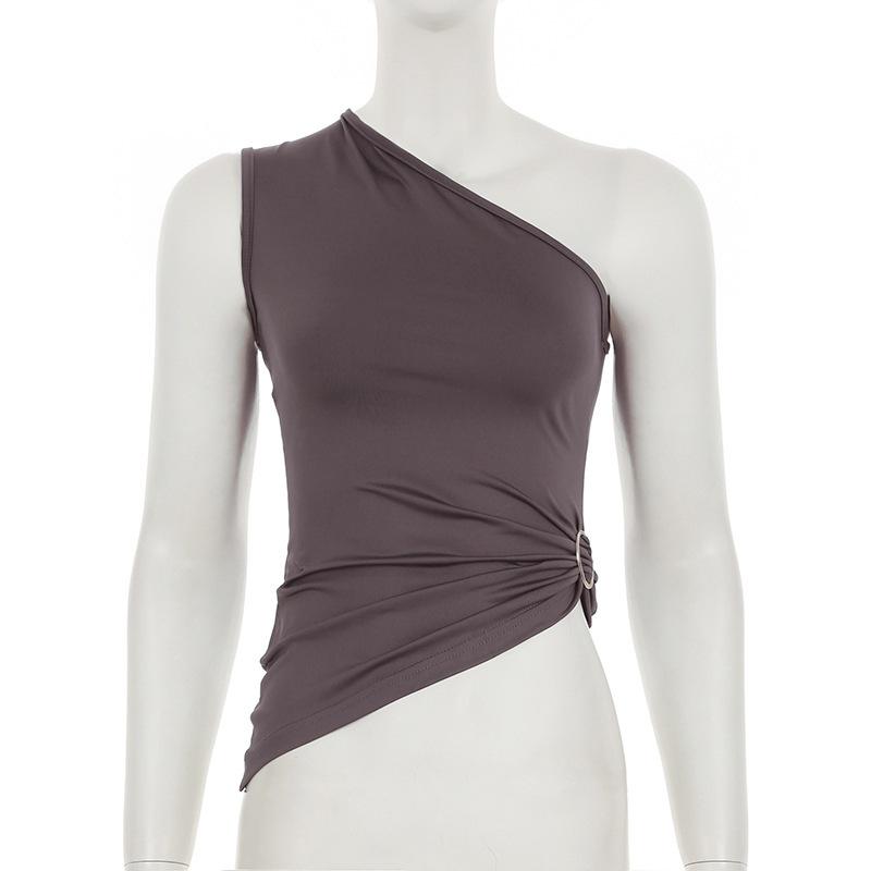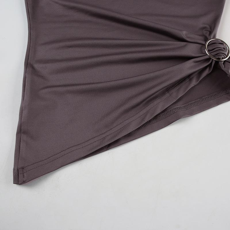 2025 Primavera/Verano Nuevo Estilo Casual Urbano Escote Asimétrico Un Hombro Anillo Metálico Chaleco Fruncido Set de Pantalones Largos Micro Acampanados