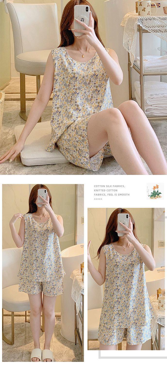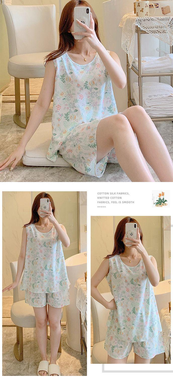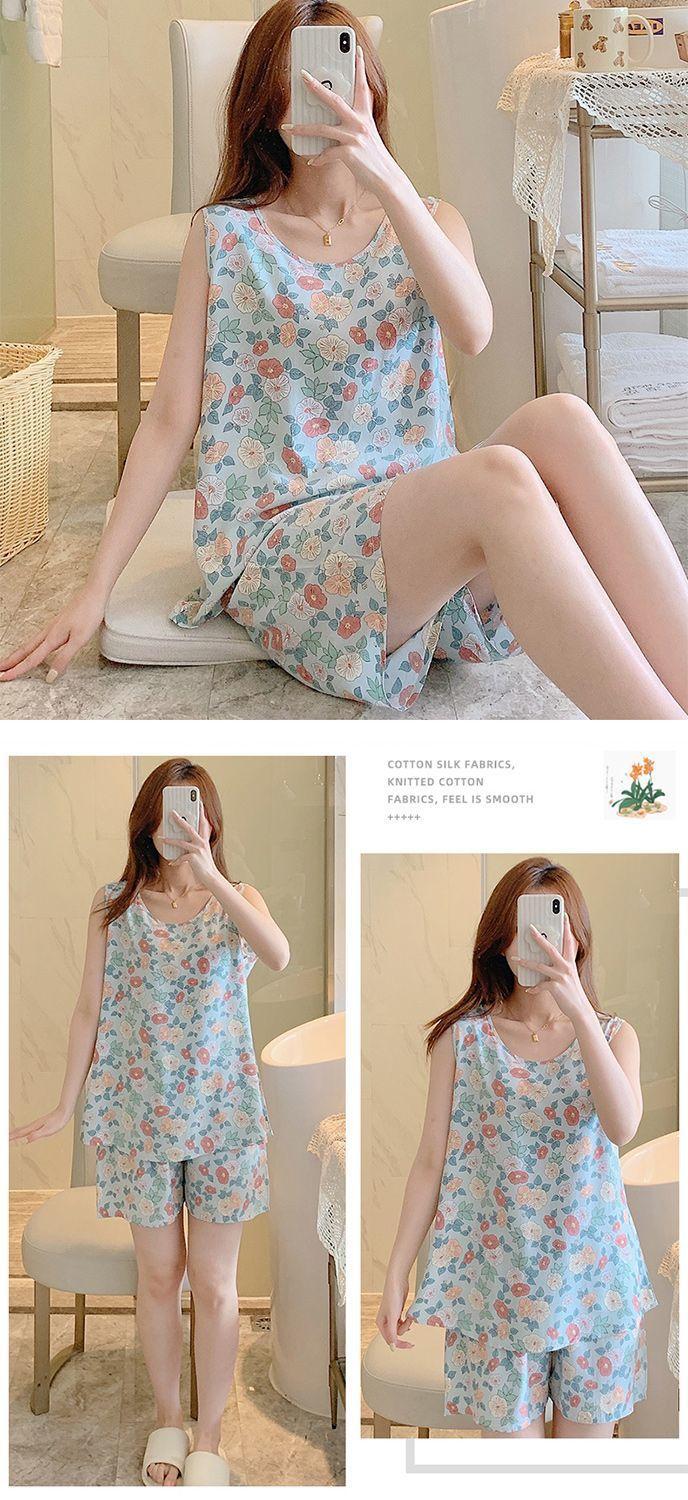 Pijamas de Algodón Seda de Verano para Mujer Chaleco de Verano sin Mangas Conjunto de Dos Piezas Algodón Seda Algodón Artificial para Mujer Talla Grande Traje de Verano
