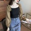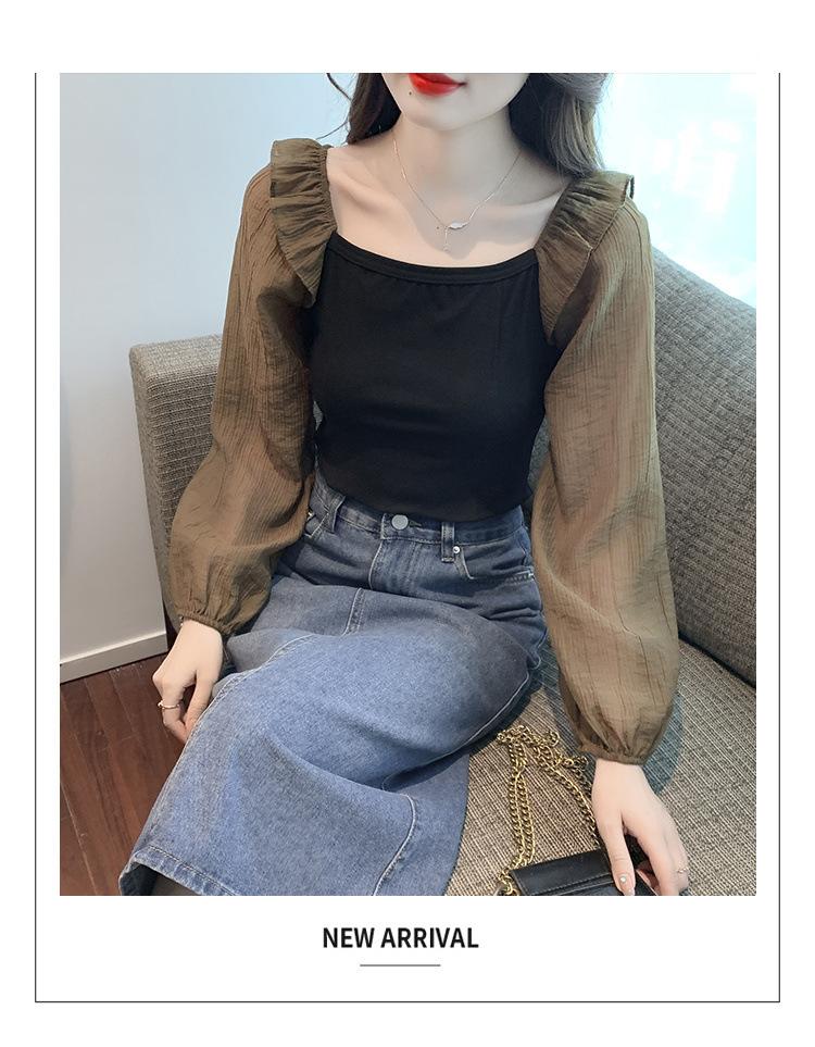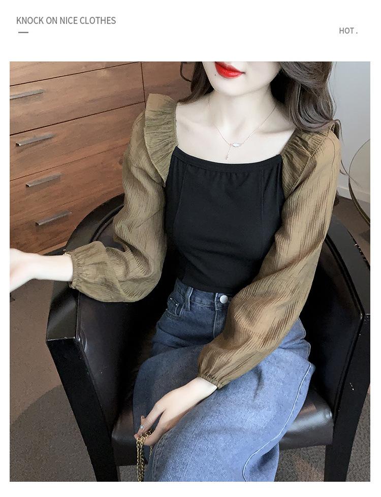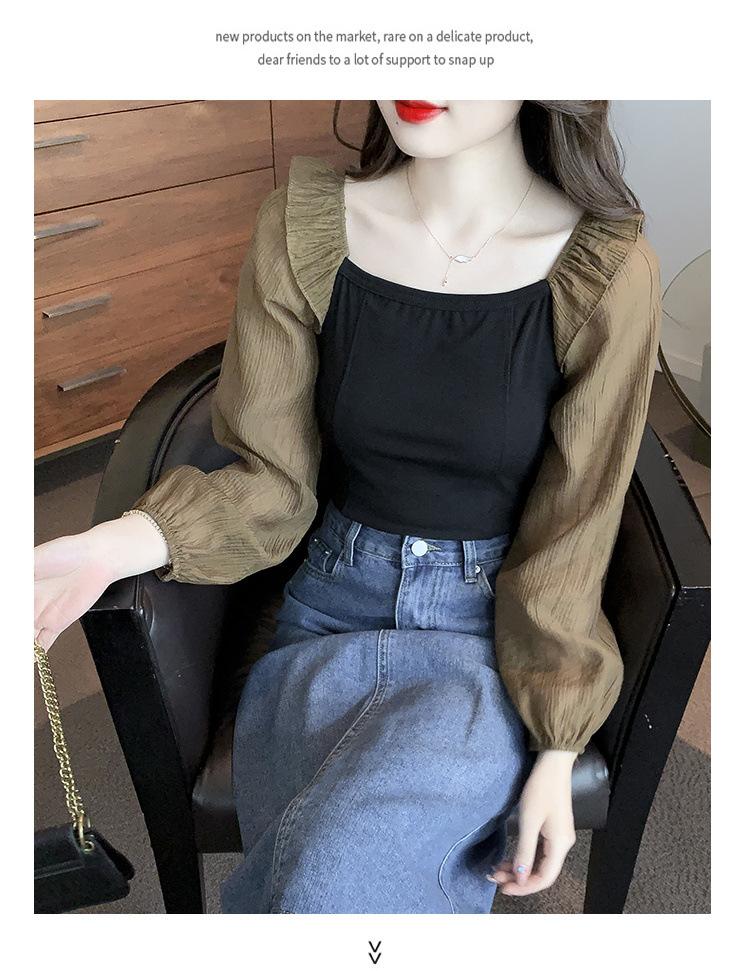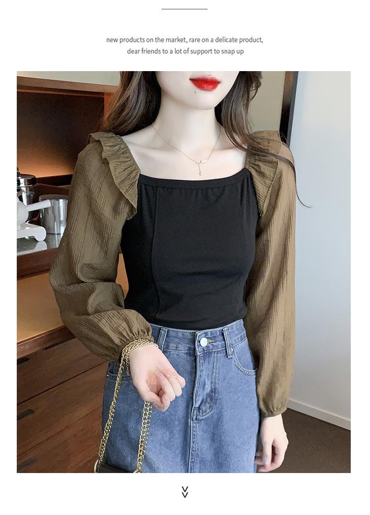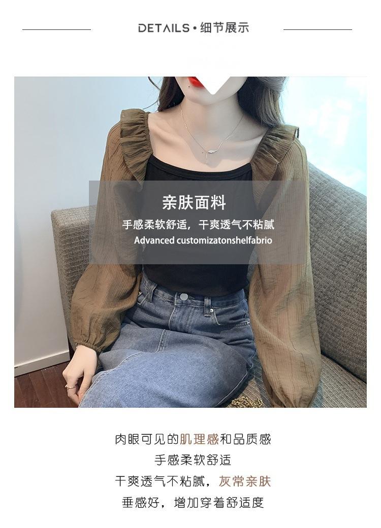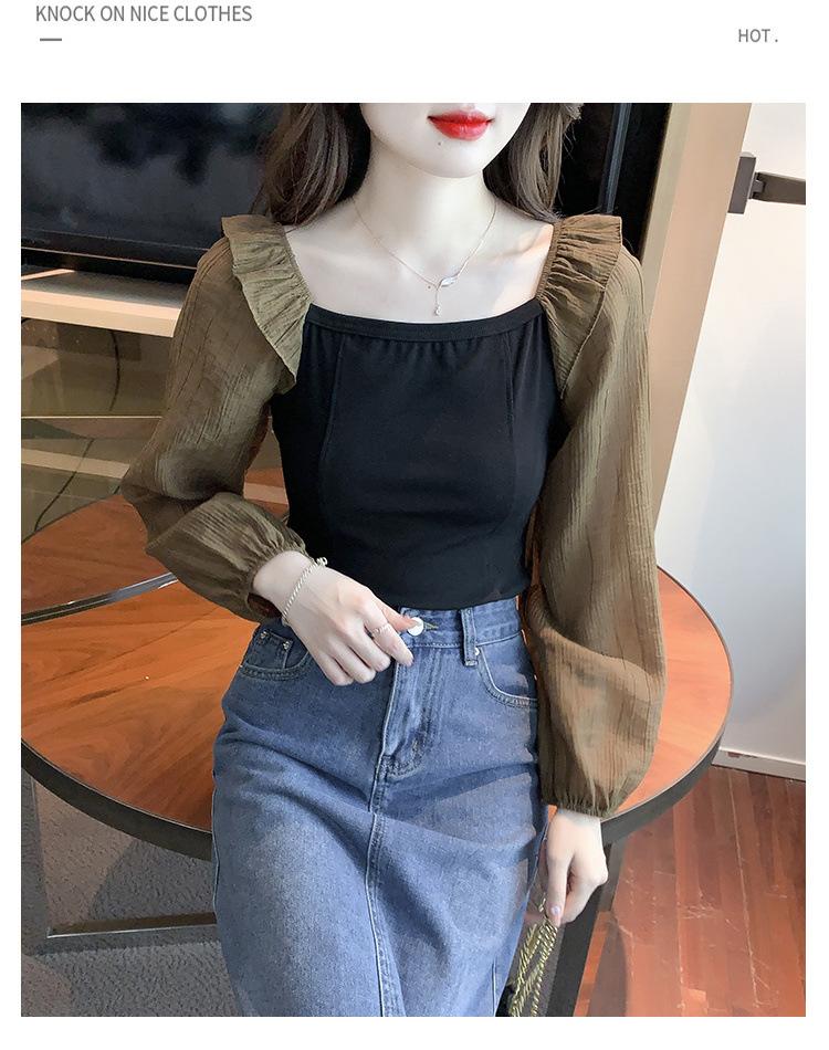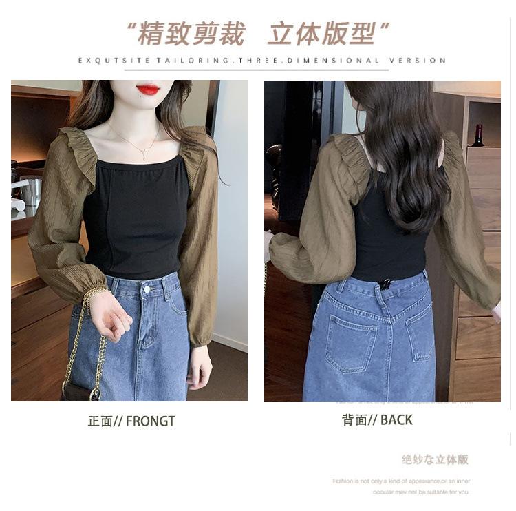 Playera de Manga Larga con Volantes y Cuello Cuadrado Francés para Mujer 2025 Estilo Otoñal Diseño de Temperamento Nicho Chic Top Corto