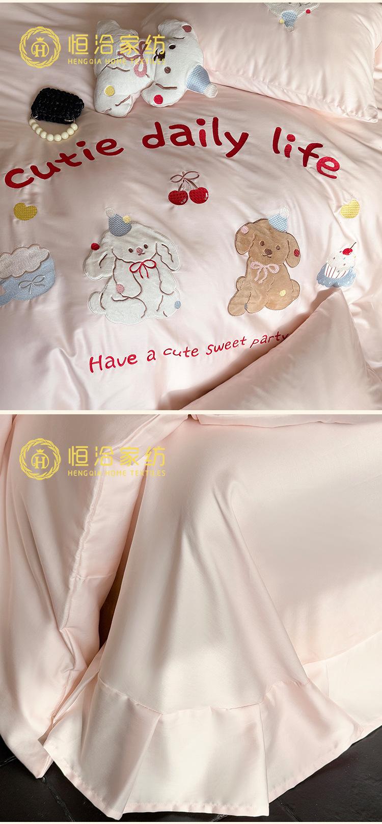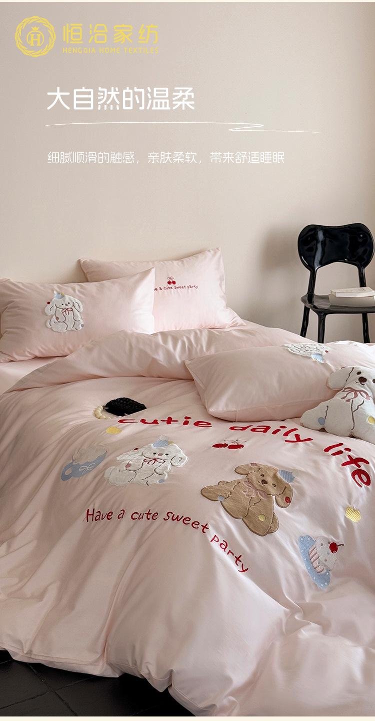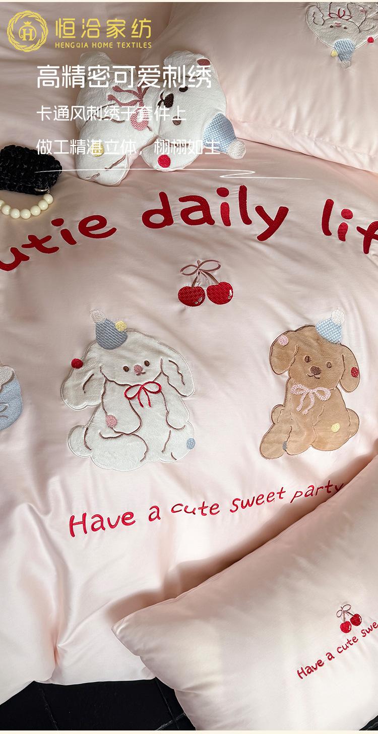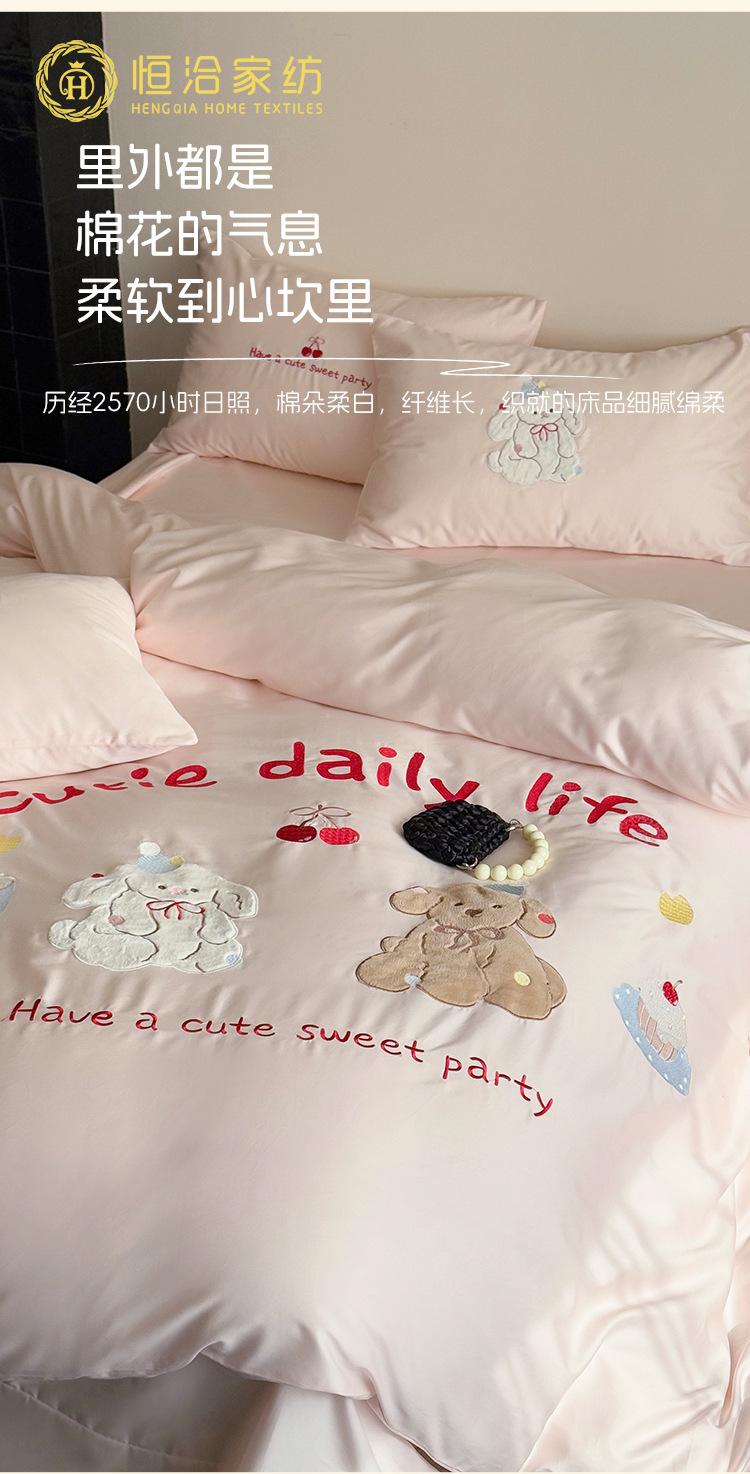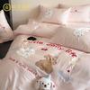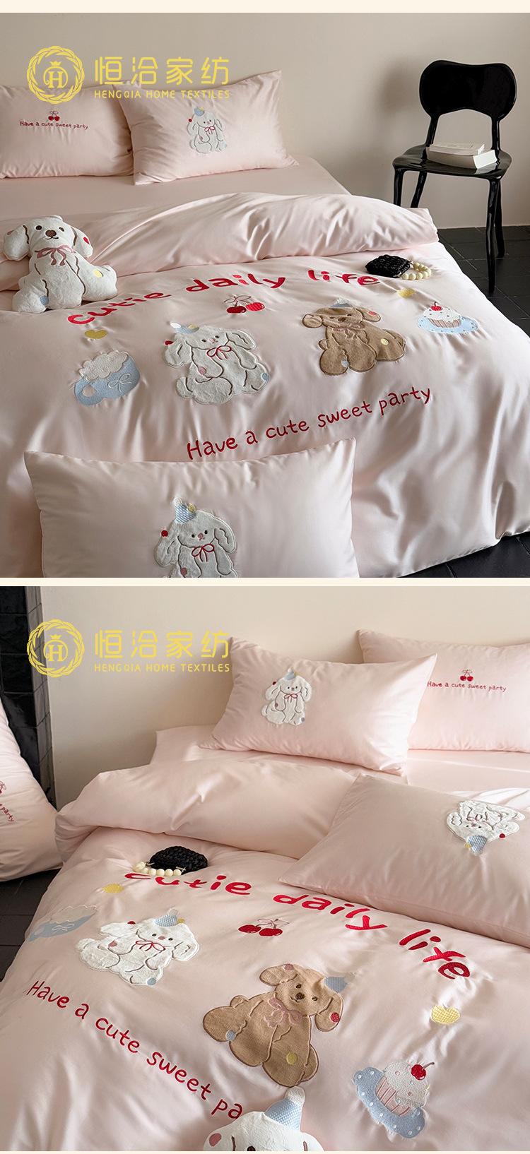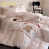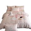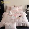 Juego de cuatro piezas de algodón de fibra larga de alto conteo estilo caricatura Algodón puro Lindo bordado Rosa Funda de edredón Ropa de cama para niños
