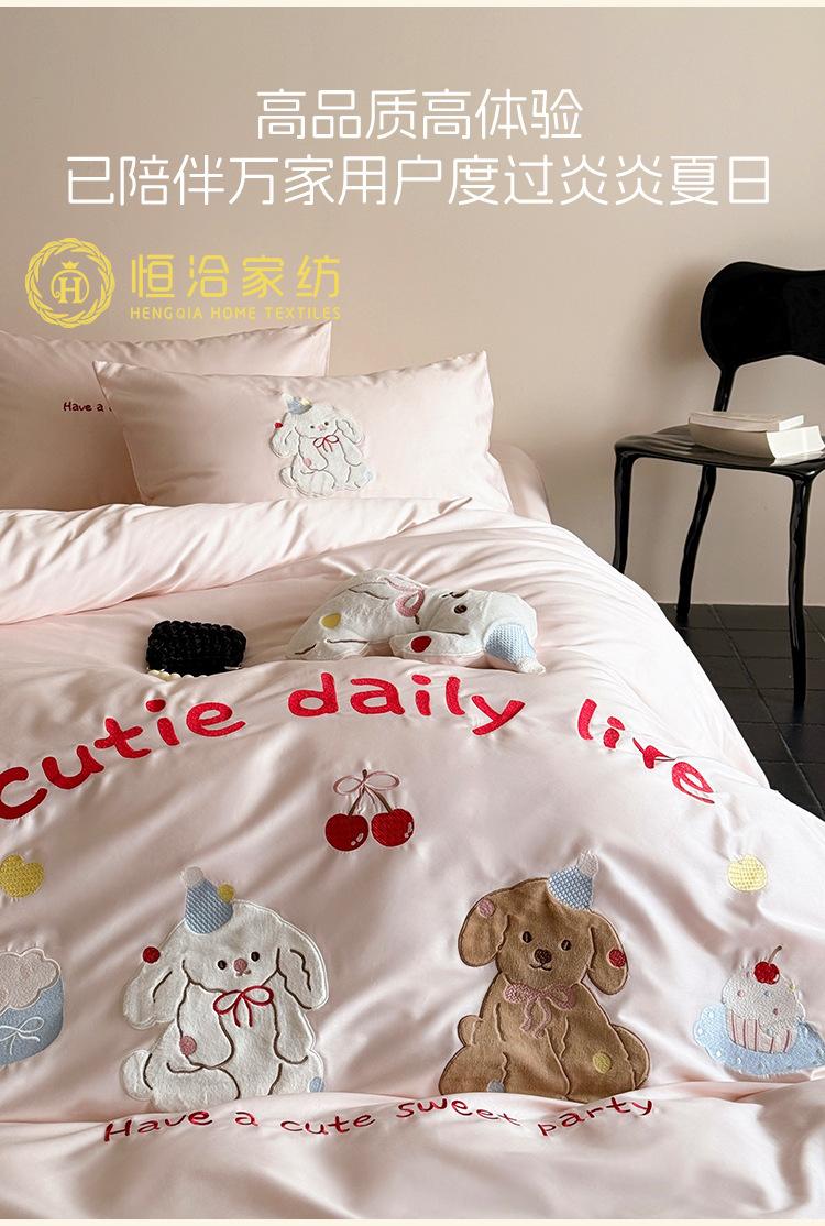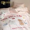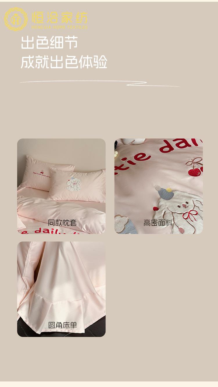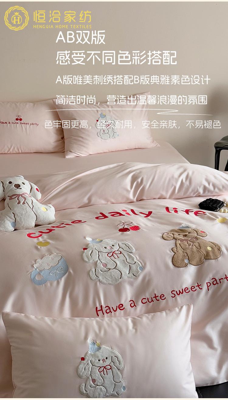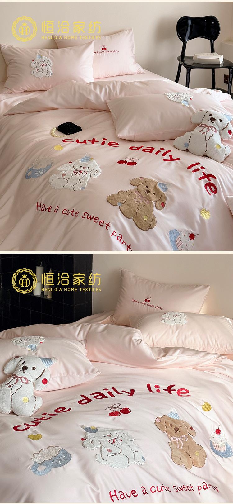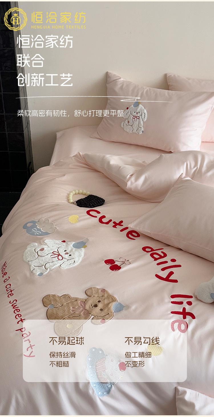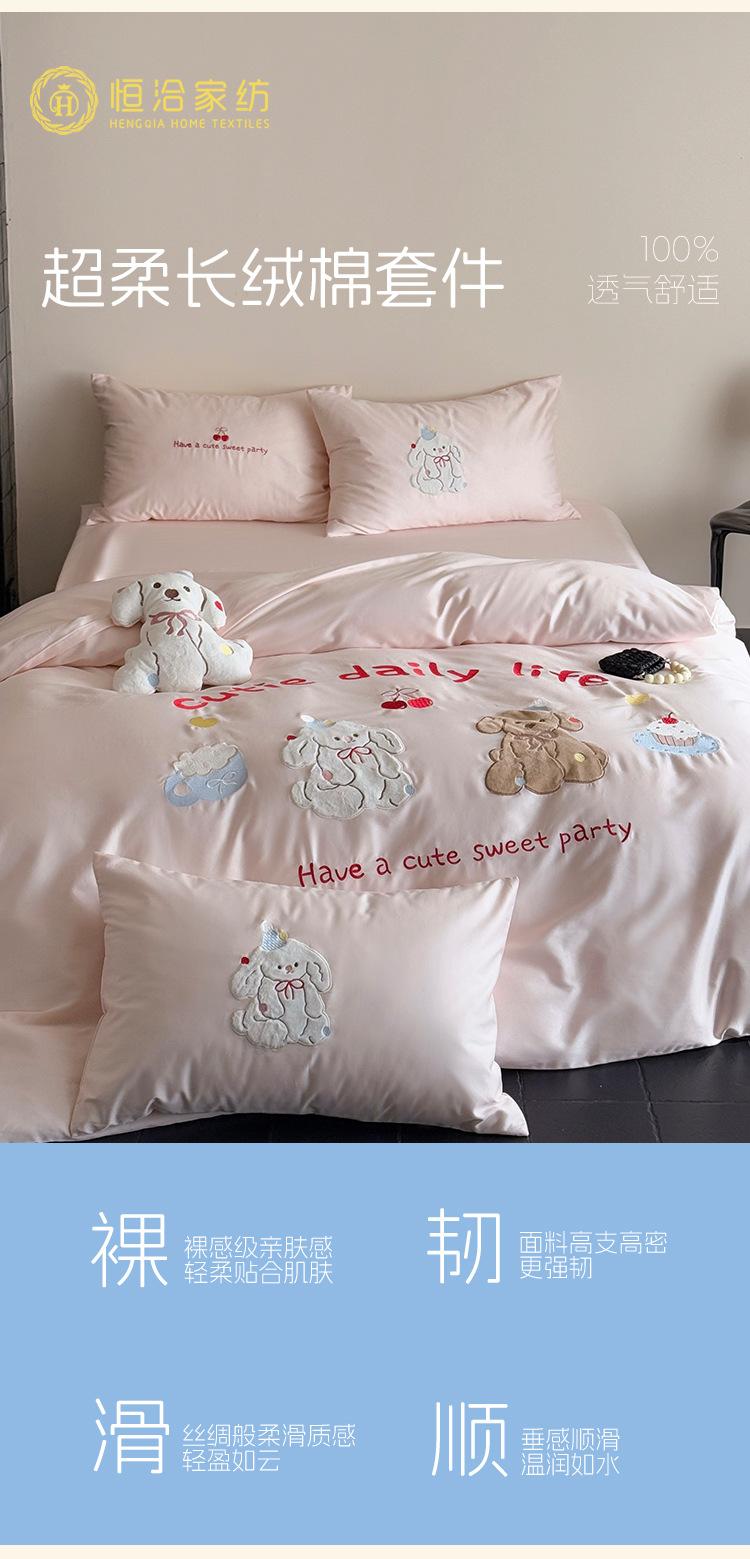 Juego de cuatro piezas de algodón de fibra larga de alto conteo estilo caricatura Algodón puro Lindo bordado Rosa Funda de edredón Ropa de cama para niños