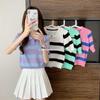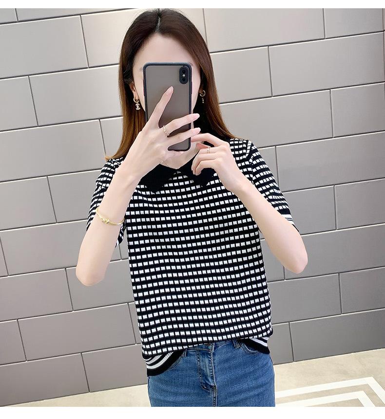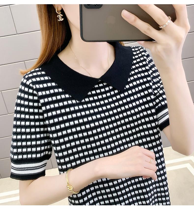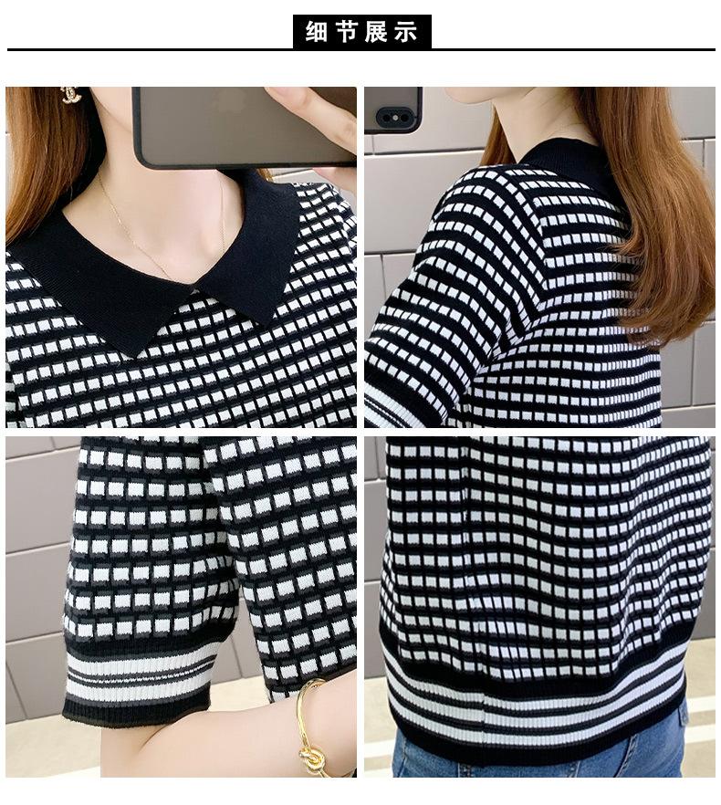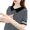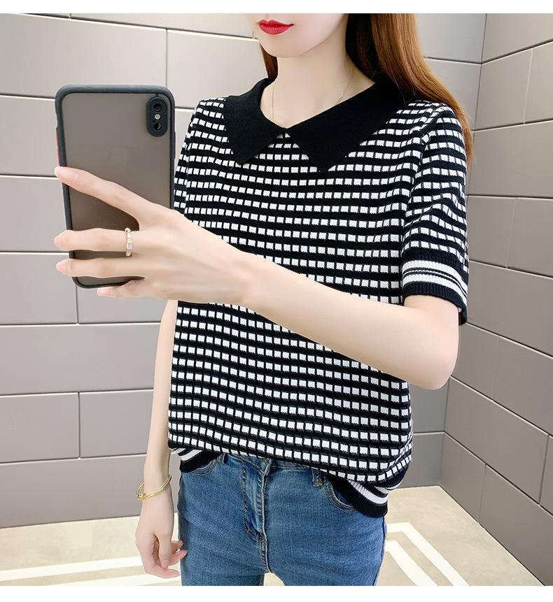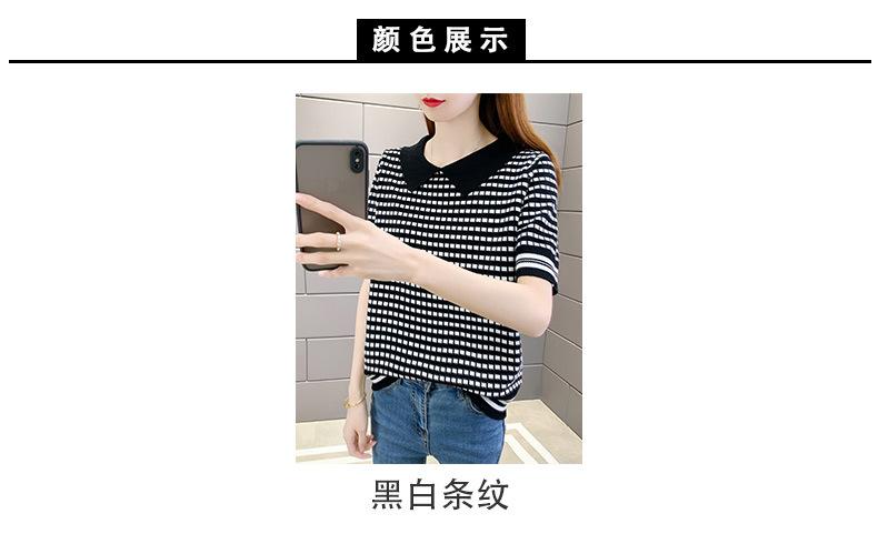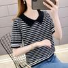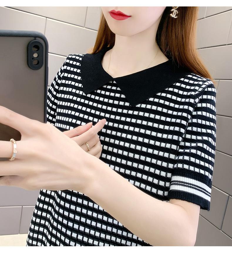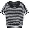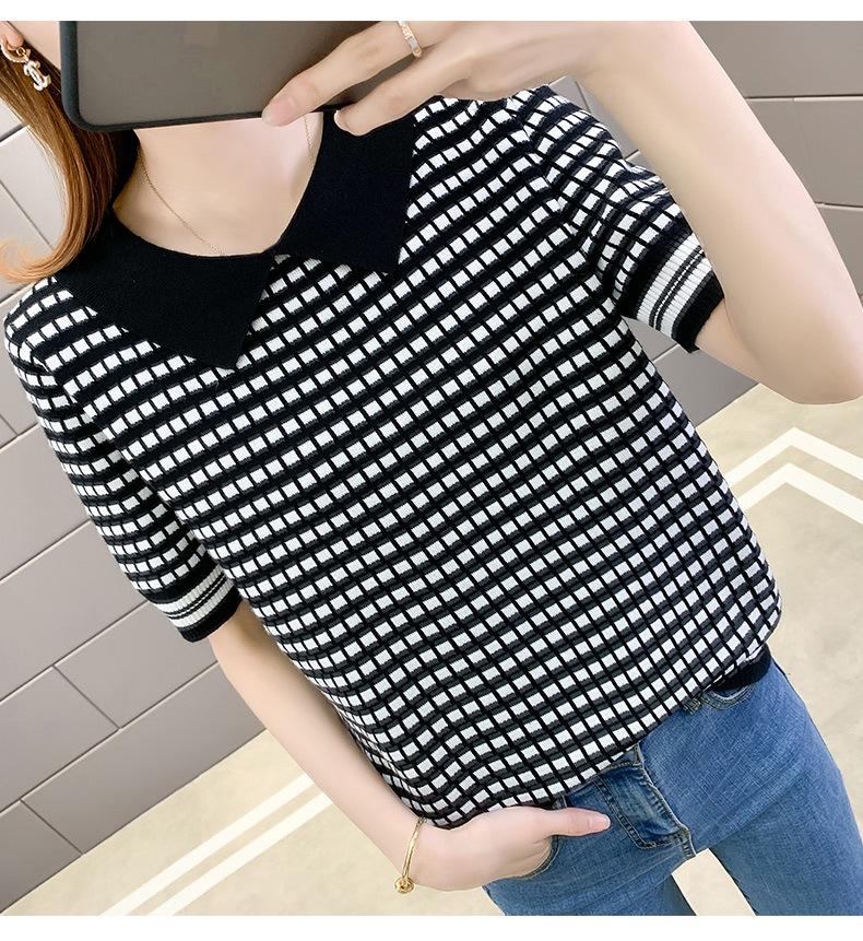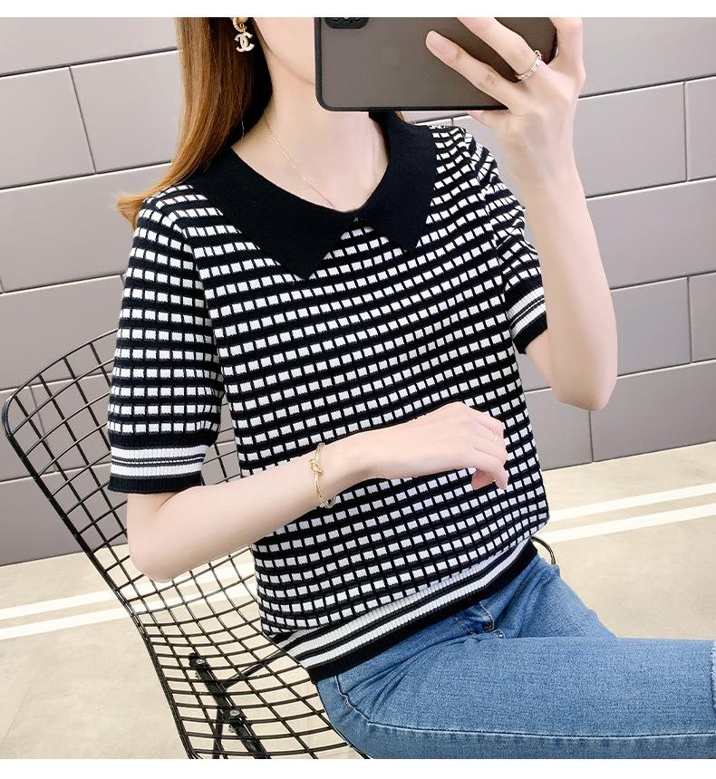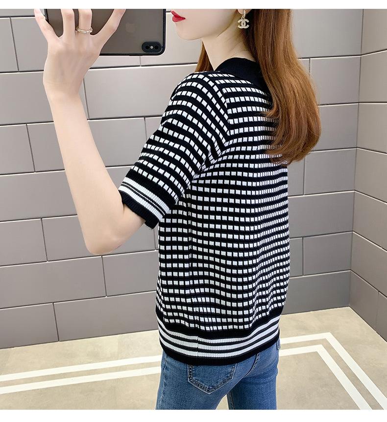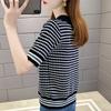 Nueva camiseta coreana de rayas blancas y negras para mujer, de manga corta cinco puntos, primavera y verano, tipo polo, jersey, top de punto de seda helada para mujer