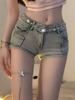 Shorts de Mezclilla Retro de Tiro Bajo Estilo Americano Spice Girl para Mujer Verano Corto Ajustado Adelgazante Hebilla Doble Pantalones Rectos de Cadera