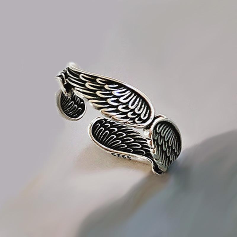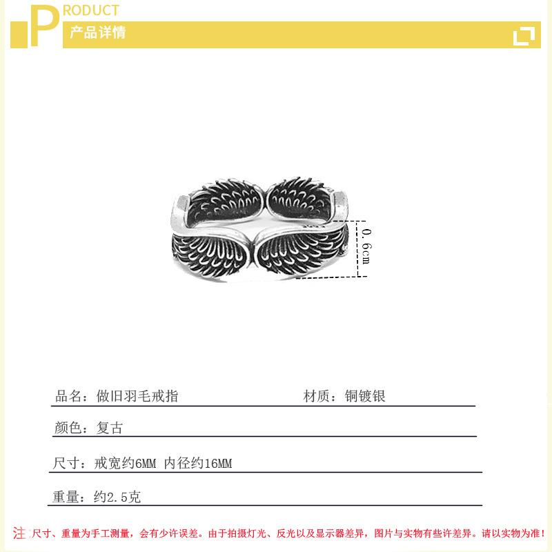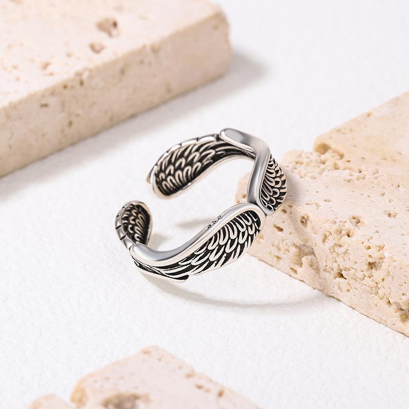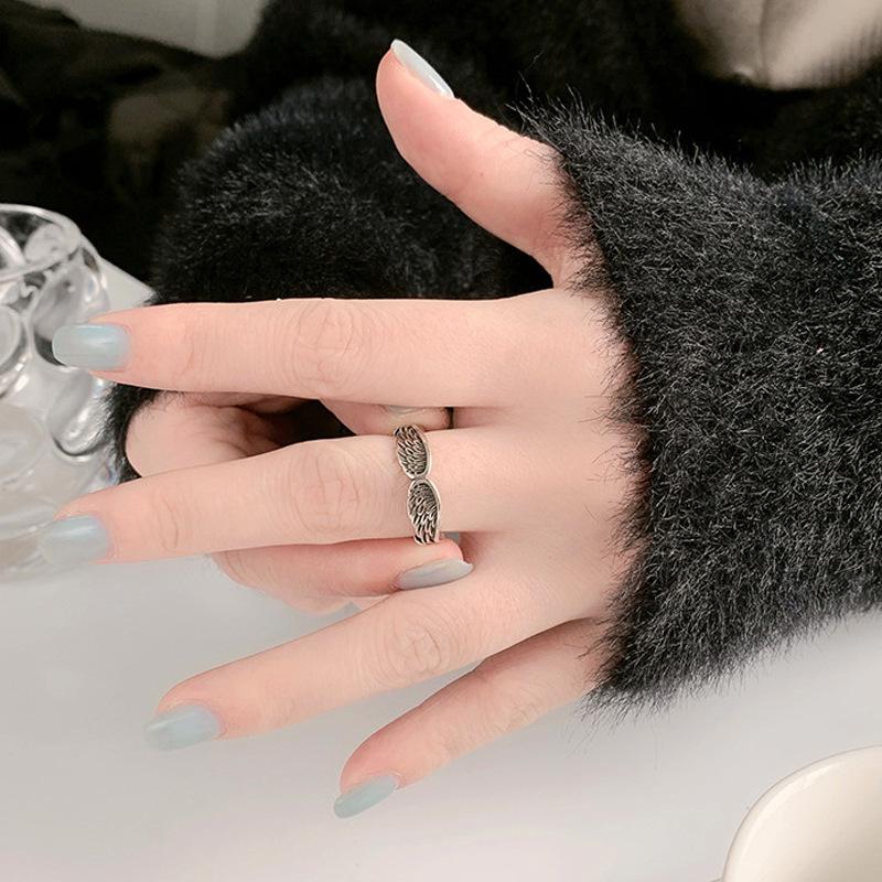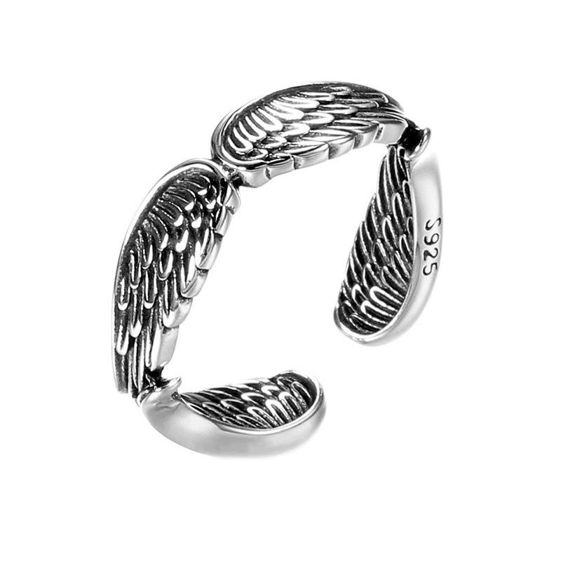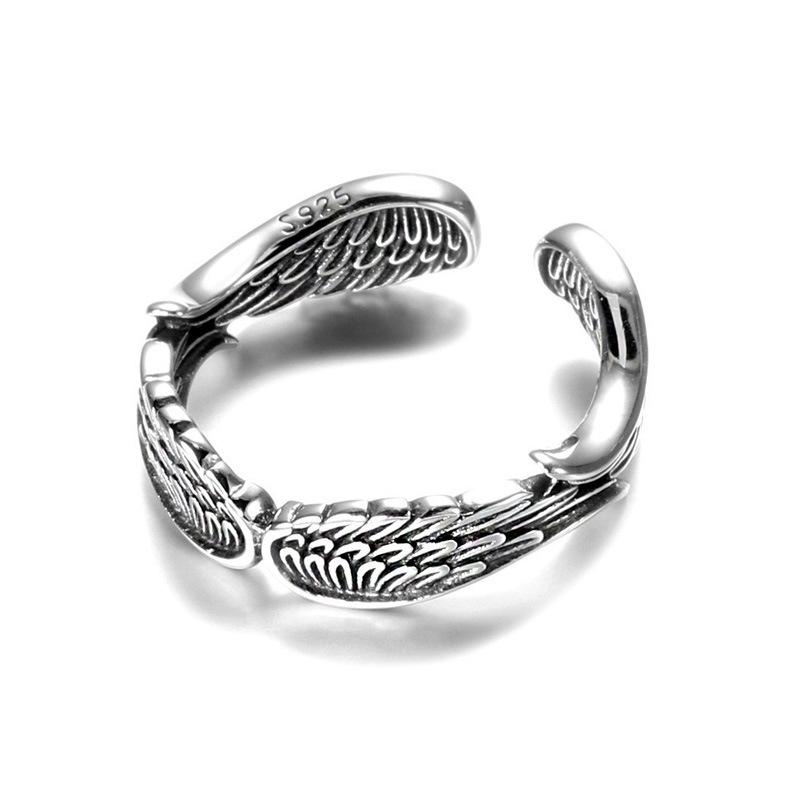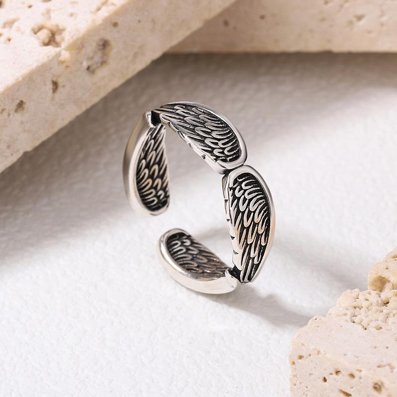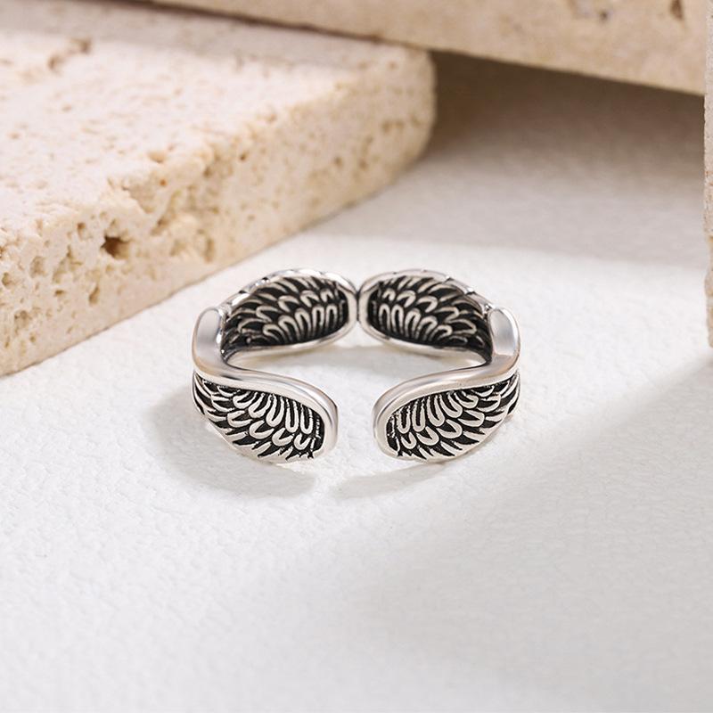 Anillo de Pluma Vintage Estilo Japonés y Coreano Hip-Hop Ins Personalizado Plata Tailandesa Chapada Cuatro Alas Alas de Ángel Anillo de Dedo Abierto