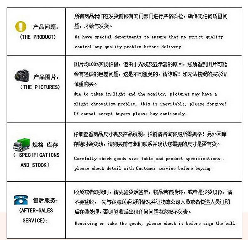 Los productos de nuestra fábrica son todos 100% fotografías de objetos reales, debido a razones de luz pueden ser ligeramente diferentes del objeto real, o debido al contraste de color y la temperatura de color del monitor de la computadora, habrá diferencias.