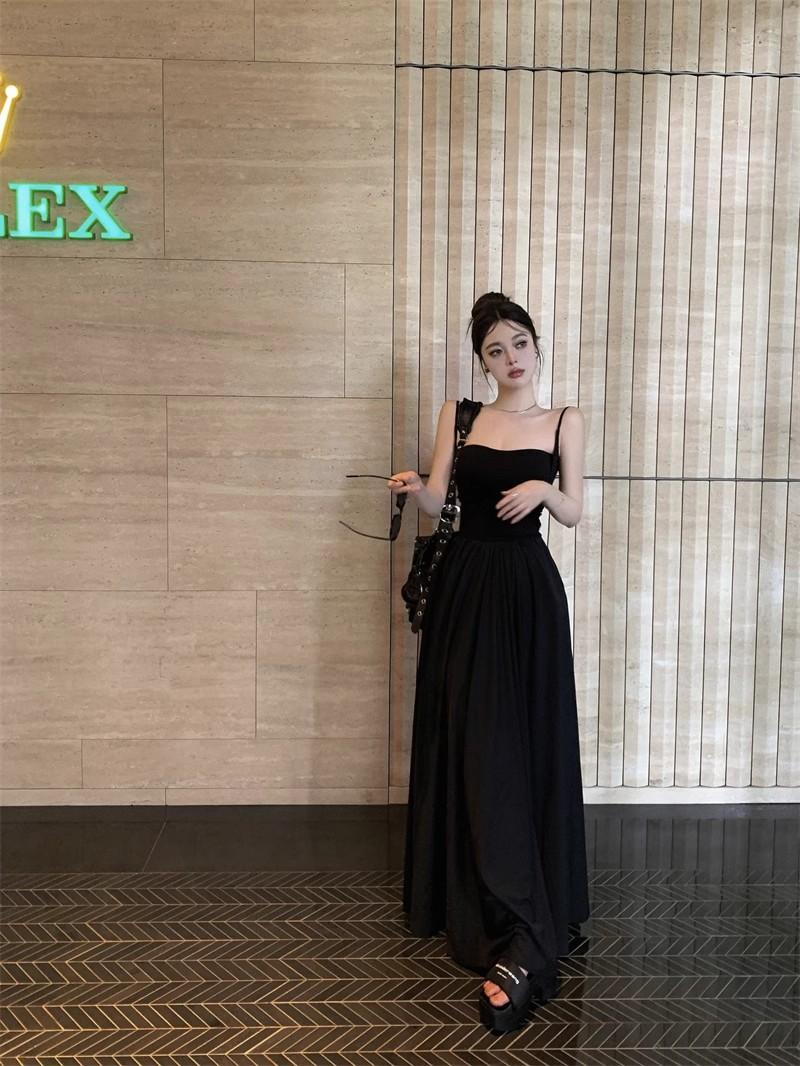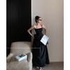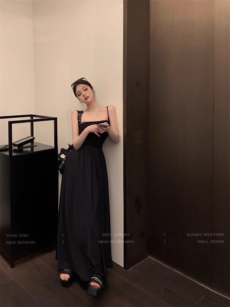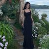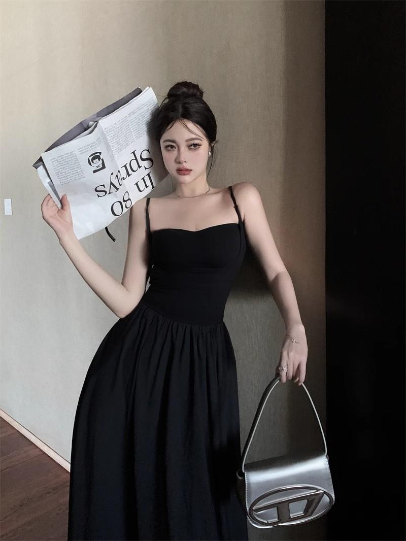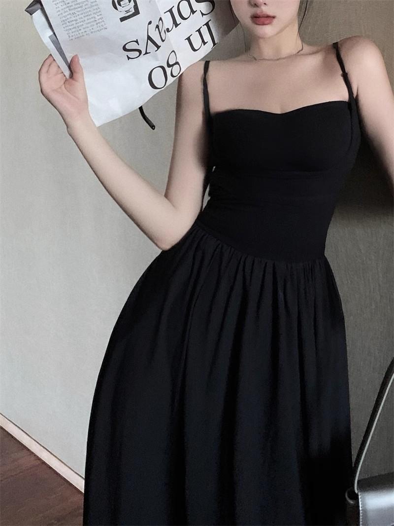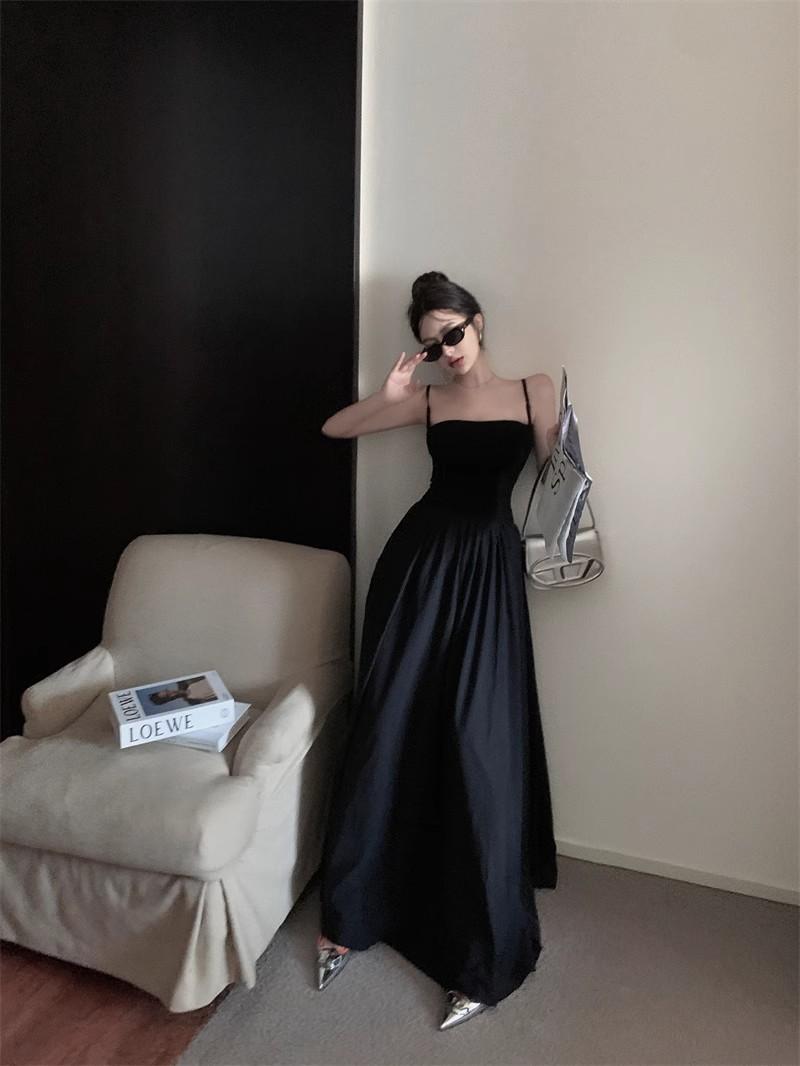 Vestido Negro de Tirantes Estilo Francés para Mujer 2024 Verano Popular Sexy Cintura Sin Mangas Vestido Largo