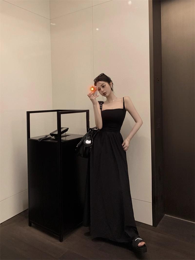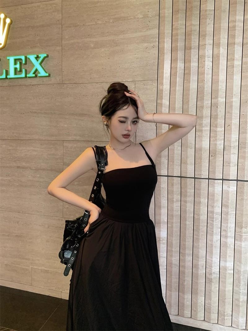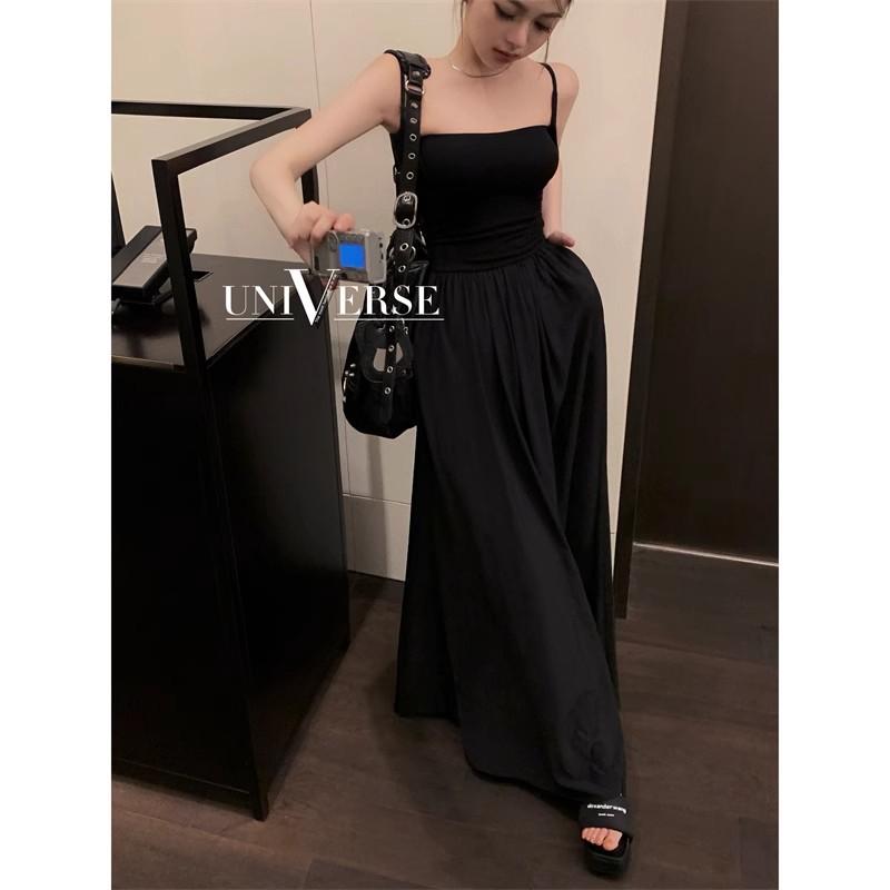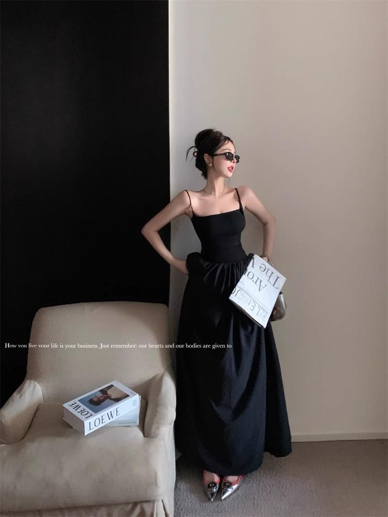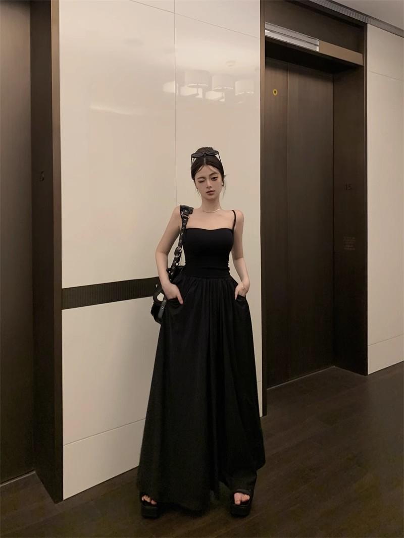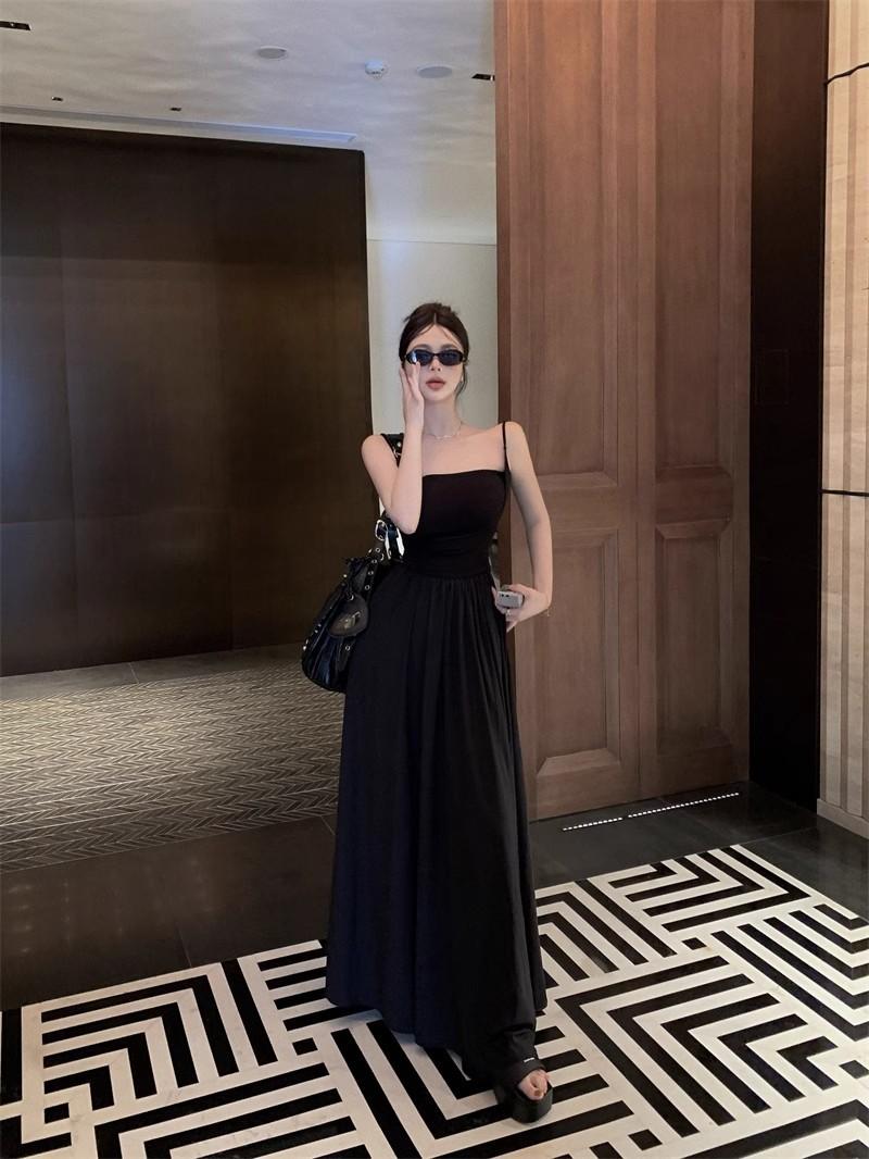 Vestido Negro de Tirantes Estilo Francés para Mujer 2024 Verano Popular Sexy Cintura Sin Mangas Vestido Largo