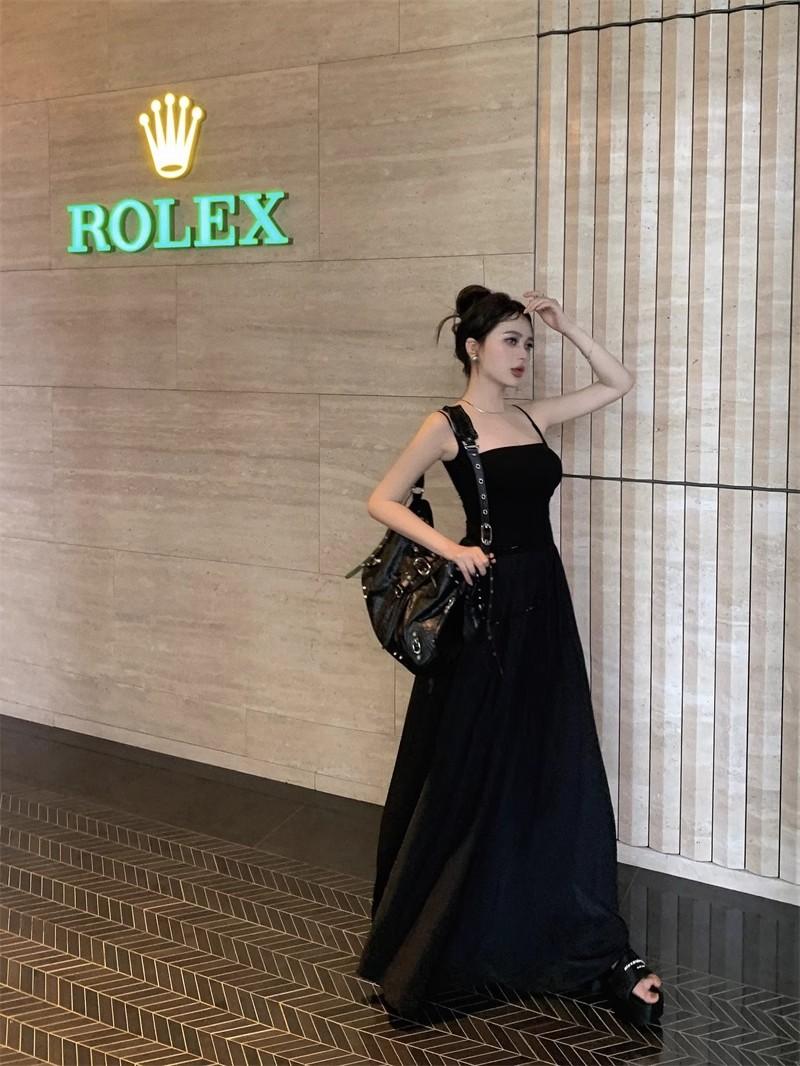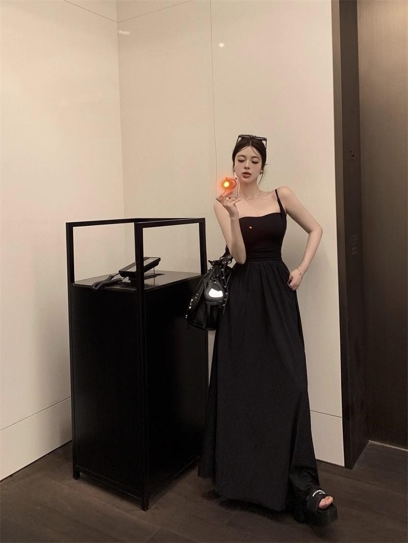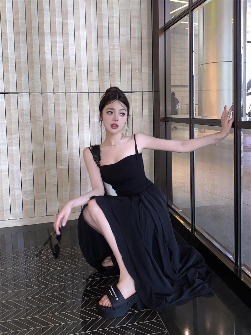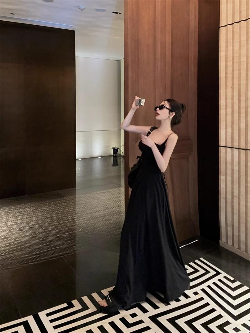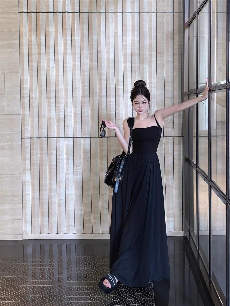 Vestido Negro de Tirantes Estilo Francés para Mujer 2024 Verano Popular Sexy Cintura Sin Mangas Vestido Largo
