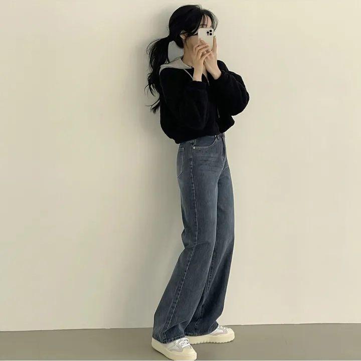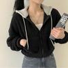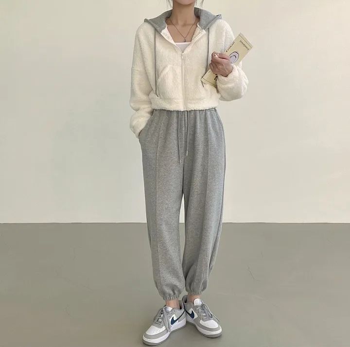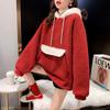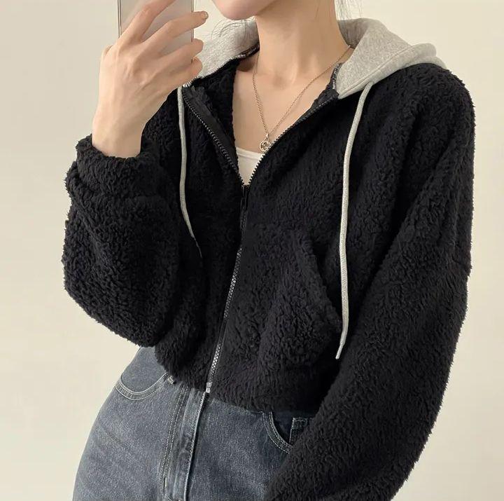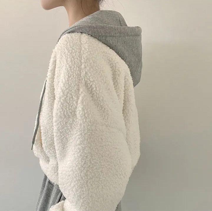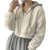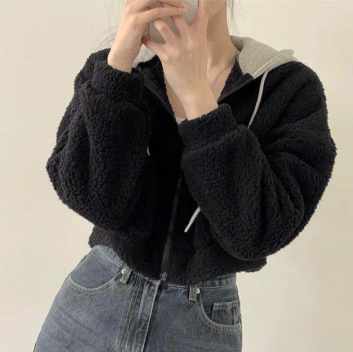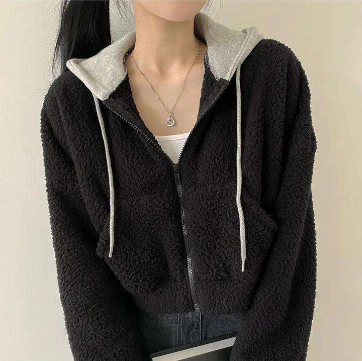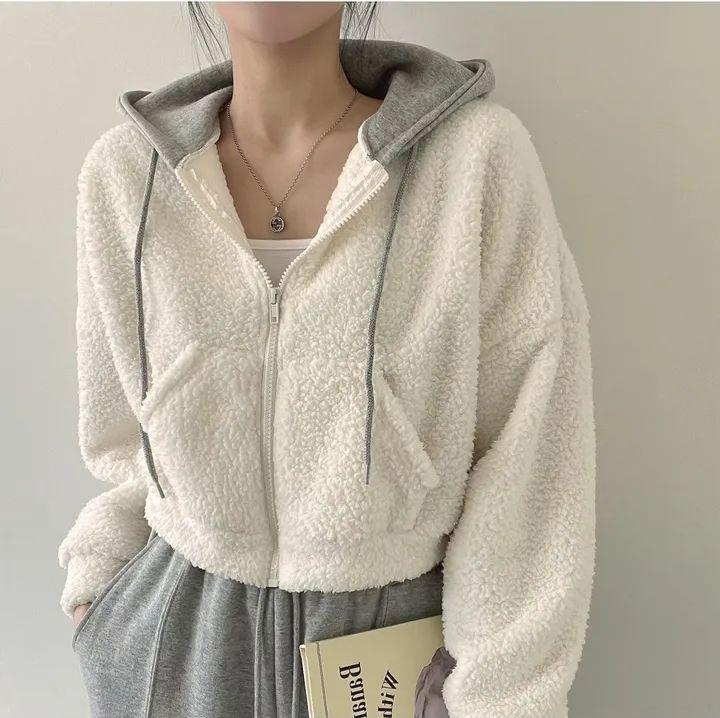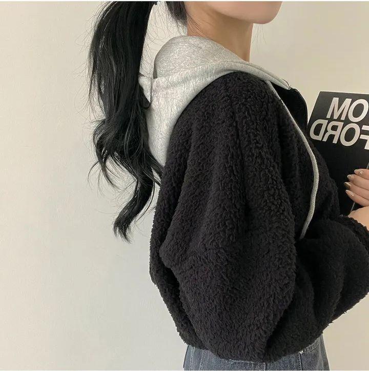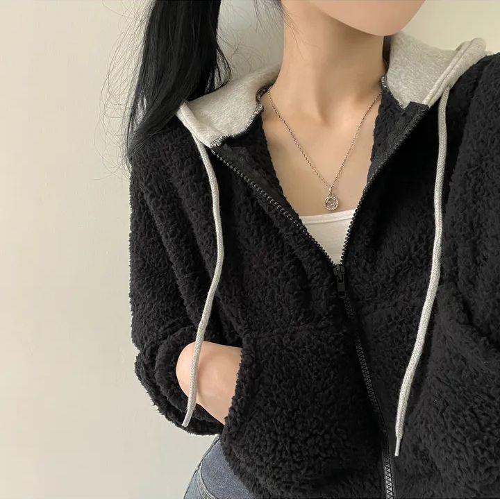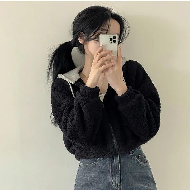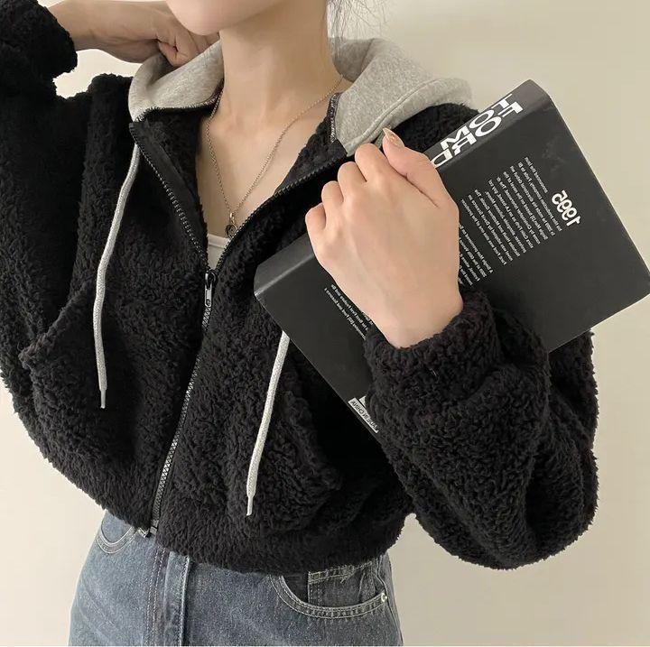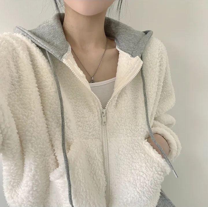Chic Coreano Otoño e Invierno Cálido Casual Deportivo Suelto Lana de Cordero Capucha Bolsillo Petite Chaqueta de Felpa para Mujer