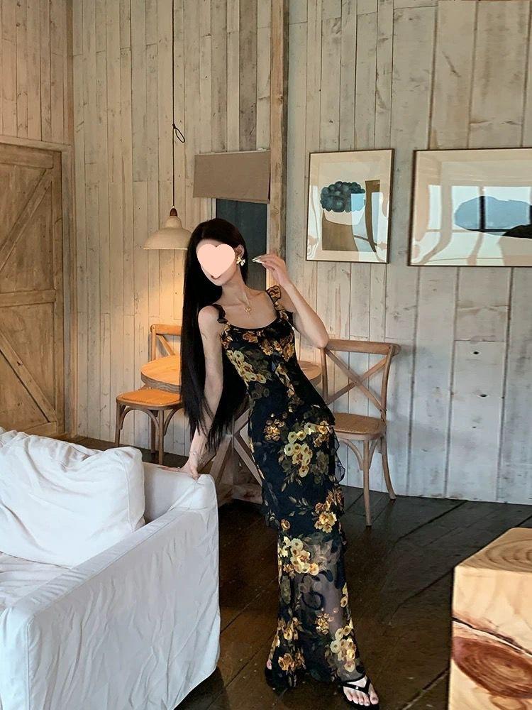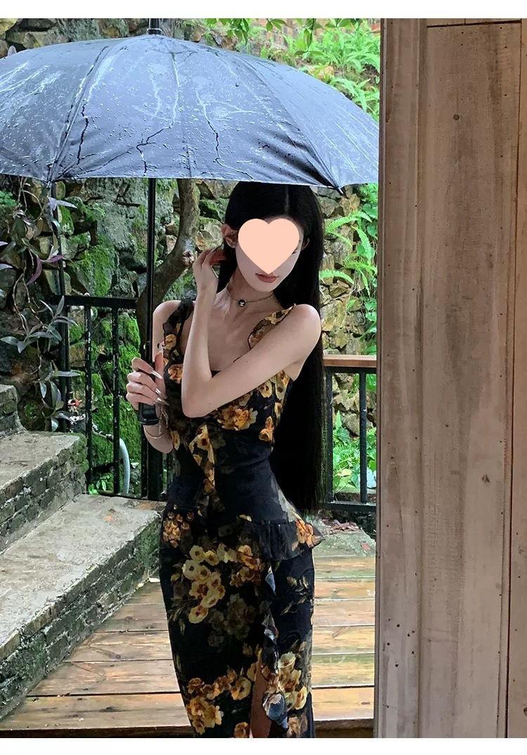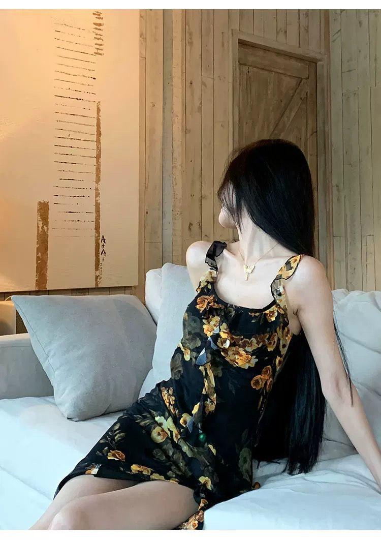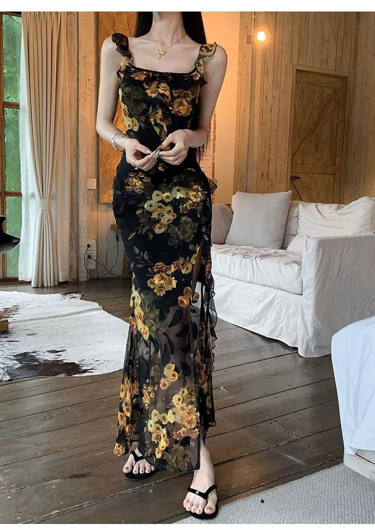 Vestido de Verano para Vacaciones en la Playa con Volantes Franceses Florales y Tirantes Espagueti para Mujer, Sensación de Verano, Adelgazante, Temperamental, Vestido Largo