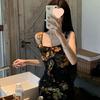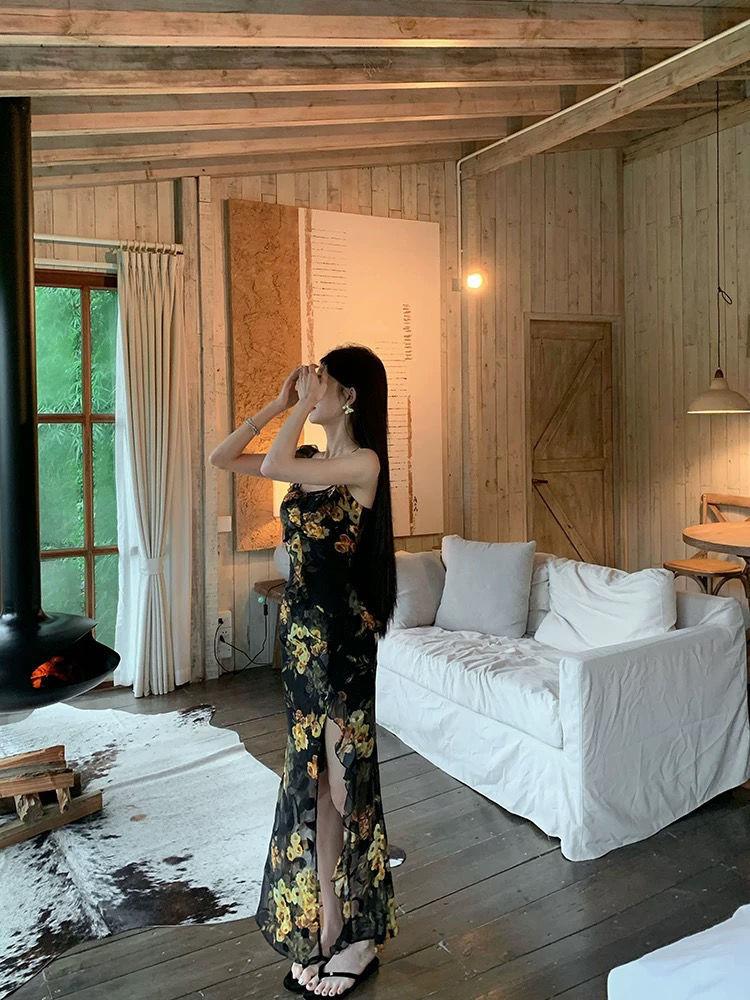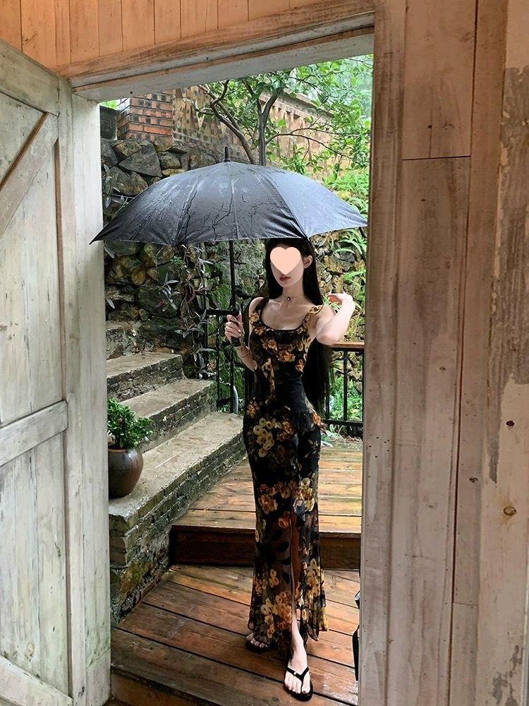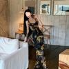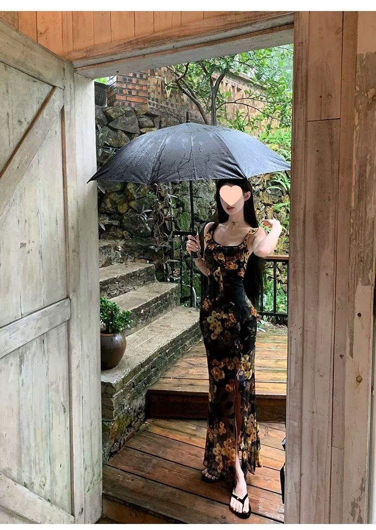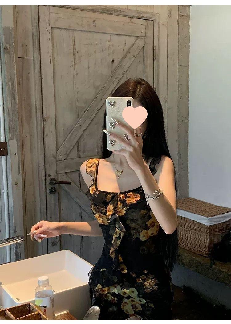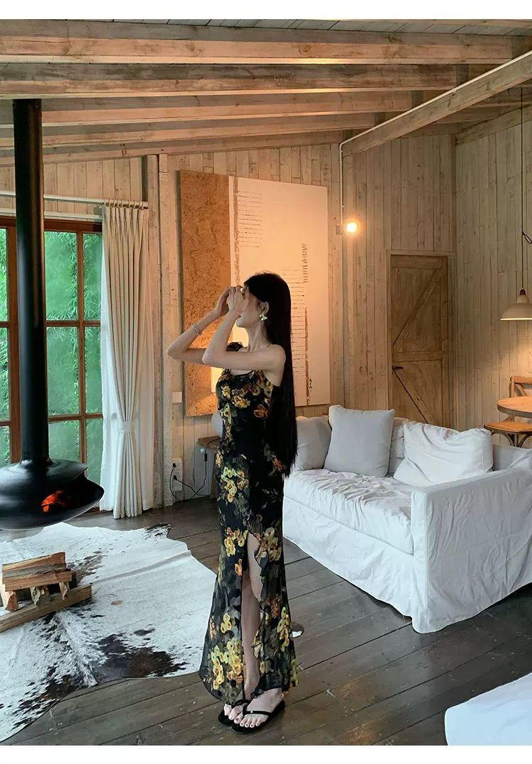 Vestido de Verano para Vacaciones en la Playa con Volantes Franceses Florales y Tirantes Espagueti para Mujer, Sensación de Verano, Adelgazante, Temperamental, Vestido Largo