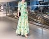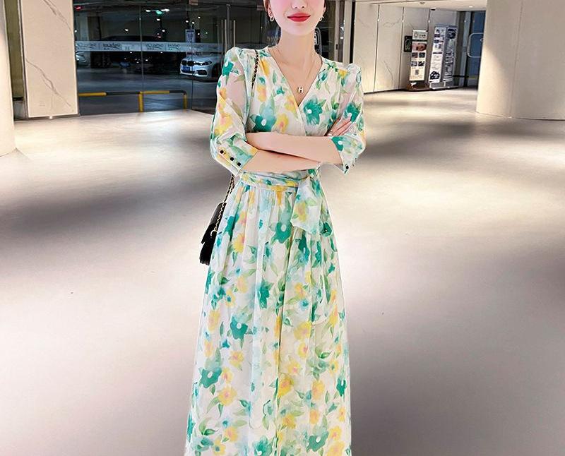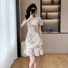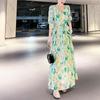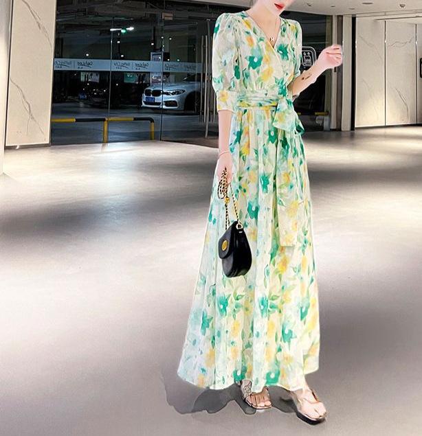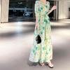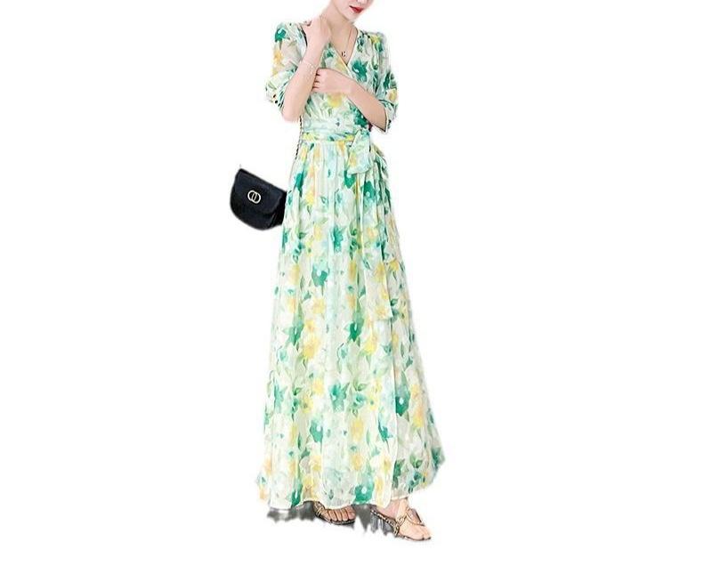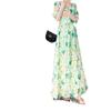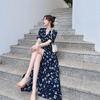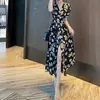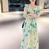 Vestido Francés de Princesa Estampado de Largo Medio con Cuello en V, Corte Slim, Manga Corta y Abertura, Estilo Retro, Verano 2025, Nuevo Estilo