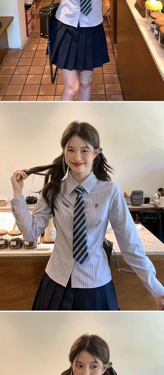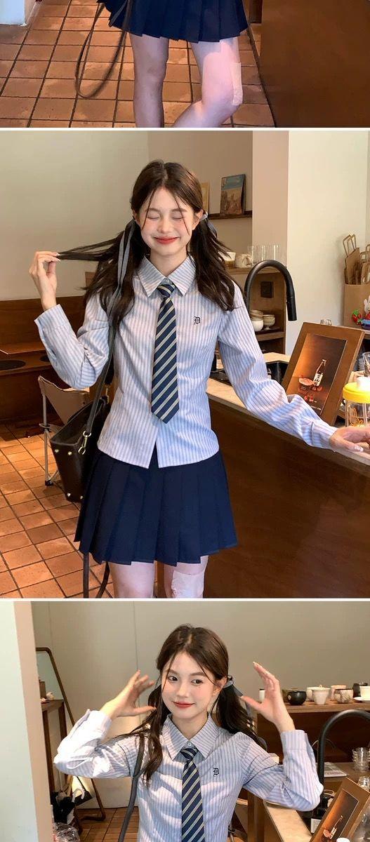 Embroidered blue striped long sleeves + color skirt + blue striped tie