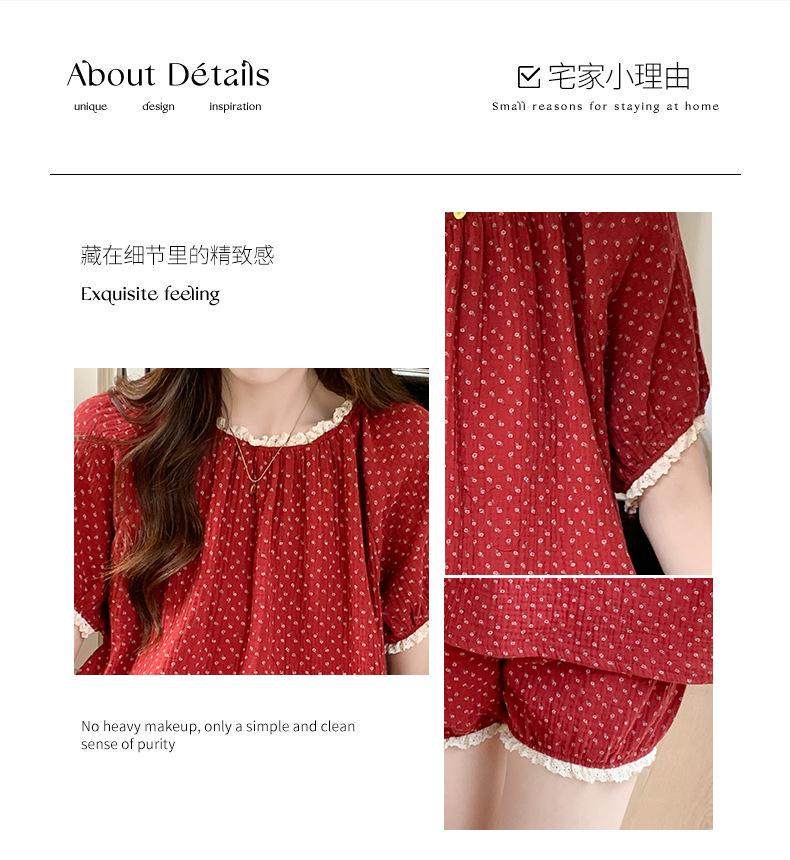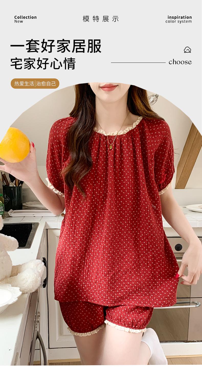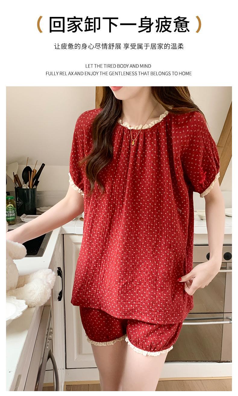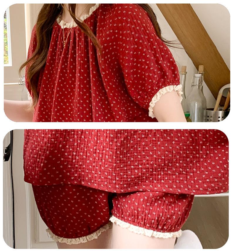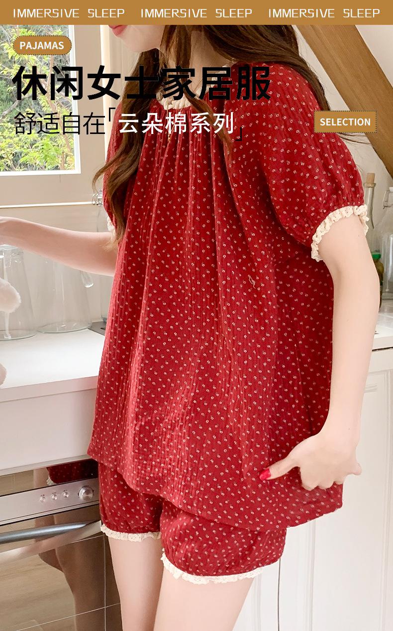 Pijama Floral Rojo de Manga Corta para Mujer Verano Delgado Algodón Nube Borde Estilo Princesa Nuevo Ropa para el Hogar Set de Dos Piezas