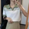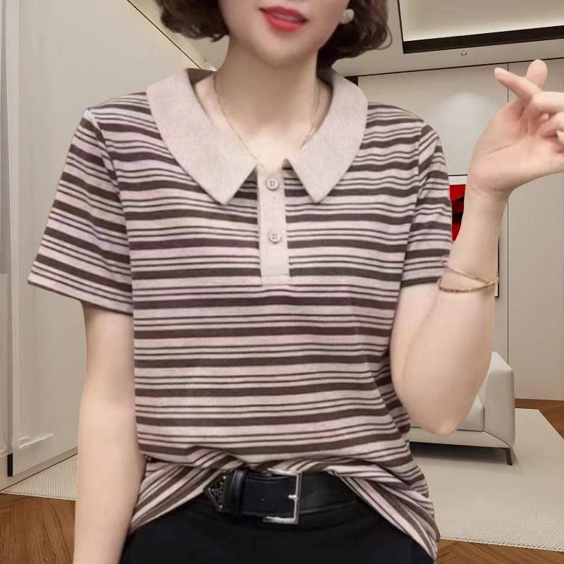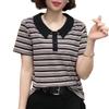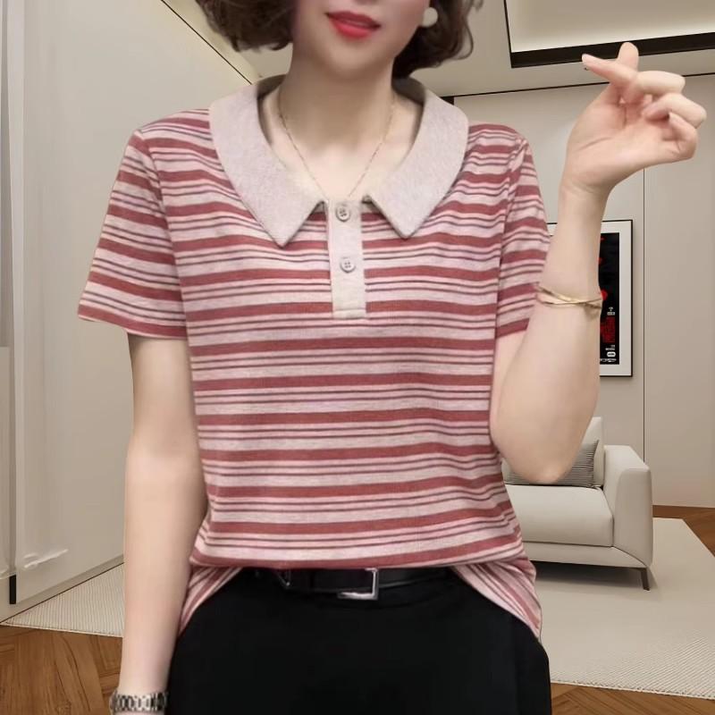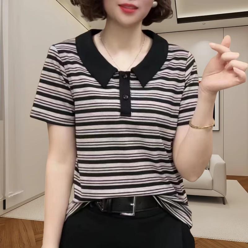 Playera Delgada de Manga Corta para Mujer en Verano Nuevo Estilo Diseño de Cuello Polo Rayado Camiseta Básica Estilo Holgado a la Moda Top