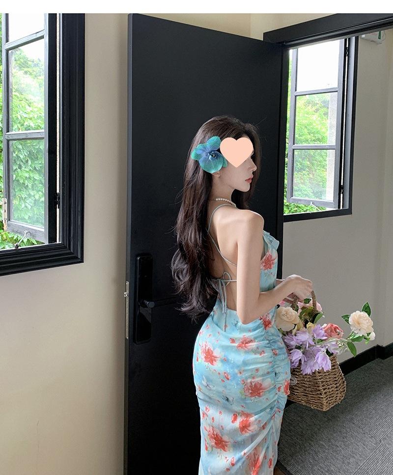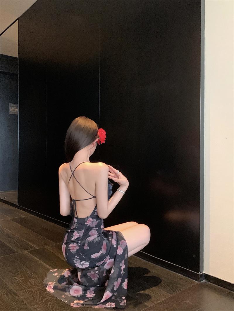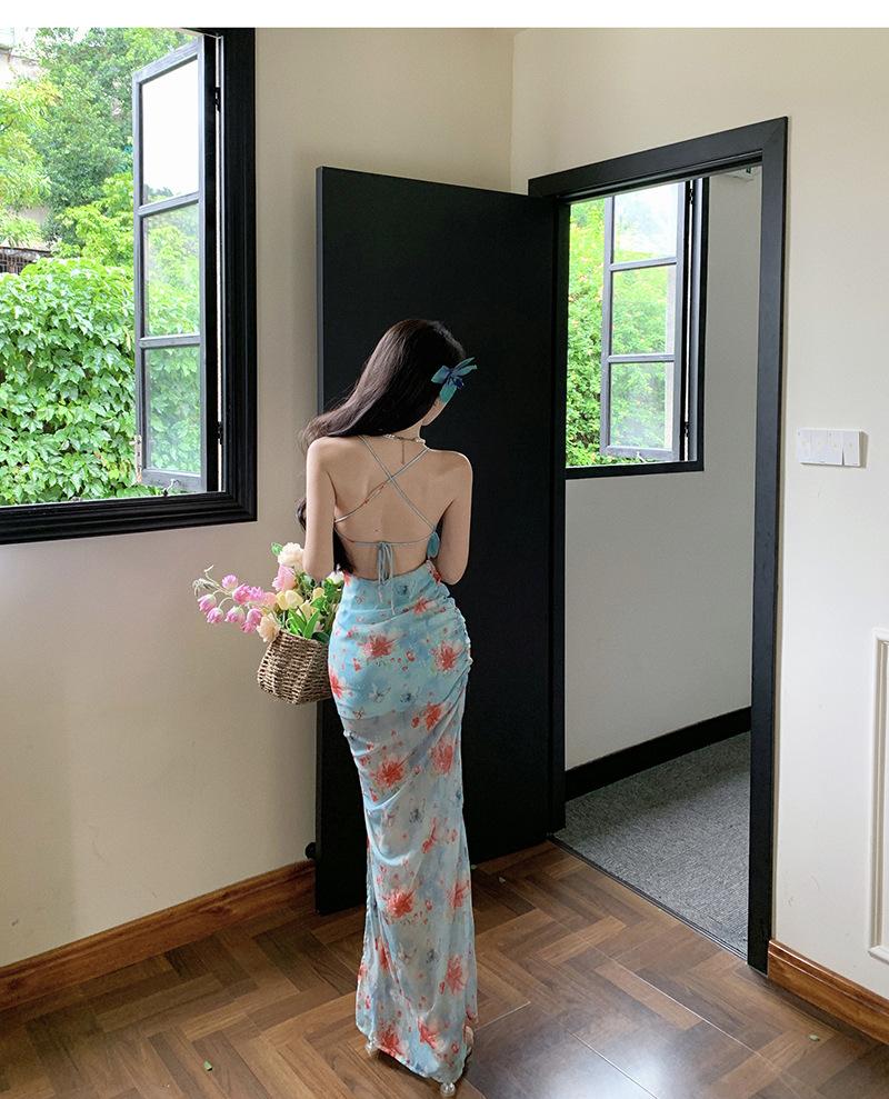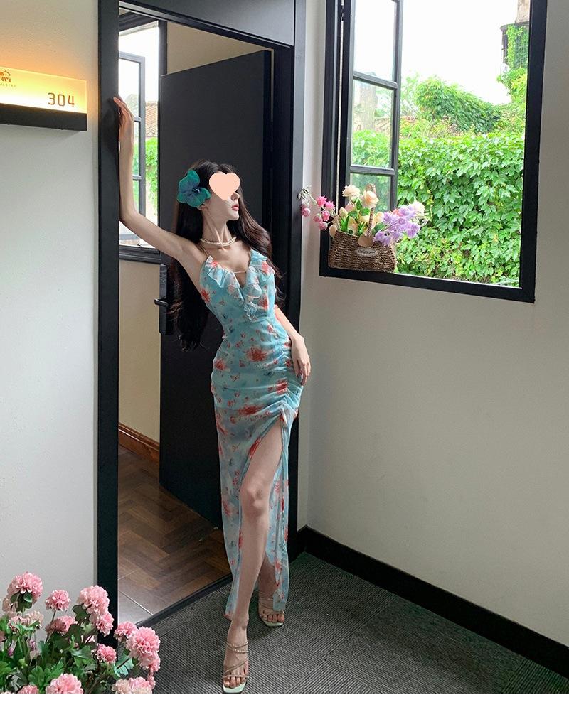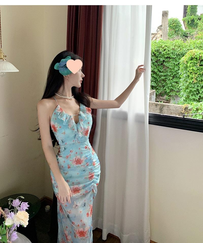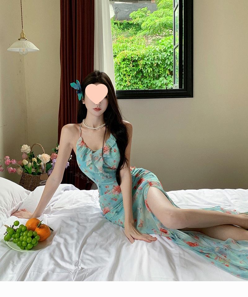Vestido puro sexy con volantes florales y tirantes para mujer, ambiente de vacaciones de verano junto al mar, sin espalda, con abertura, vestido de playa