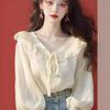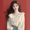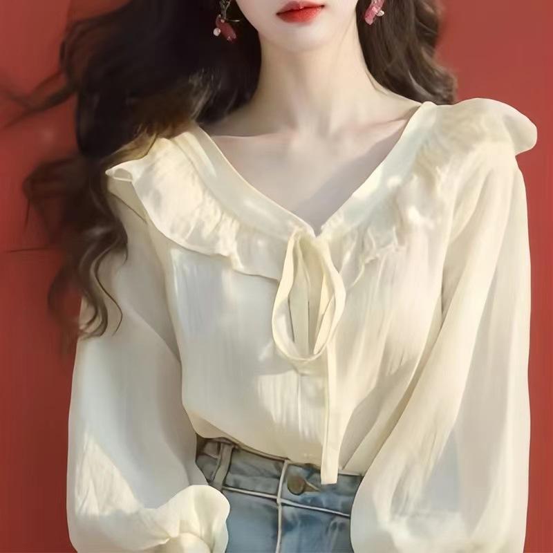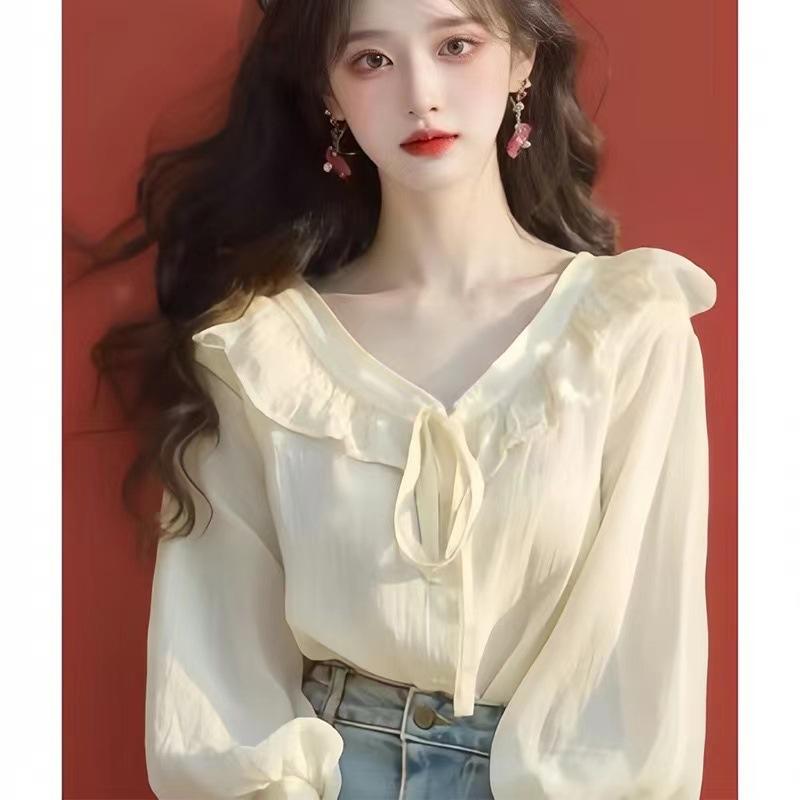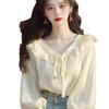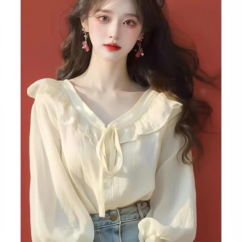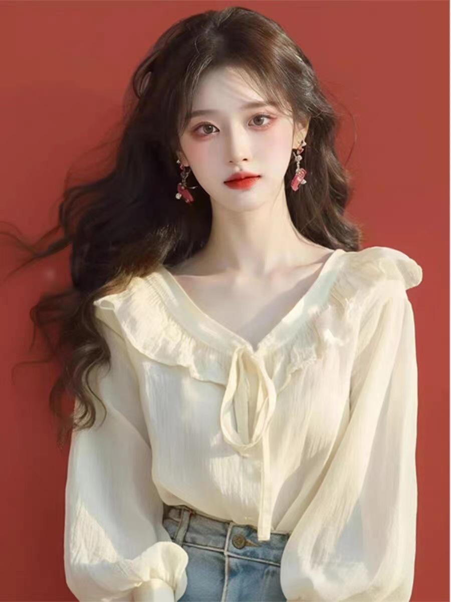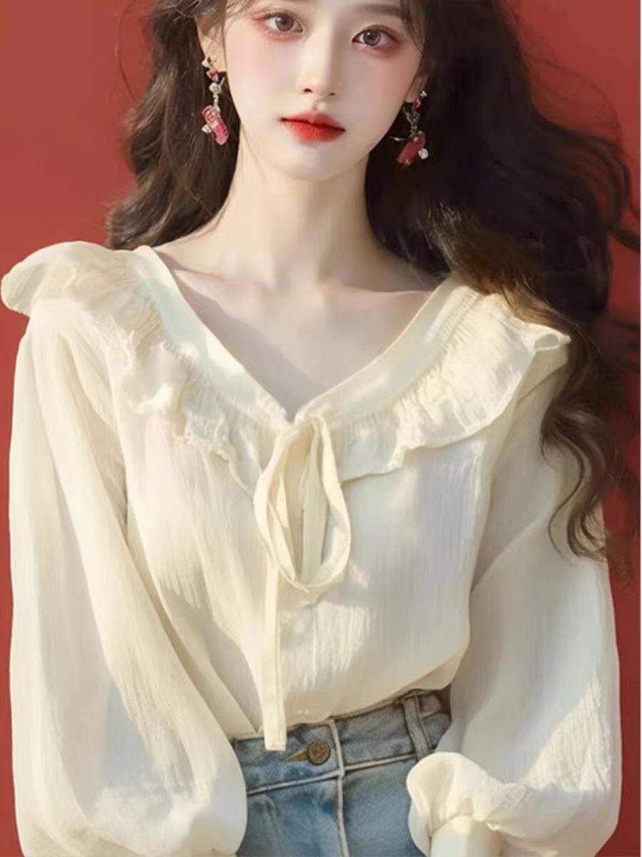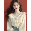 Popular de este año hermosa top 2025 principios de otoño nueva ropa de mujer dulce francés único albaricoque protector solar camisa de gasa