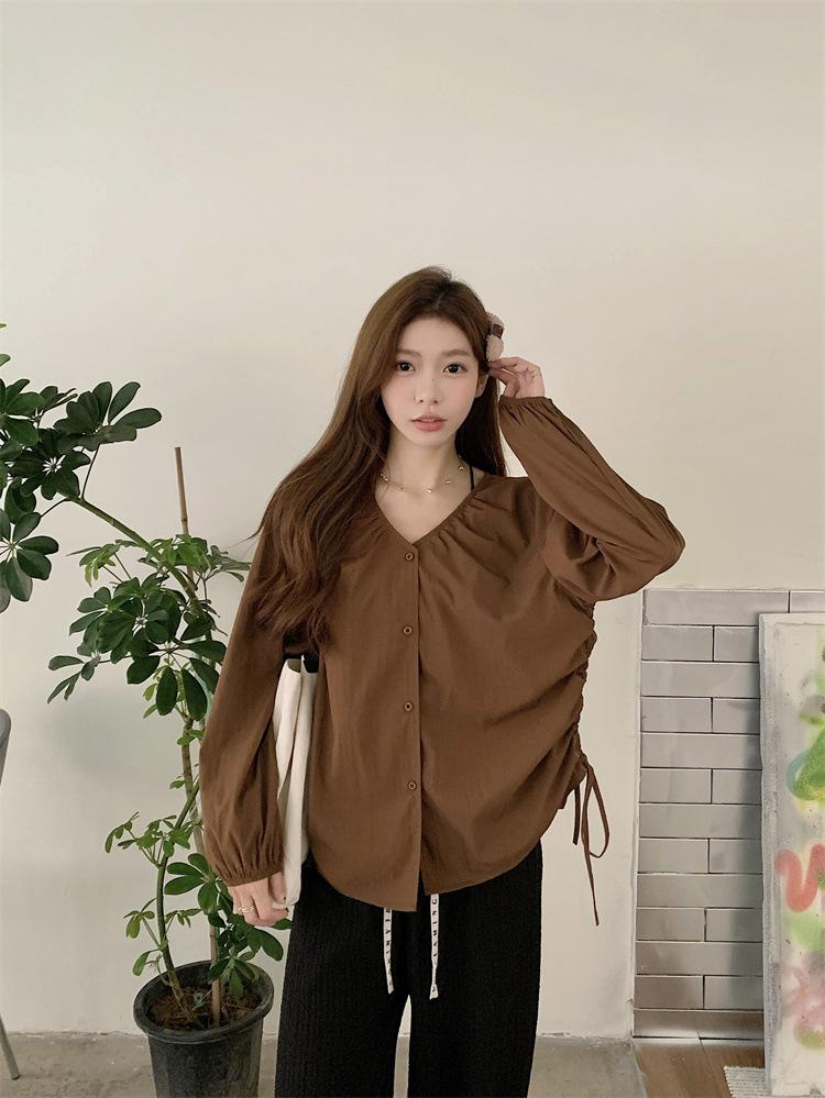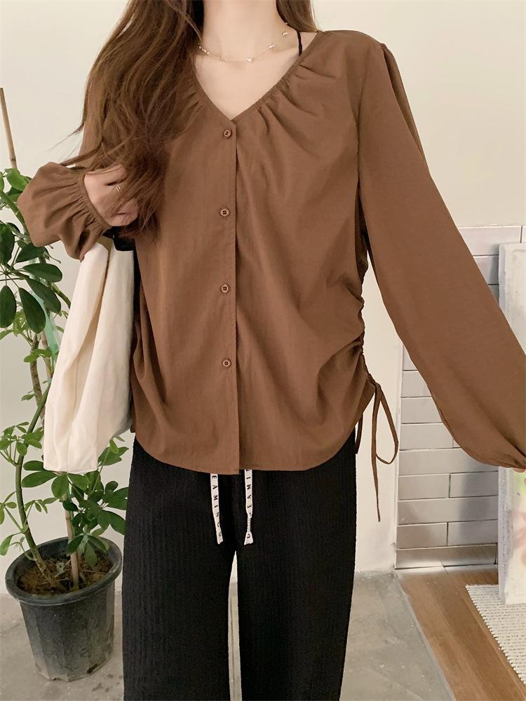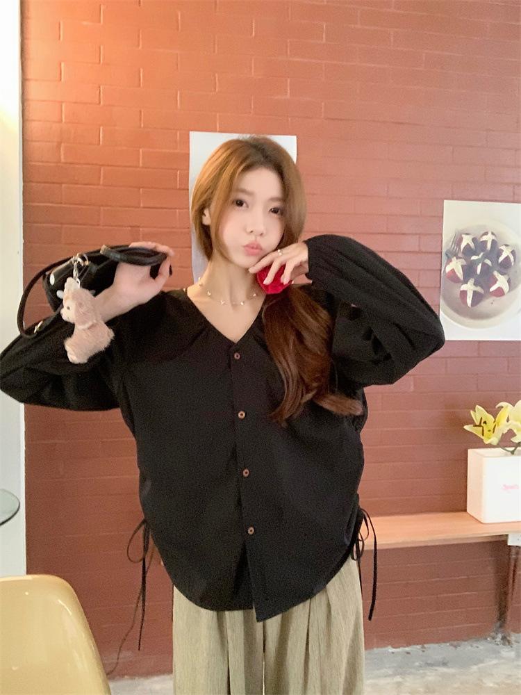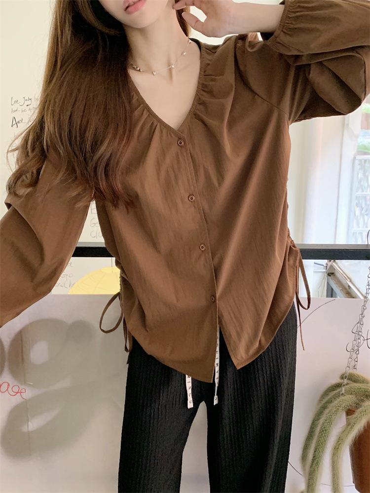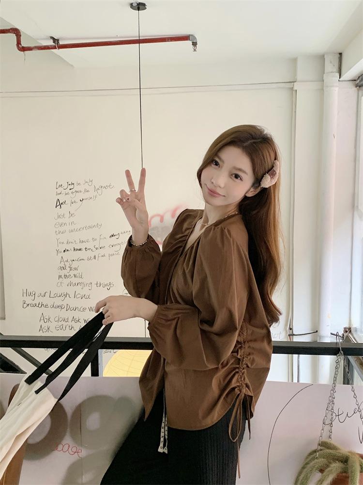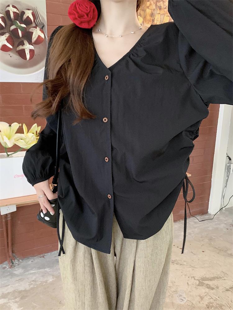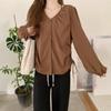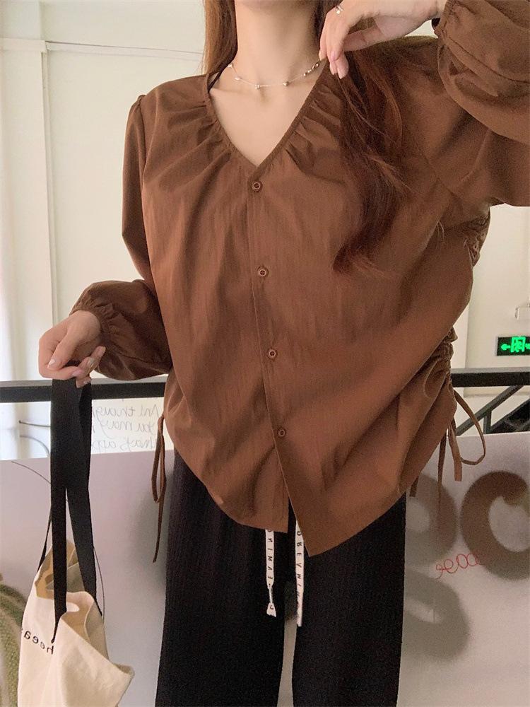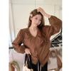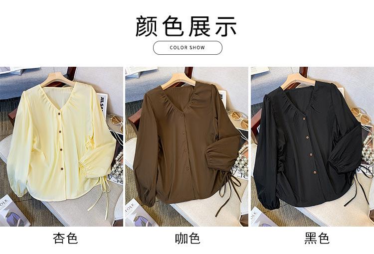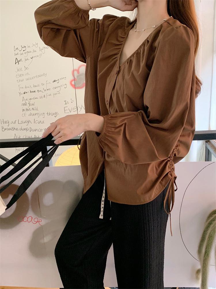 Gorda mm 2025 otoño nuevo francés adelgazante camisa cuello en V plisada con cordón manga larga top chic mujeres