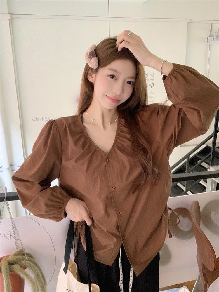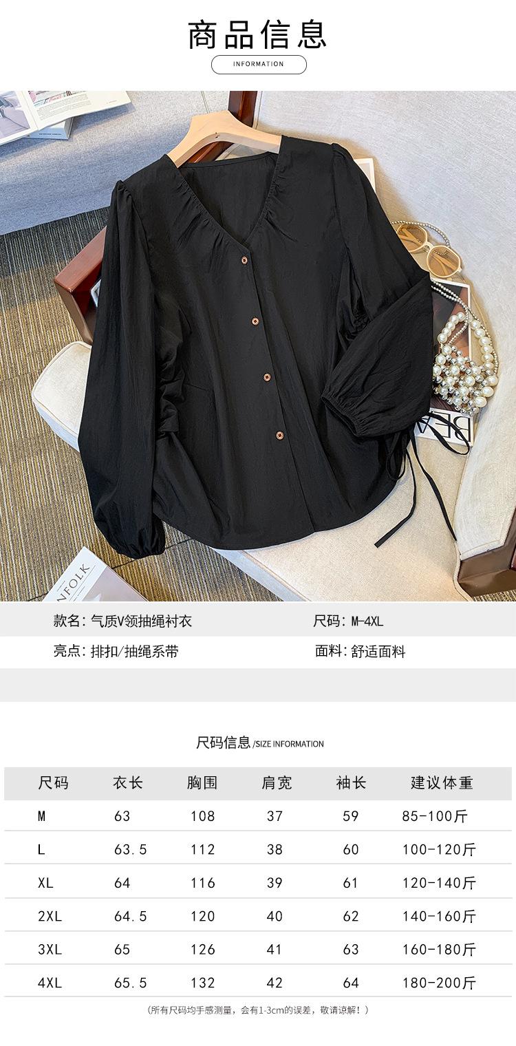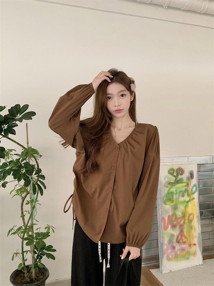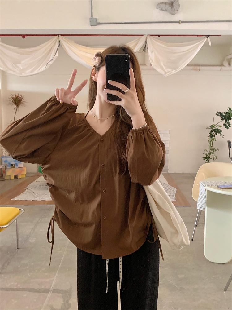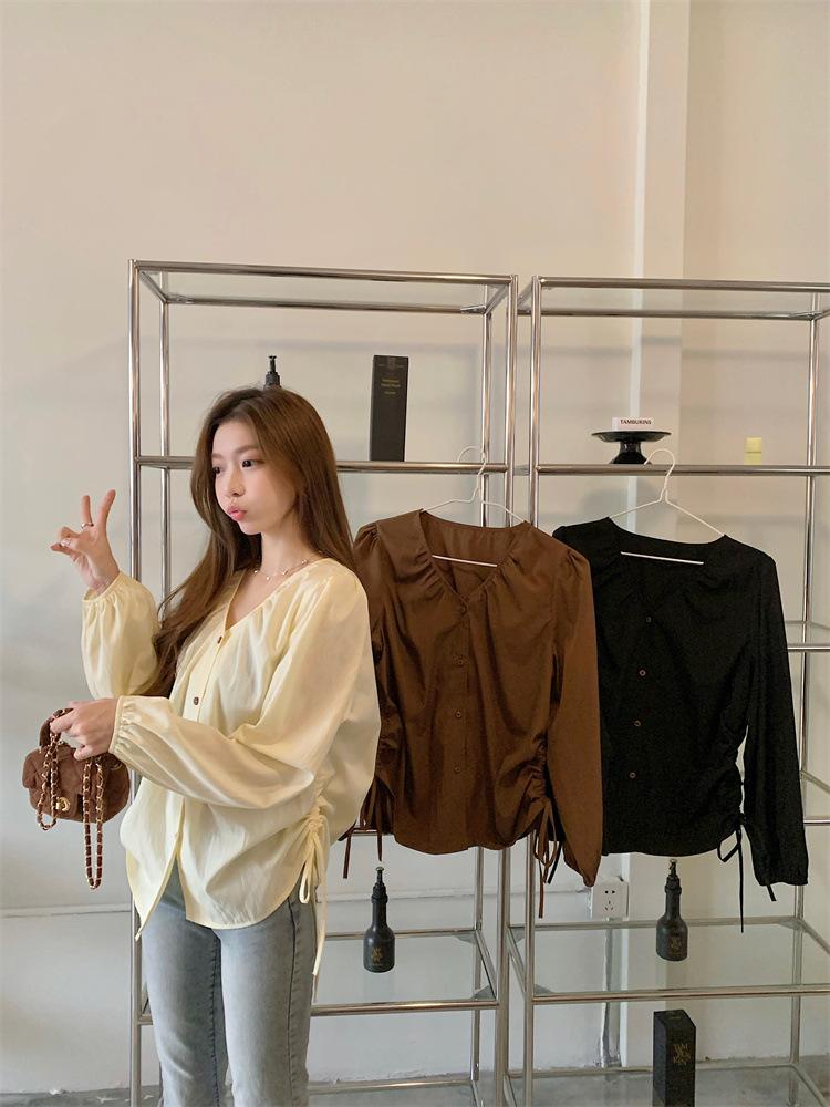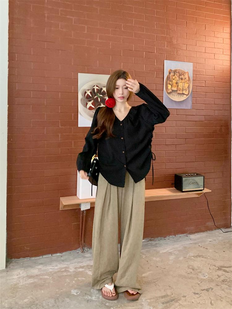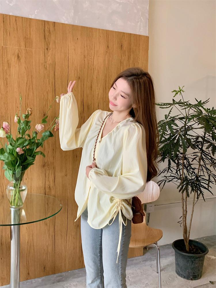 Gorda mm 2025 otoño nuevo francés adelgazante camisa cuello en V plisada con cordón manga larga top chic mujeres