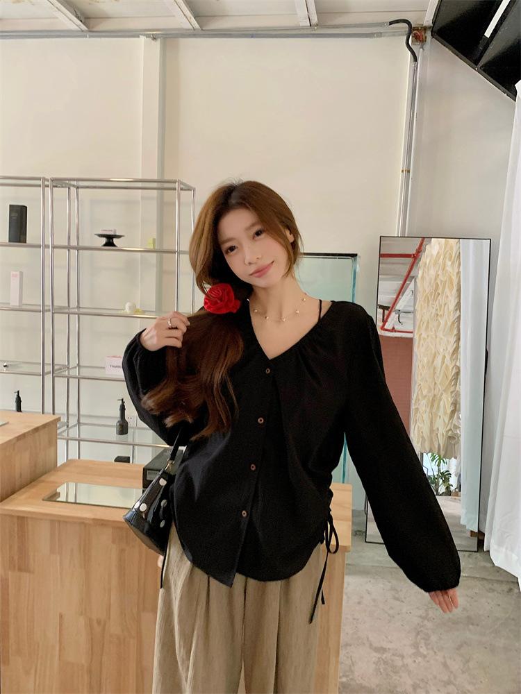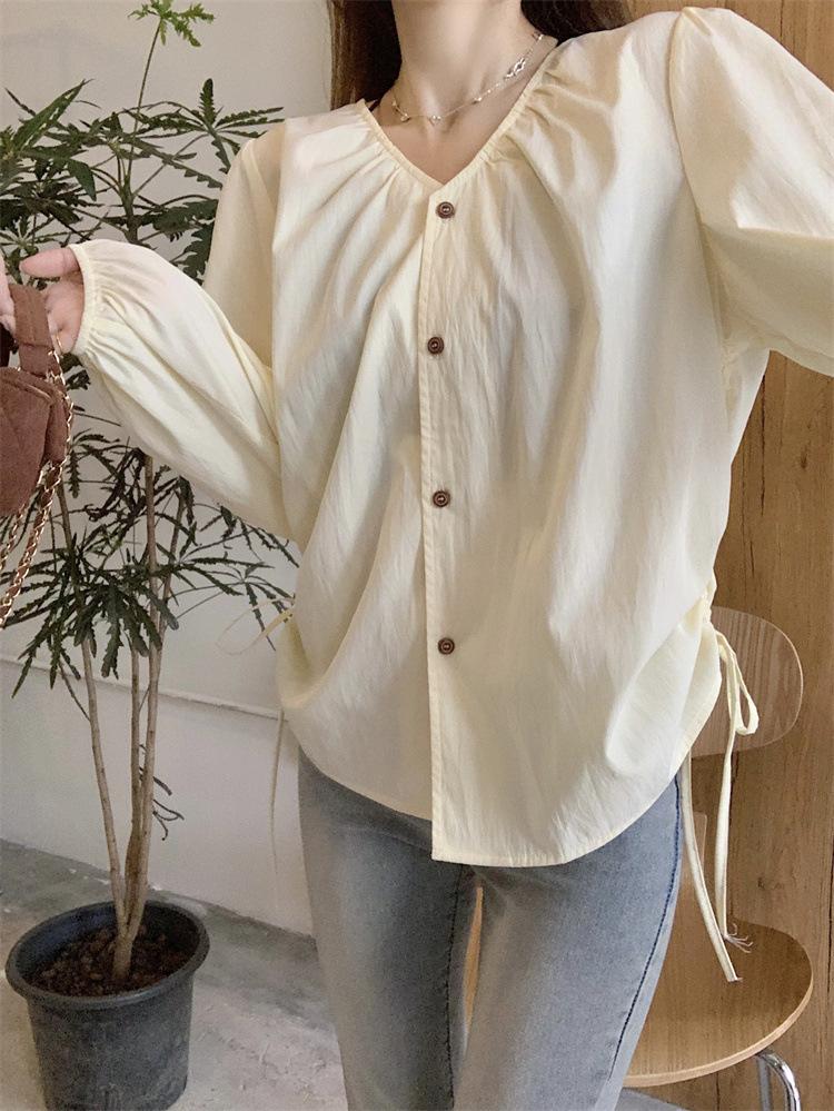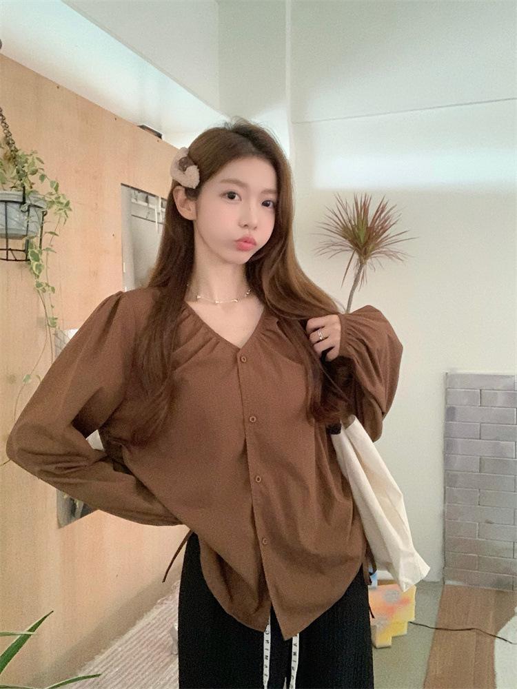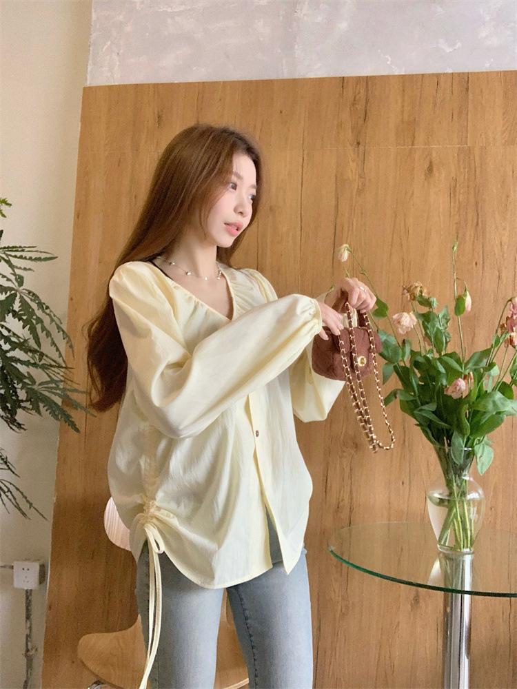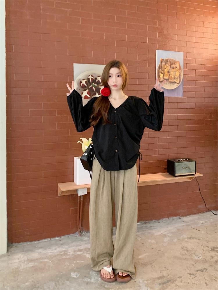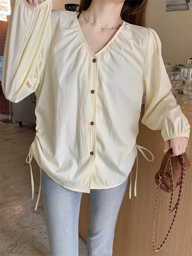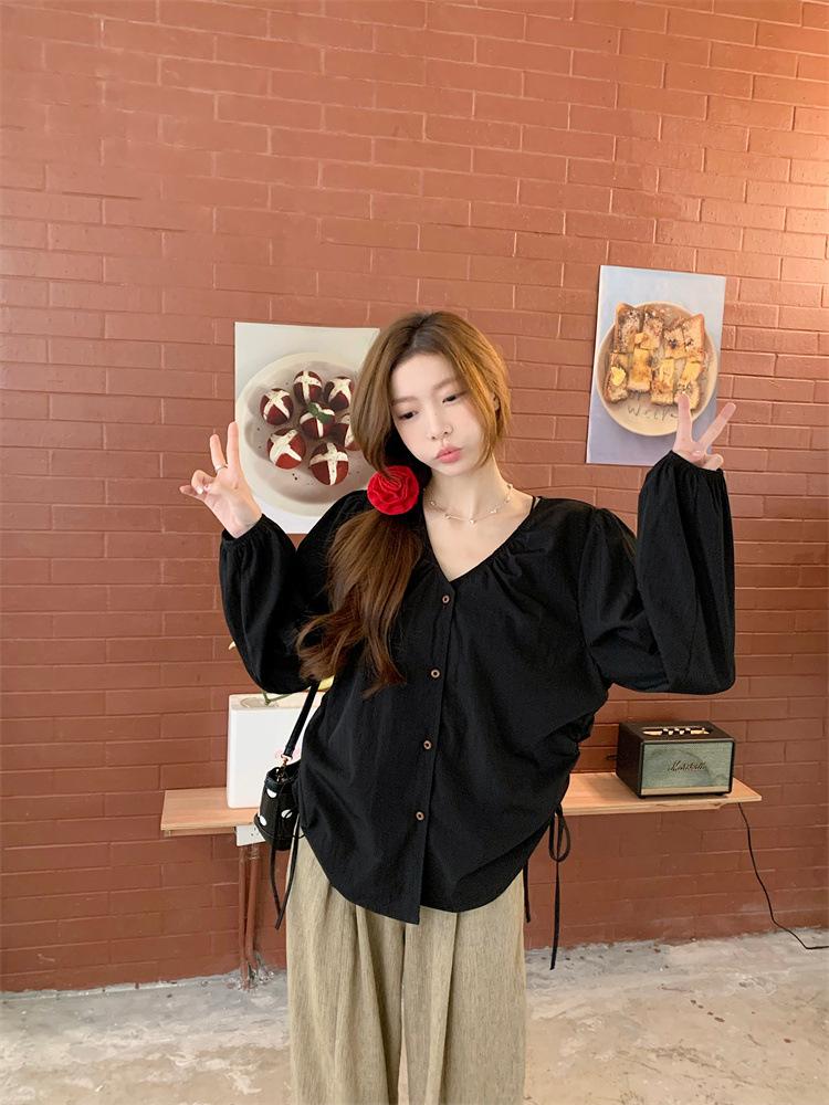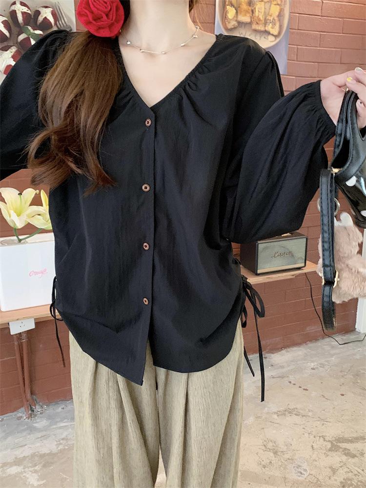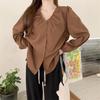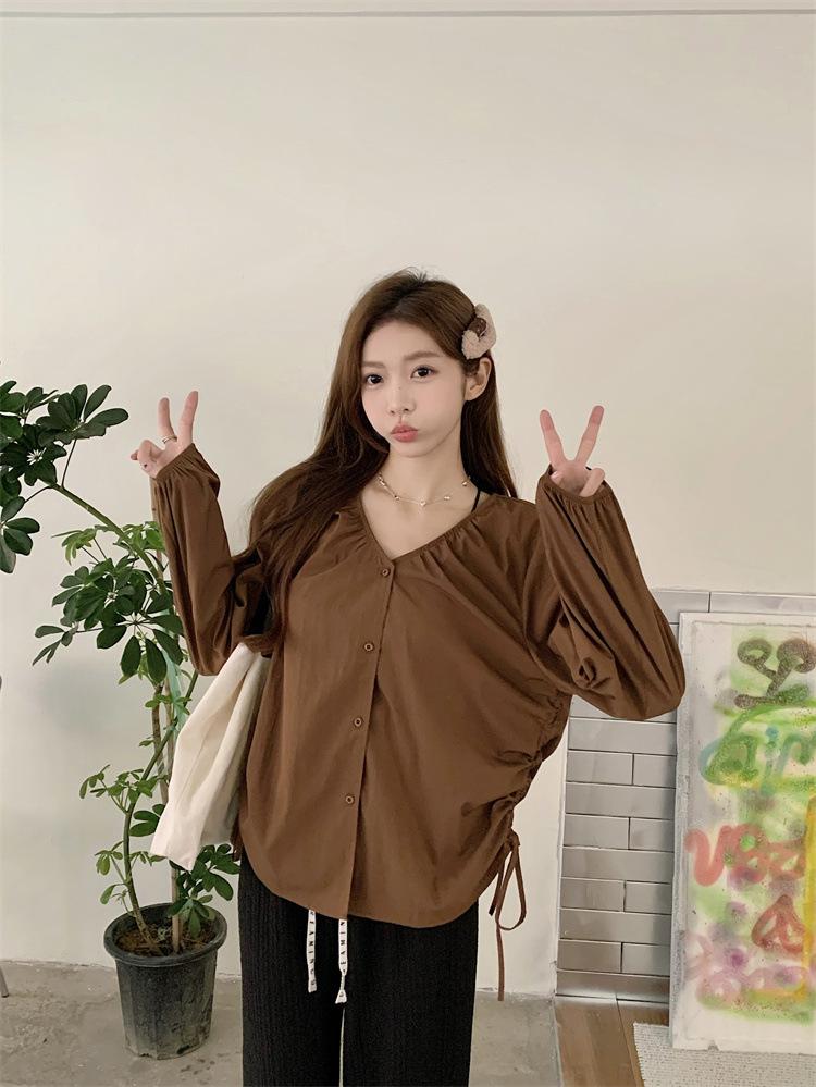 Gorda mm 2025 otoño nuevo francés adelgazante camisa cuello en V plisada con cordón manga larga top chic mujeres