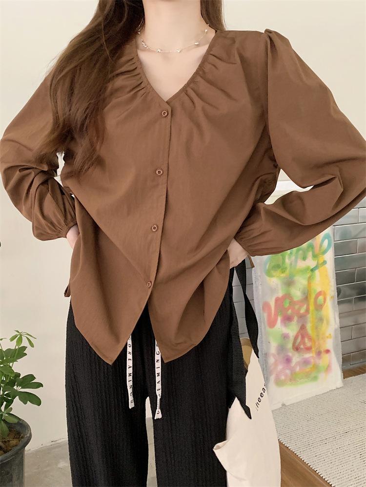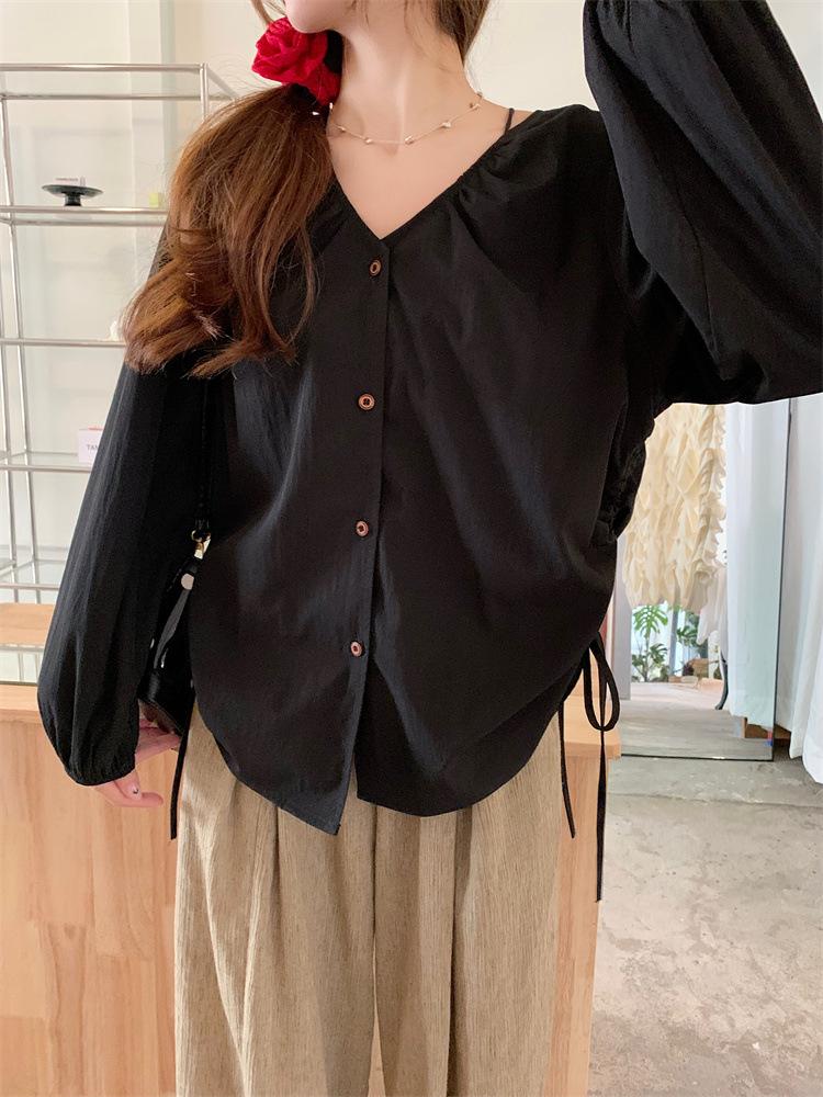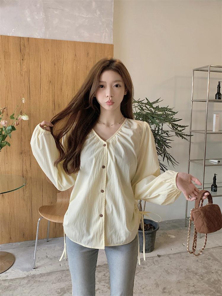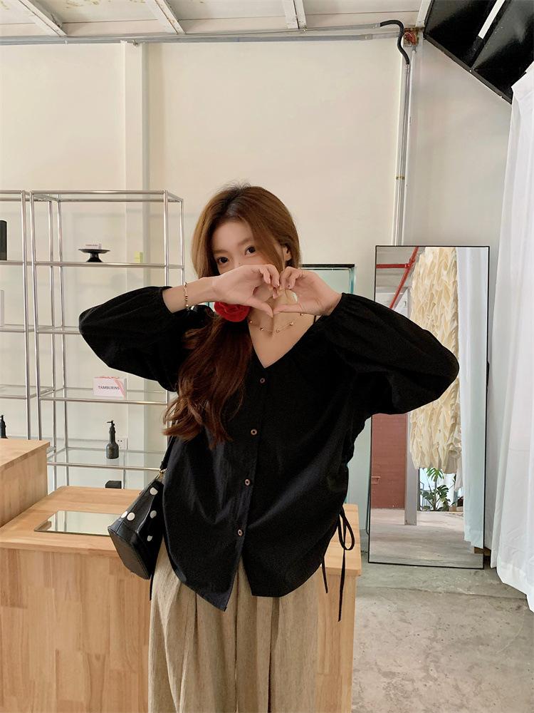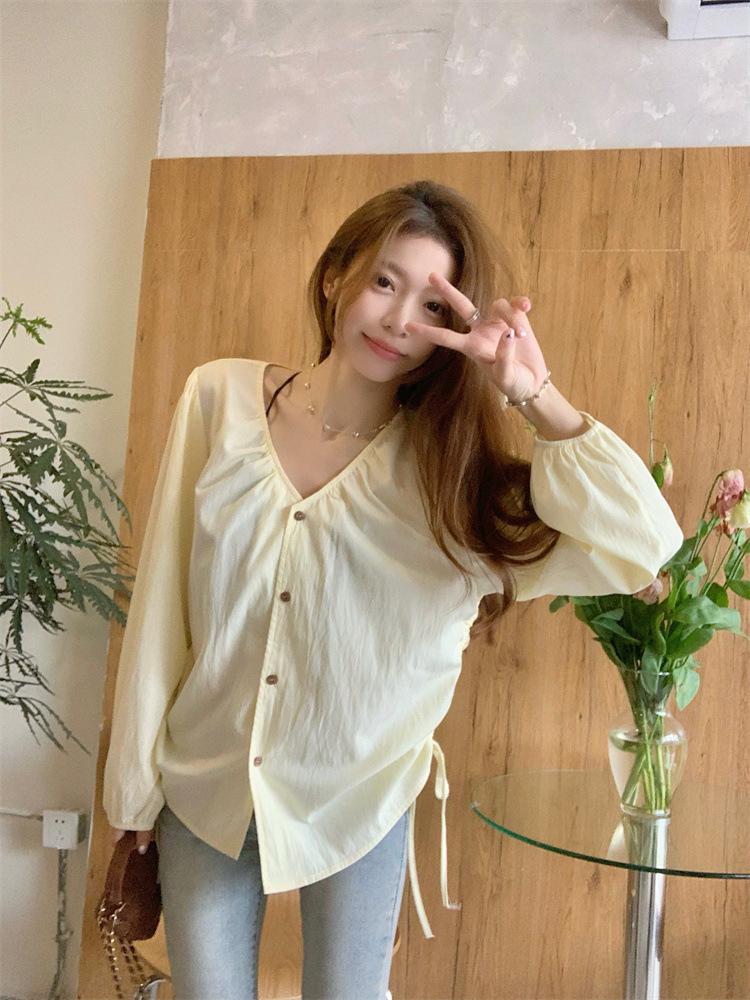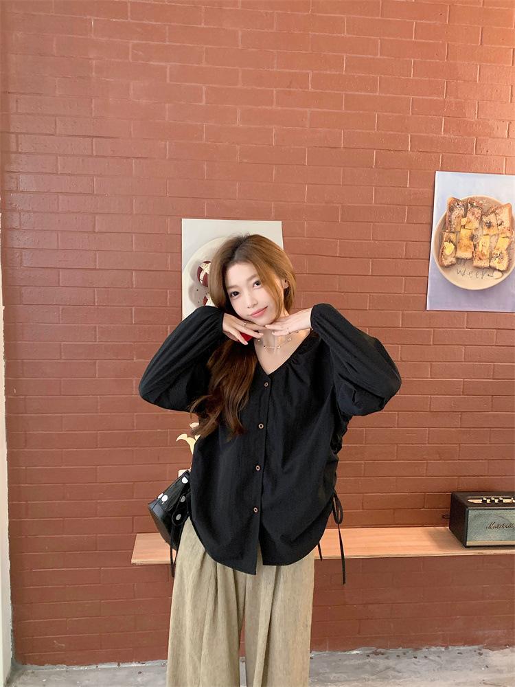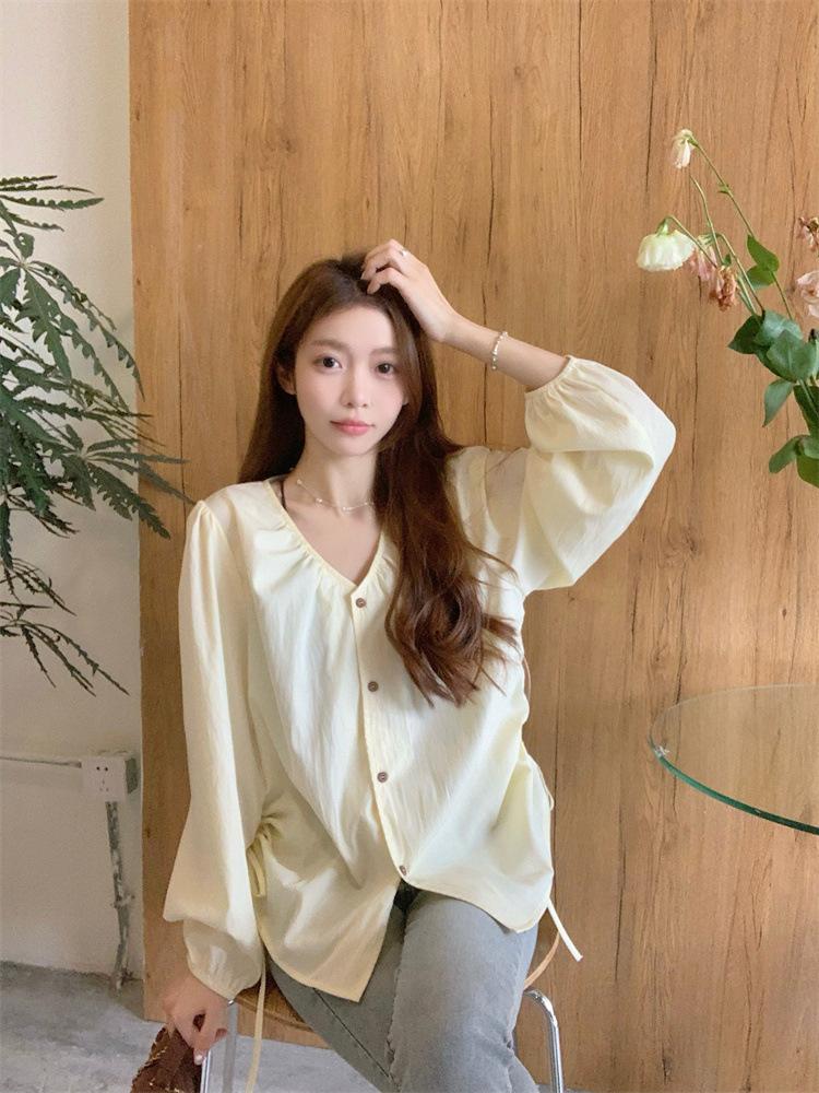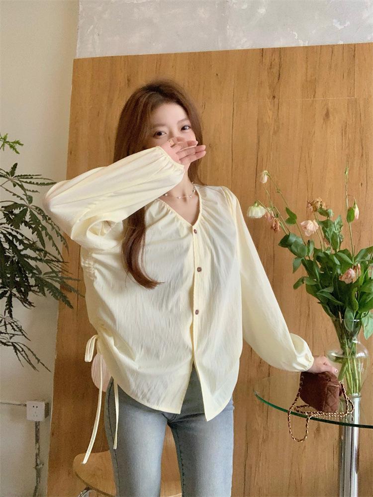 Gorda mm 2025 otoño nuevo francés adelgazante camisa cuello en V plisada con cordón manga larga top chic mujeres