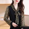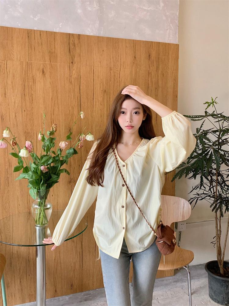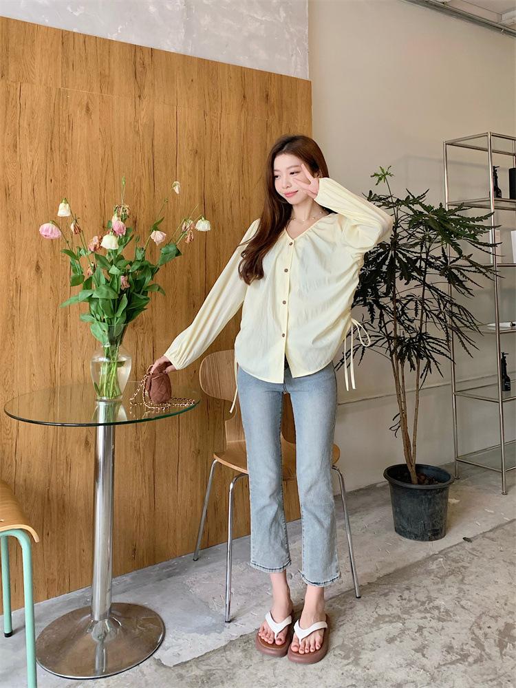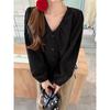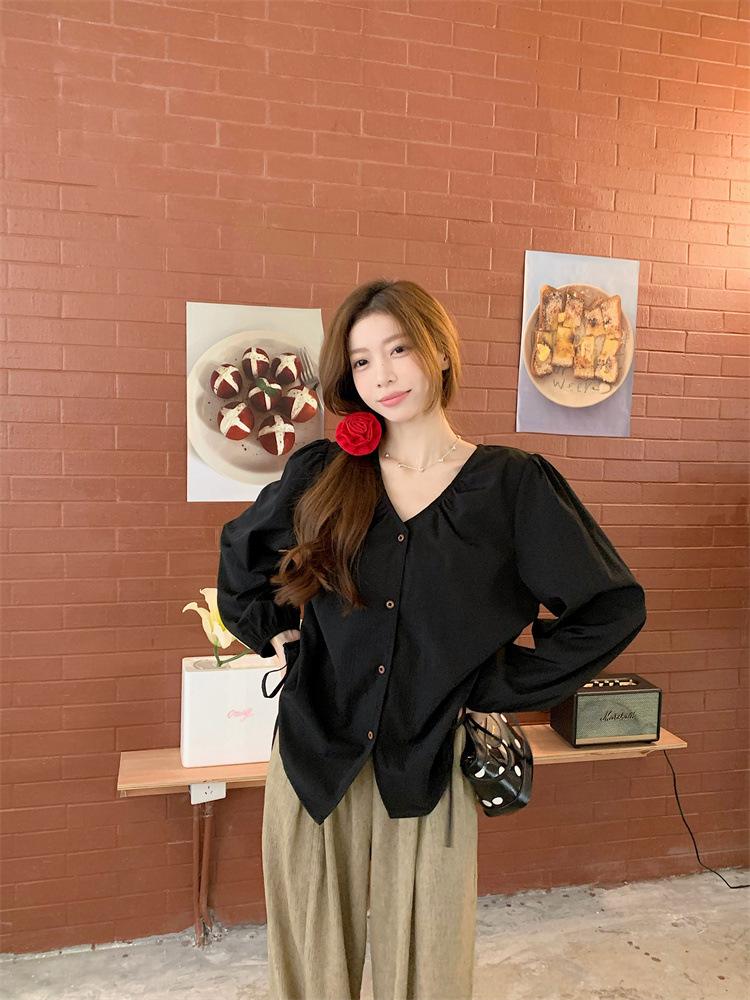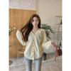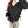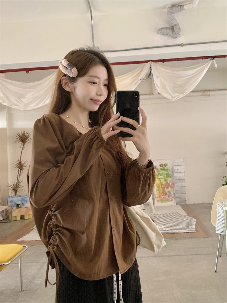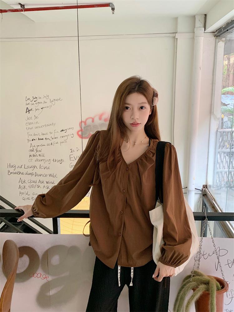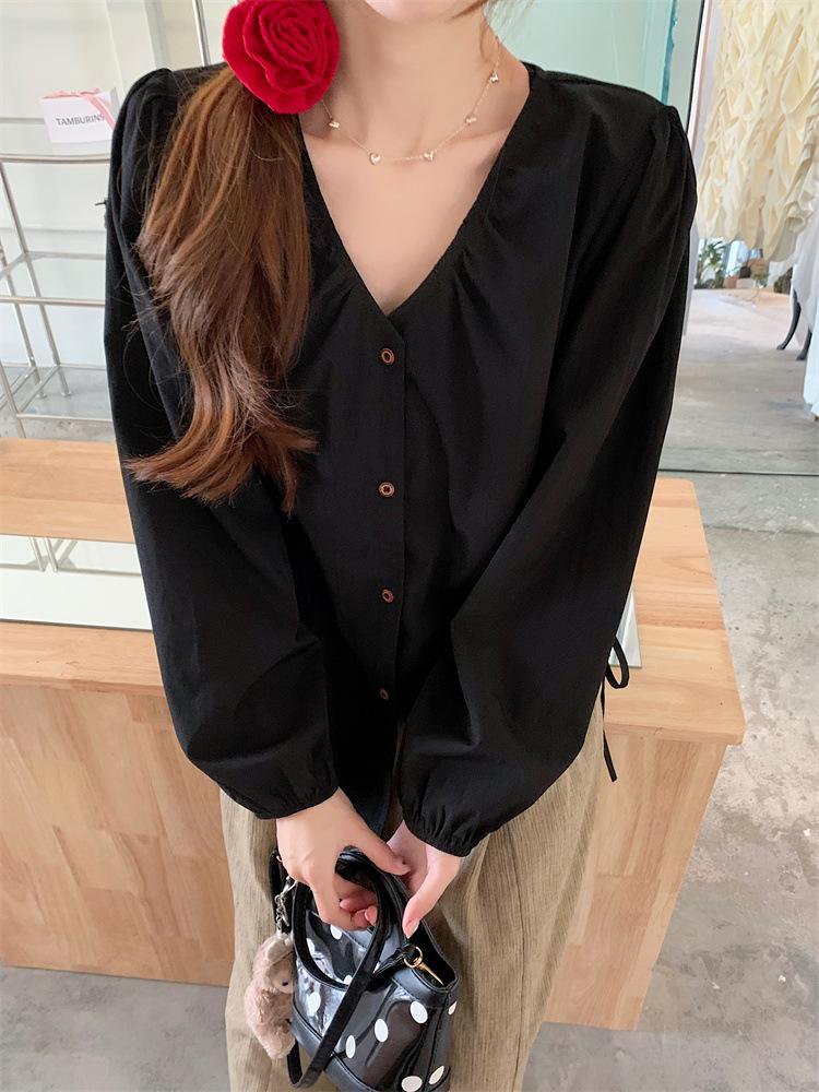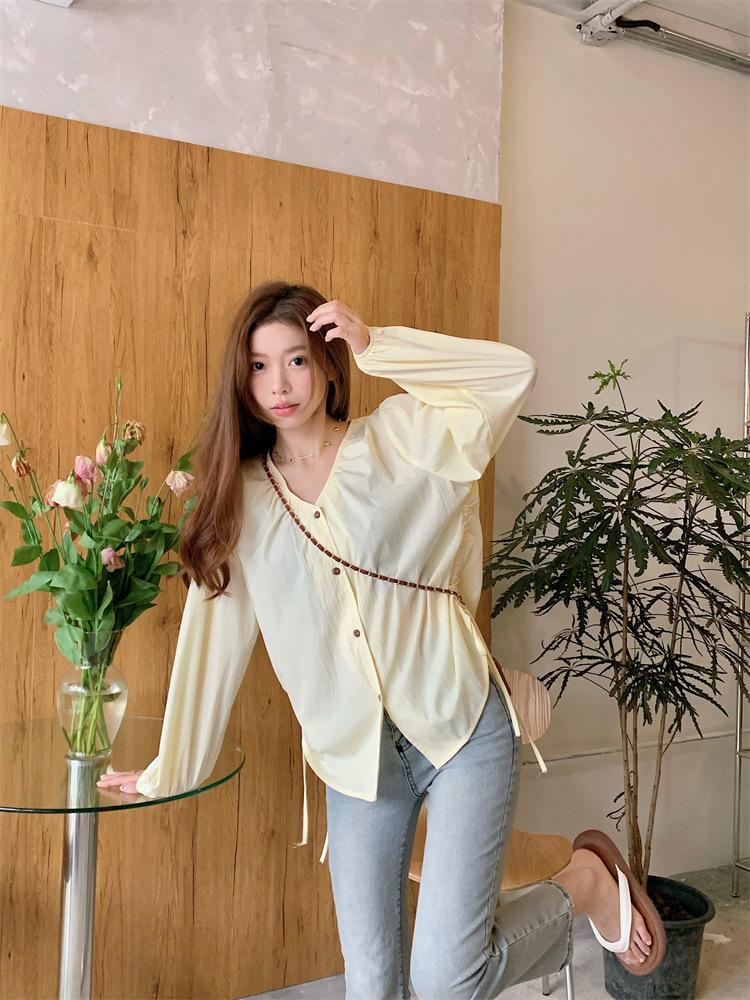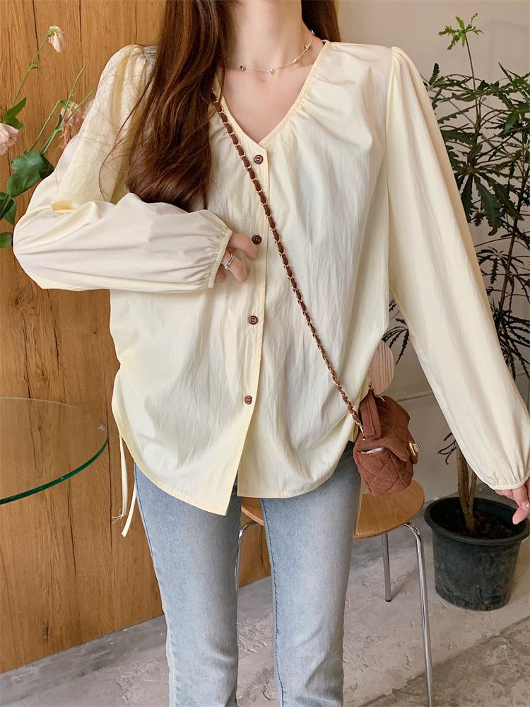 Gorda mm 2025 otoño nuevo francés adelgazante camisa cuello en V plisada con cordón manga larga top chic mujeres