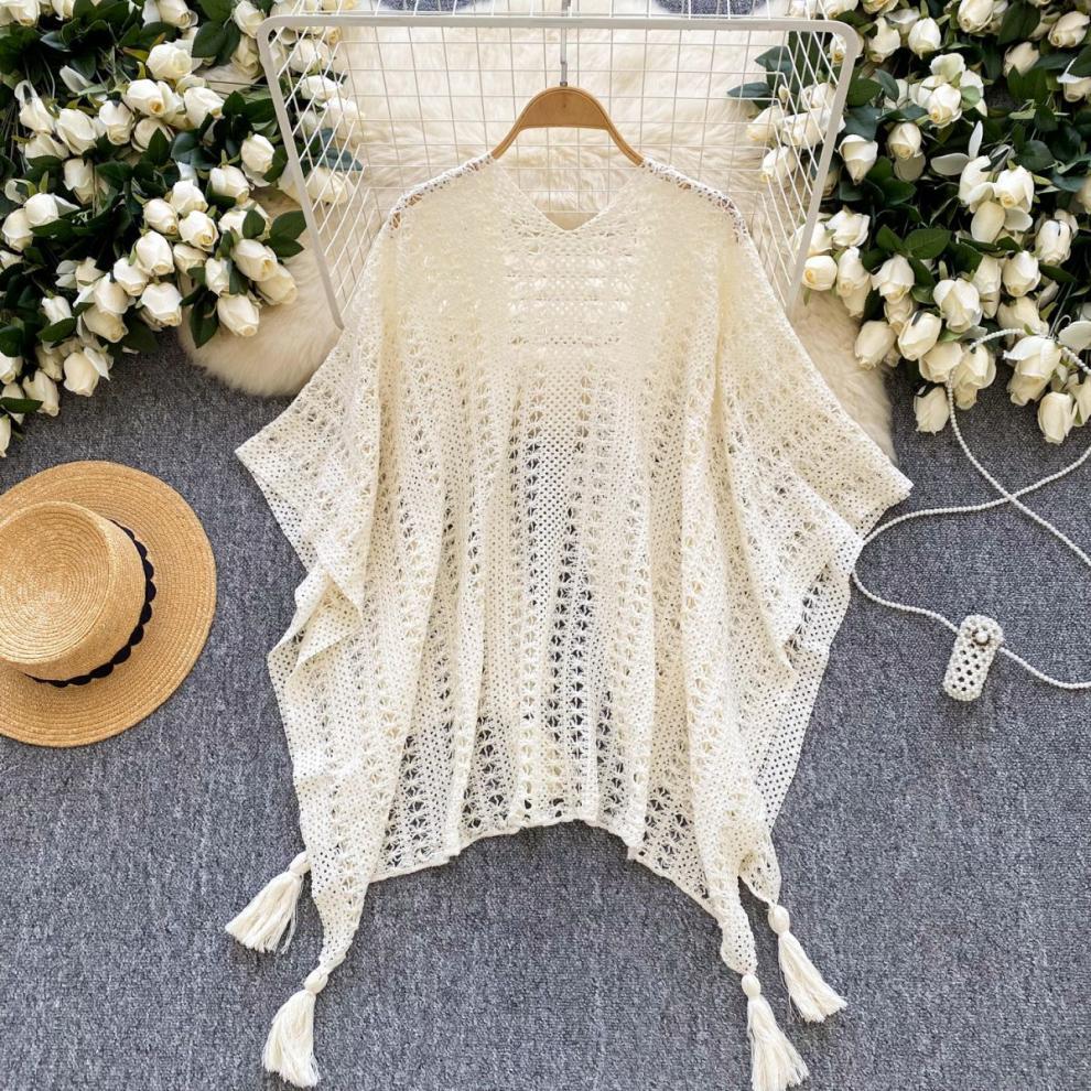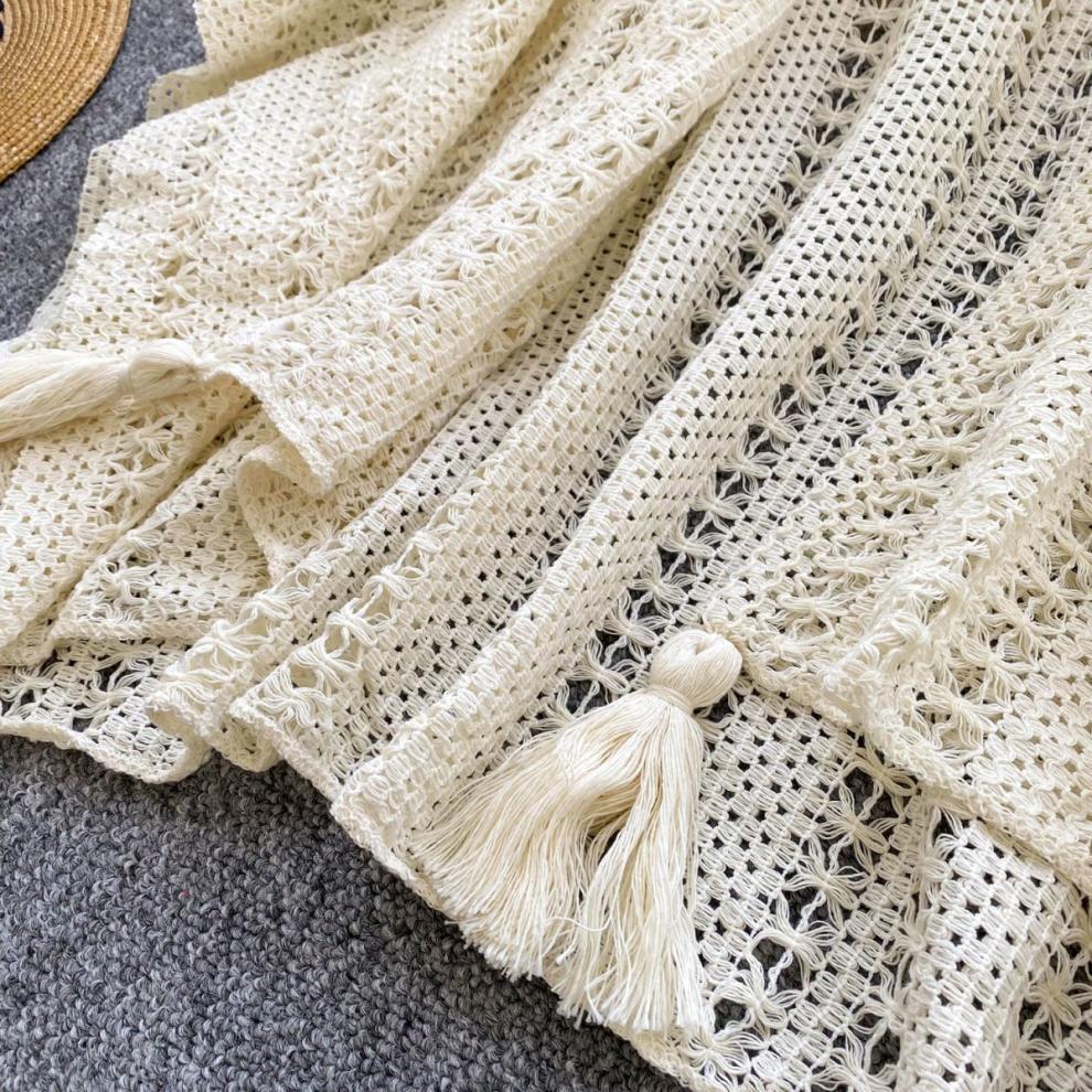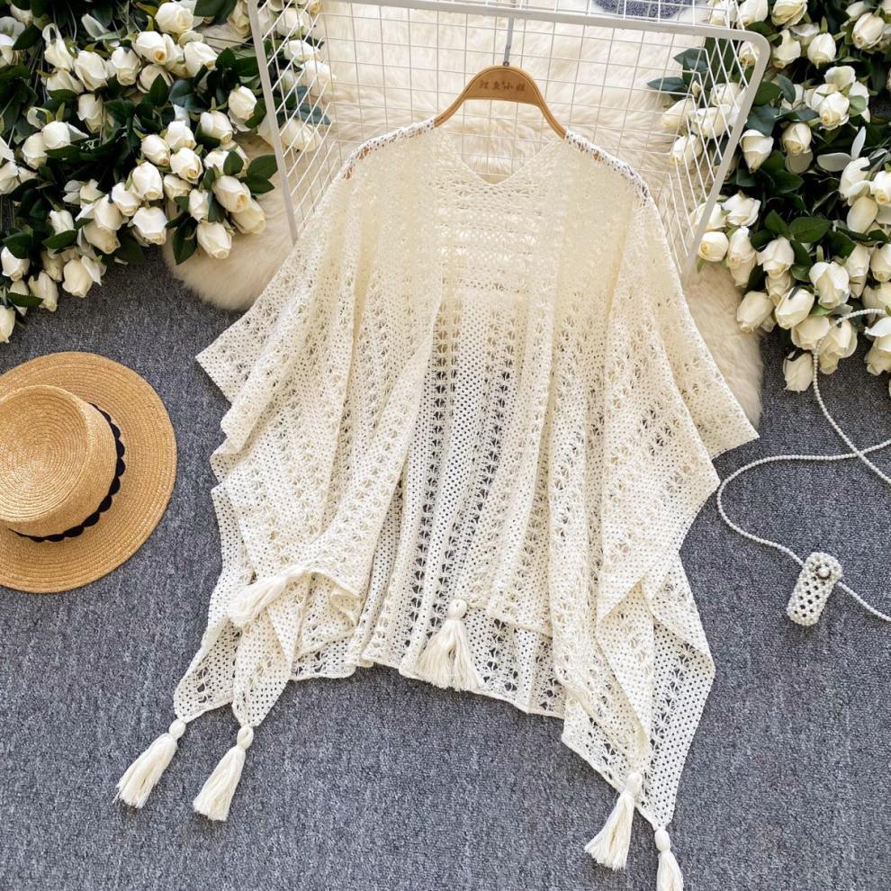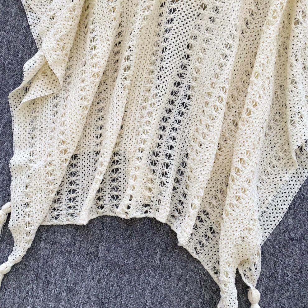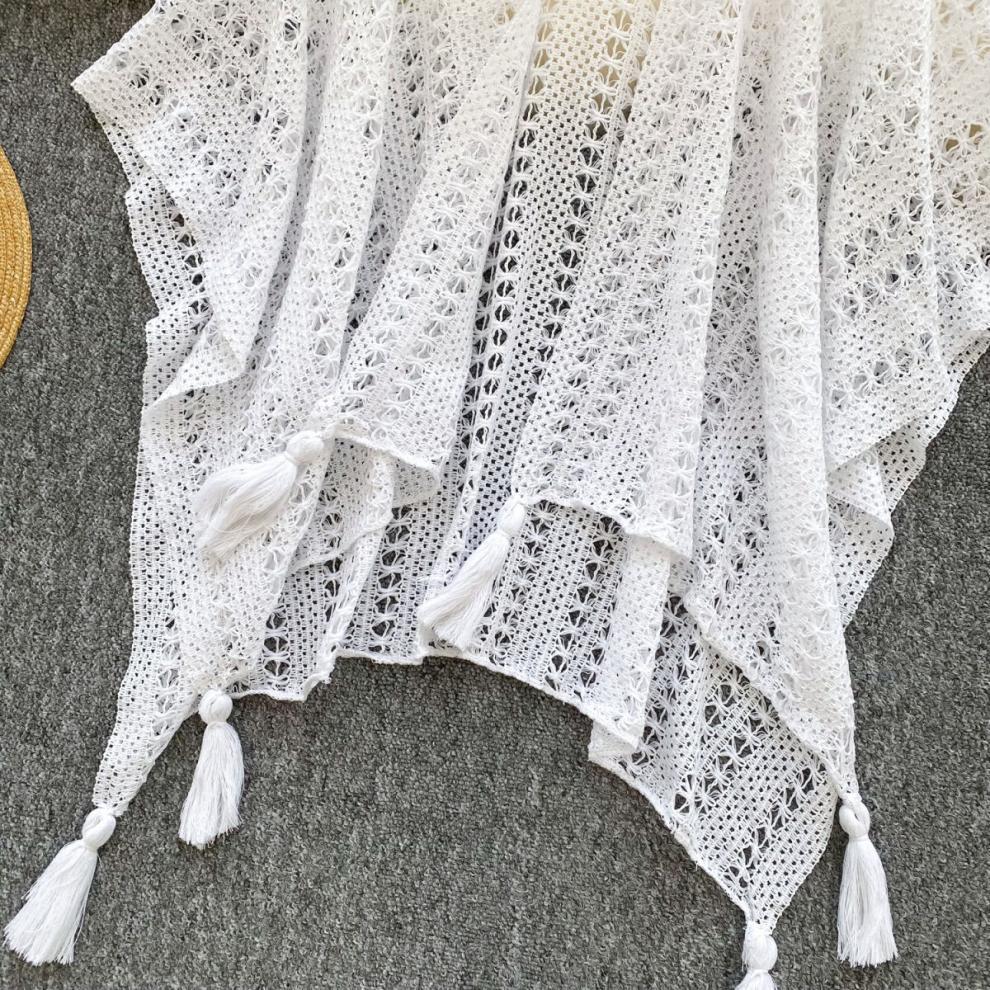Dulce Abrigo Chal Tejido Mujer Verano Viaje Vacaciones Retro Suelto Irregular Calado Borla Cárdigan