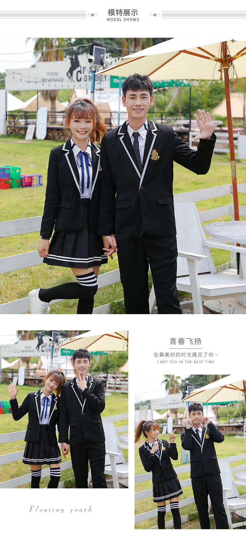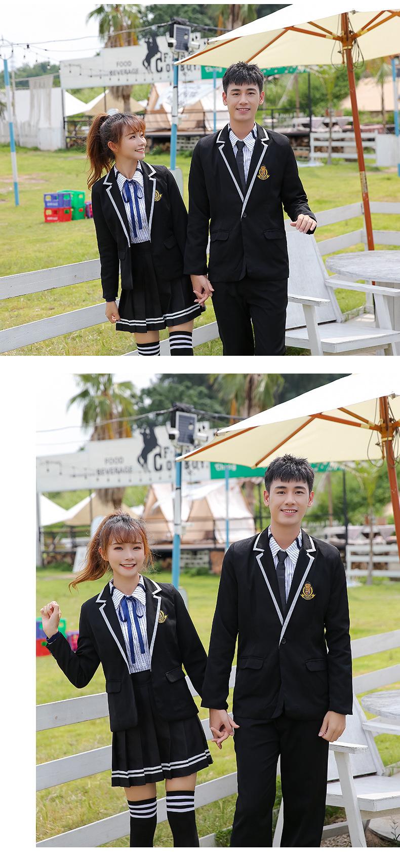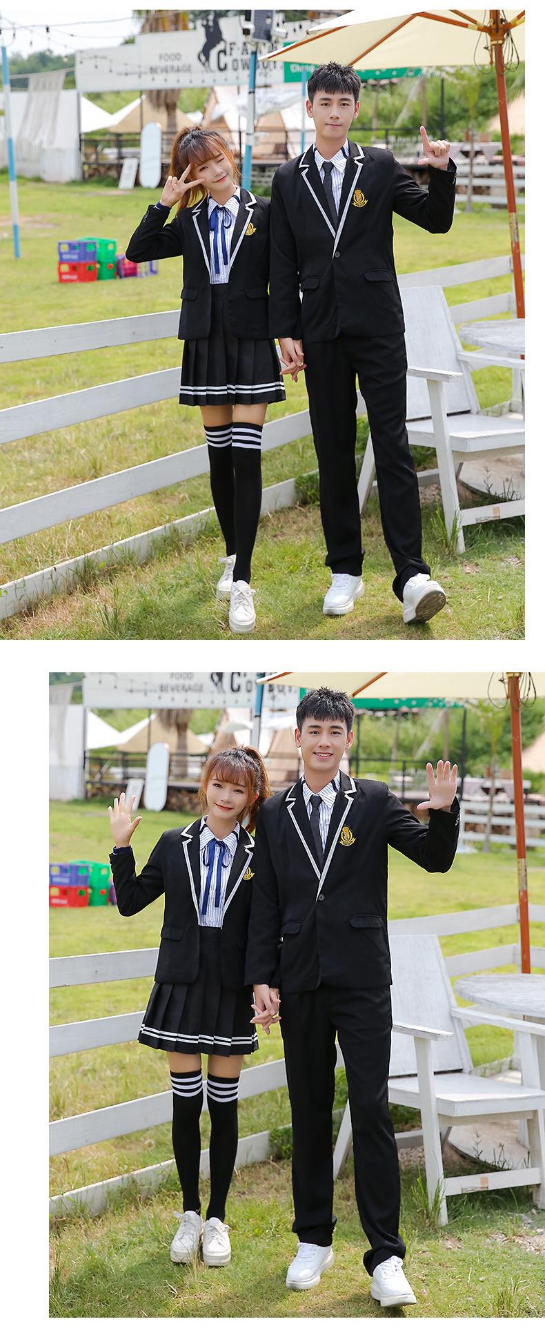 Women's black suit + thin black long sleeve + black striped skirt + Blue Ribbon, Men's black suit + thin black...
