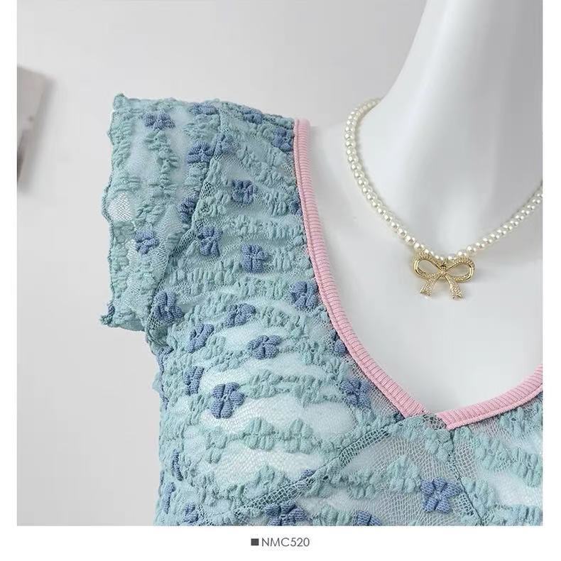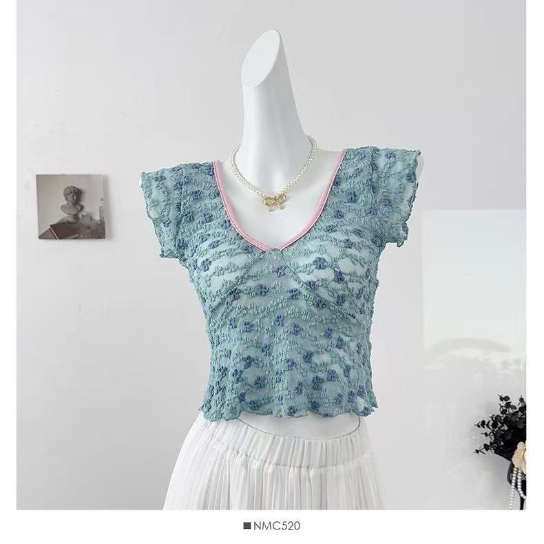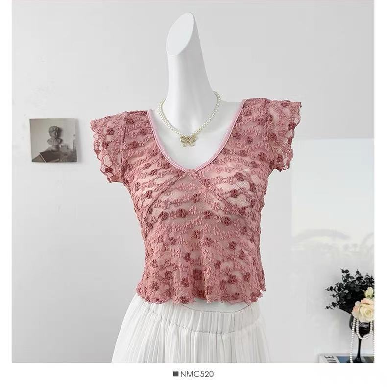 Camisa de Encaje Floral Retro Francés para Mujer Verano Nuevo Diseño Nicho Adelgazante Manga Corta Top Marea