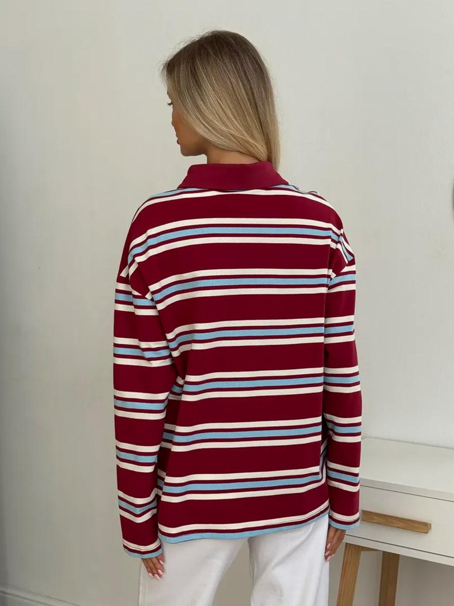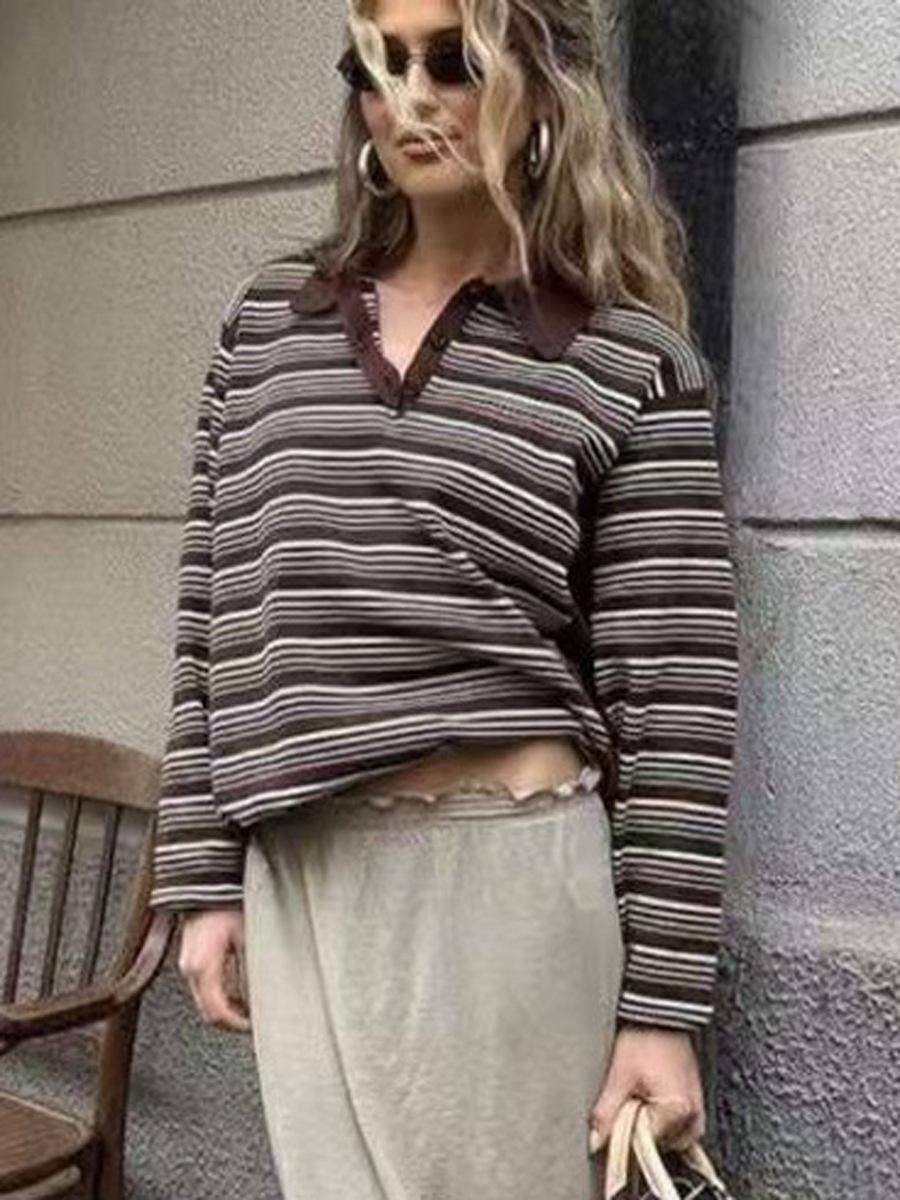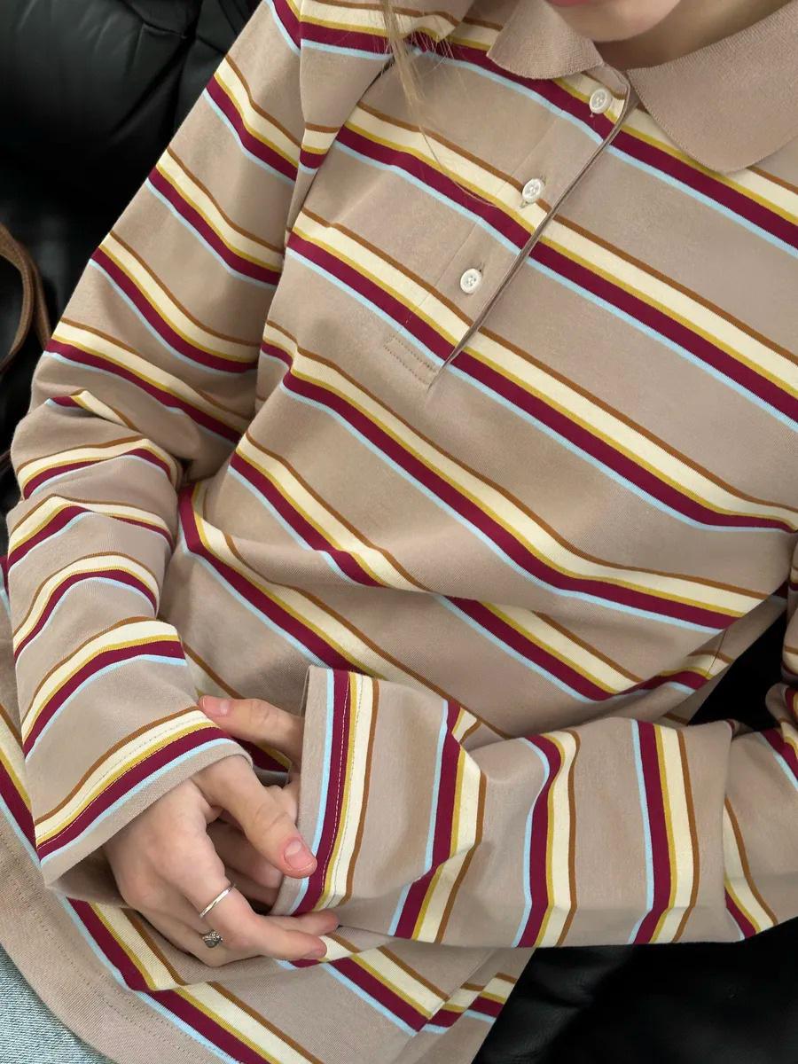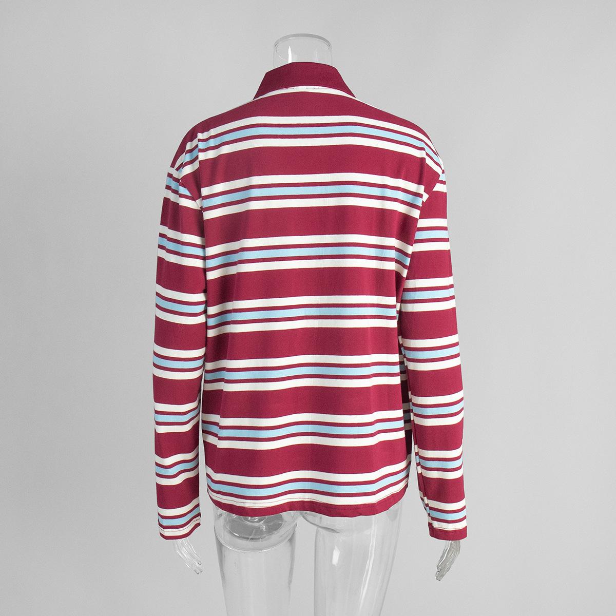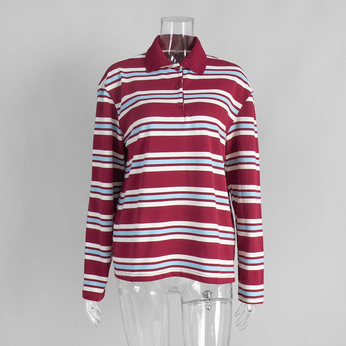 Camiseta de Rayas de Manga Larga Transfronteriza para Mujer Europea y Americana Primavera y Verano Nueva Camiseta Holgada con Cuello Polo Moderna Retro para Fondo