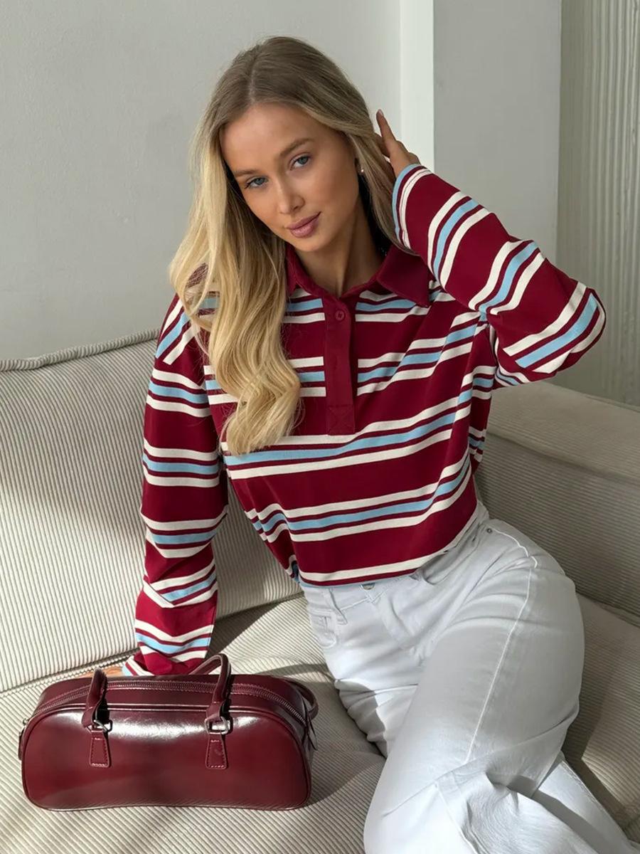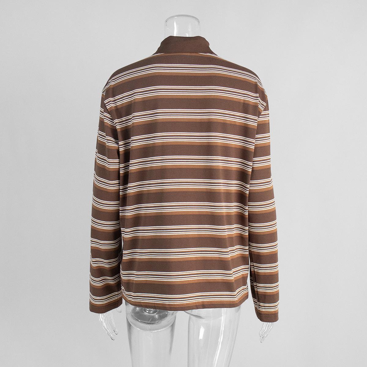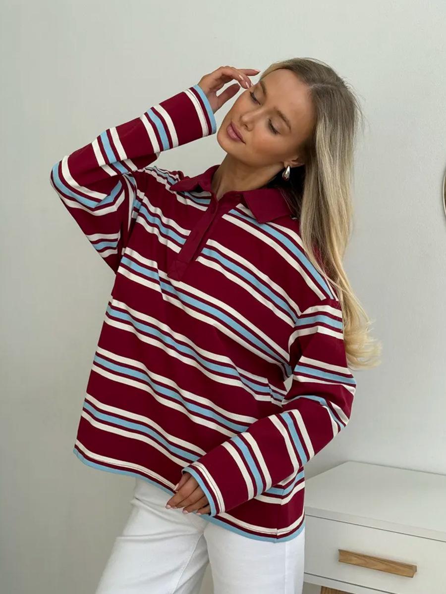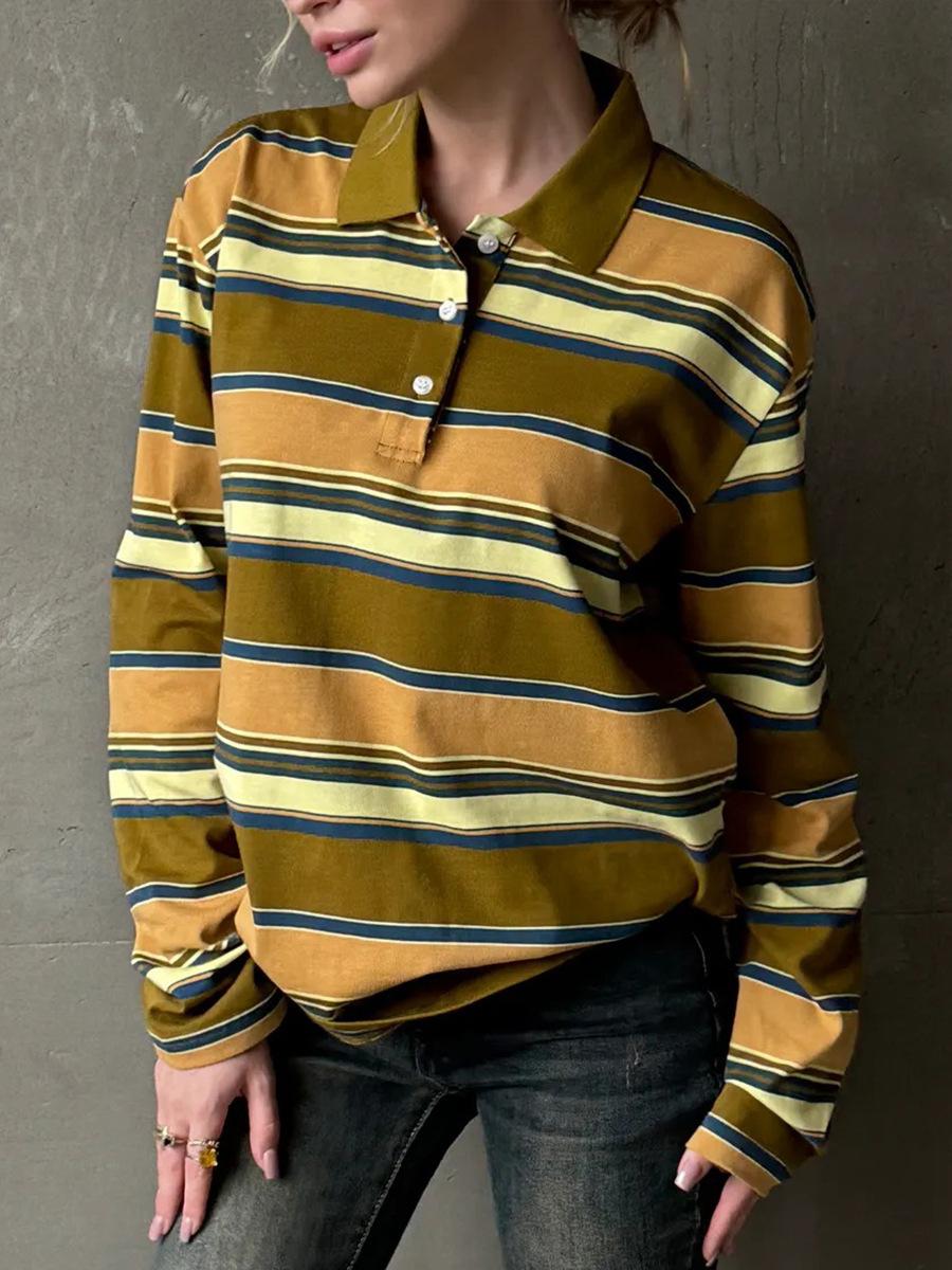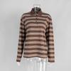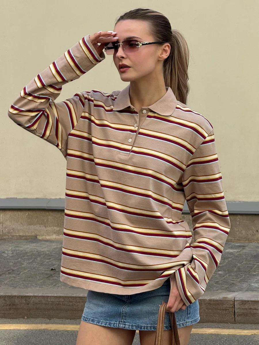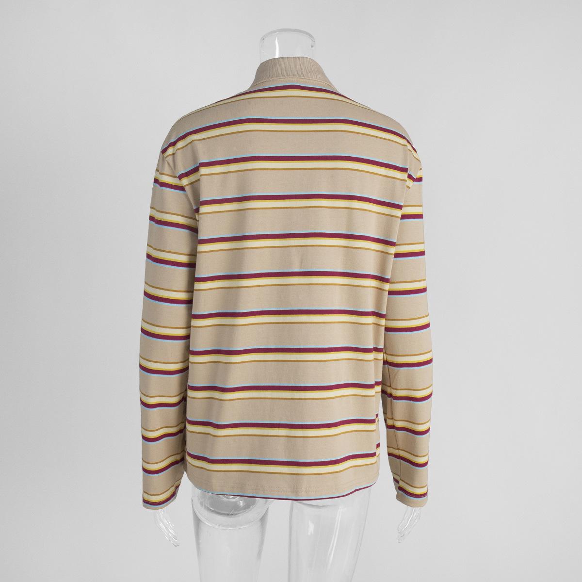 Camiseta de Rayas de Manga Larga Transfronteriza para Mujer Europea y Americana Primavera y Verano Nueva Camiseta Holgada con Cuello Polo Moderna Retro para Fondo