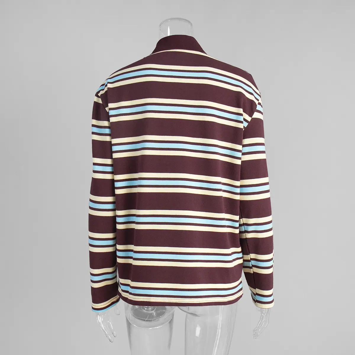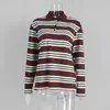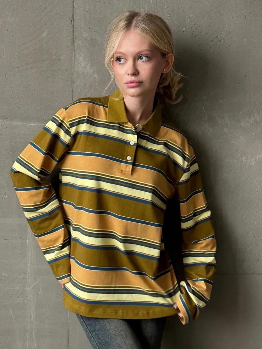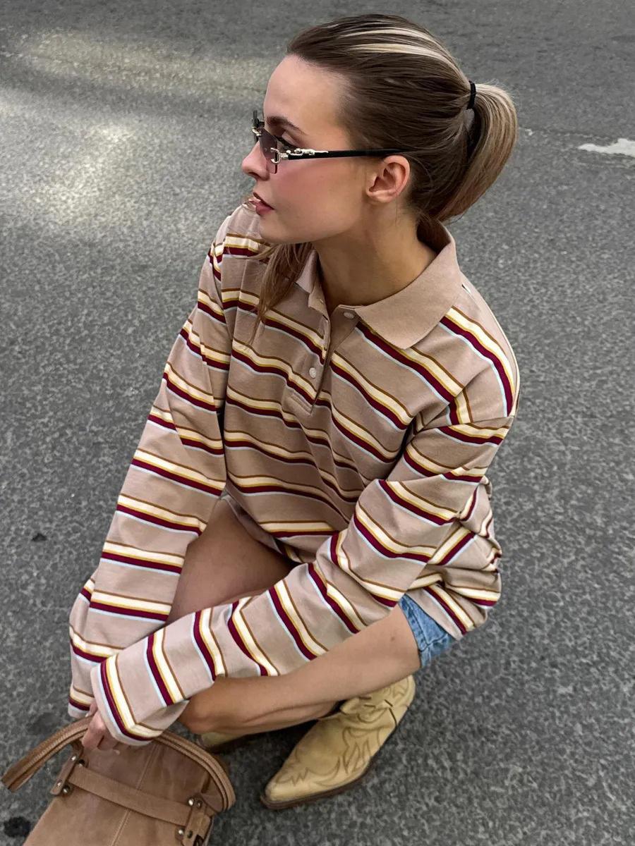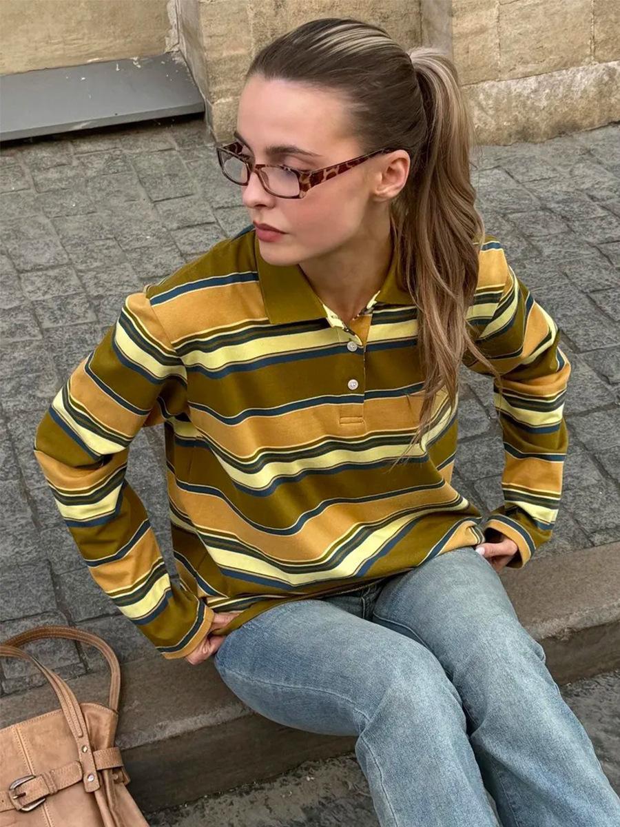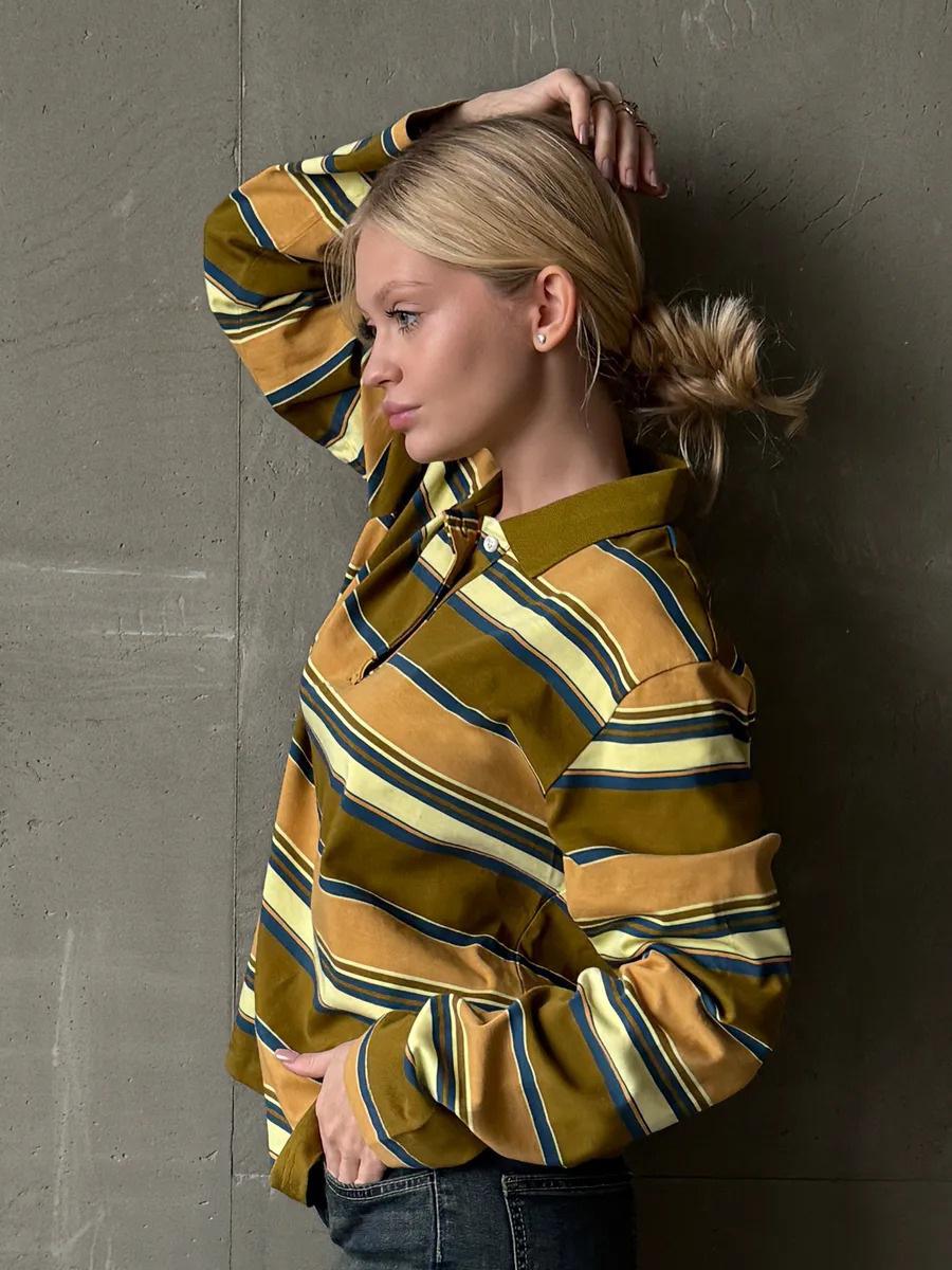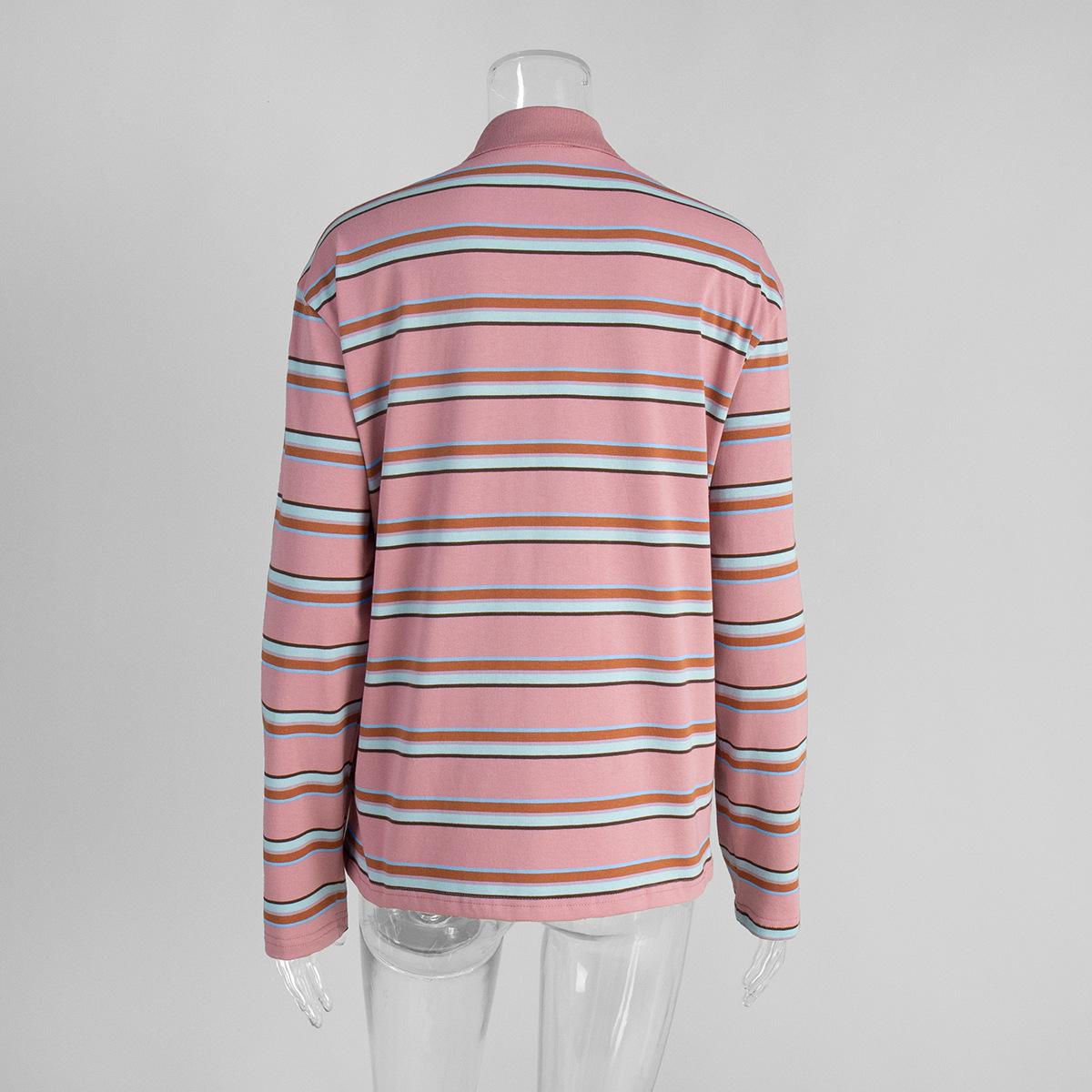 Camiseta de Rayas de Manga Larga Transfronteriza para Mujer Europea y Americana Primavera y Verano Nueva Camiseta Holgada con Cuello Polo Moderna Retro para Fondo