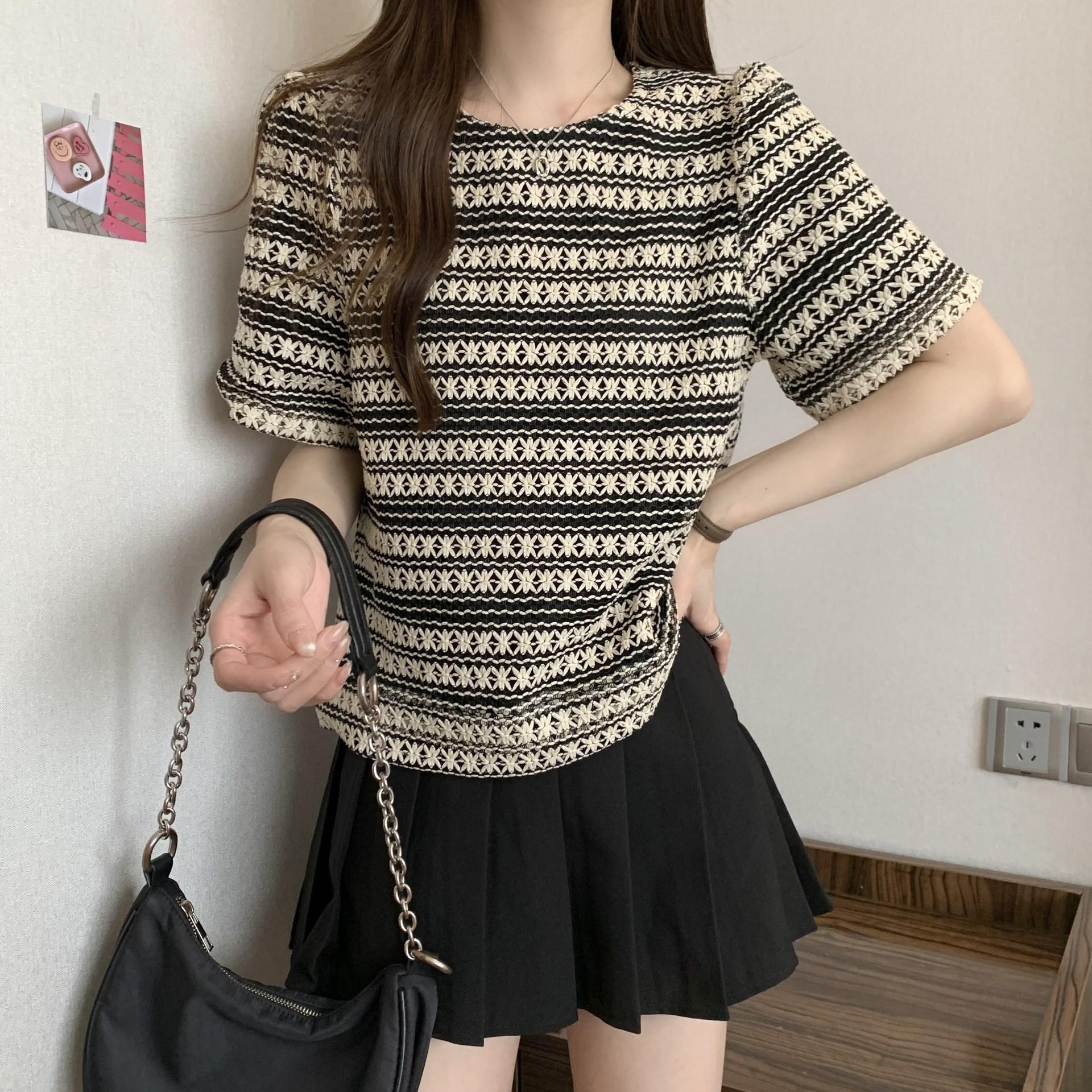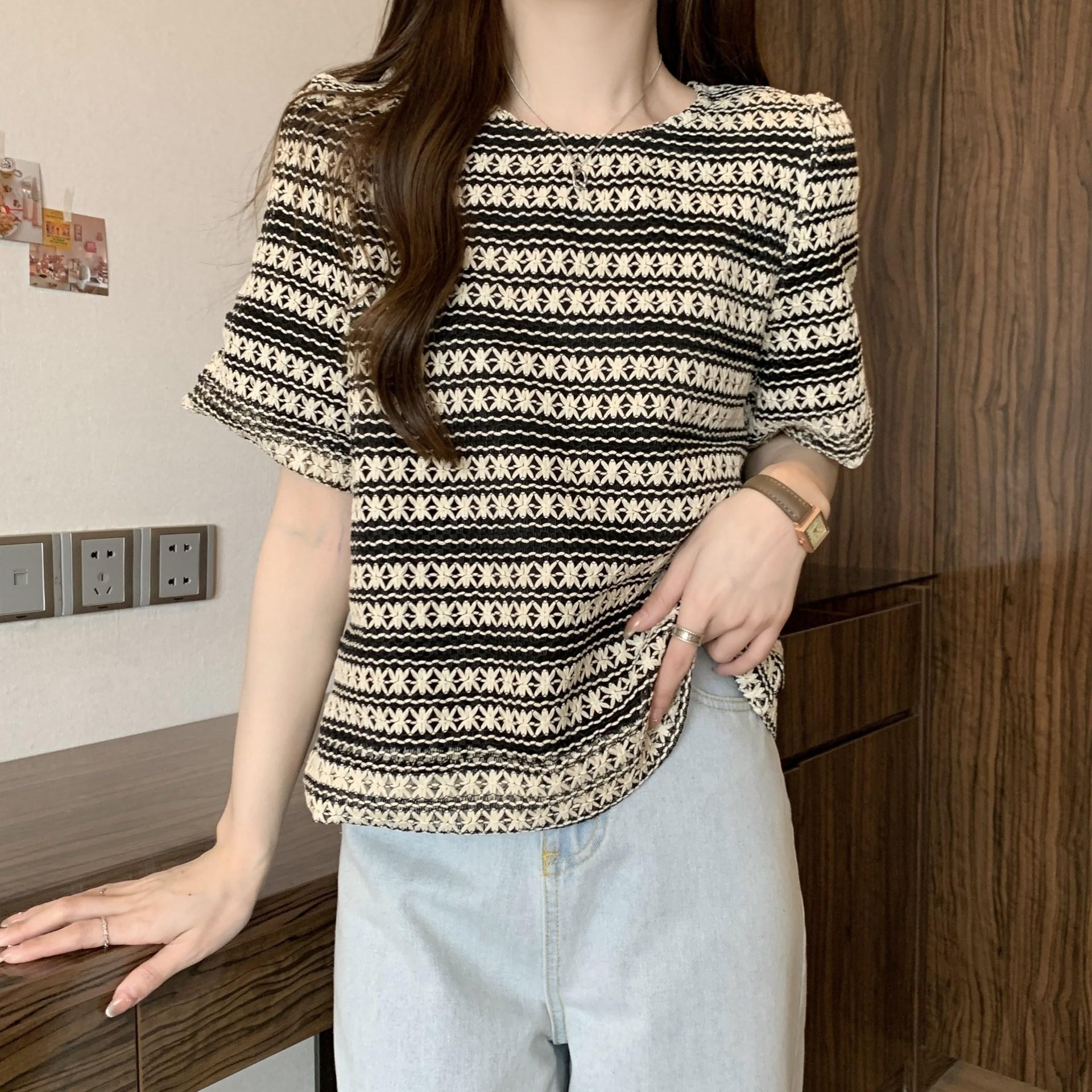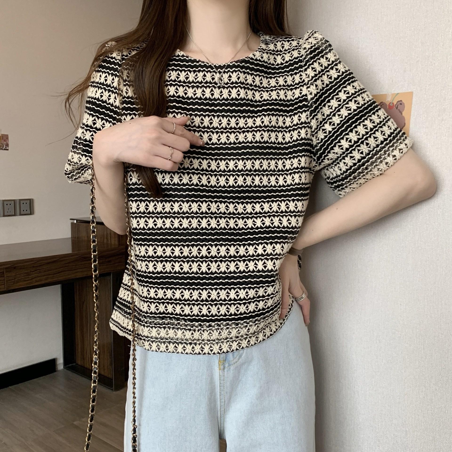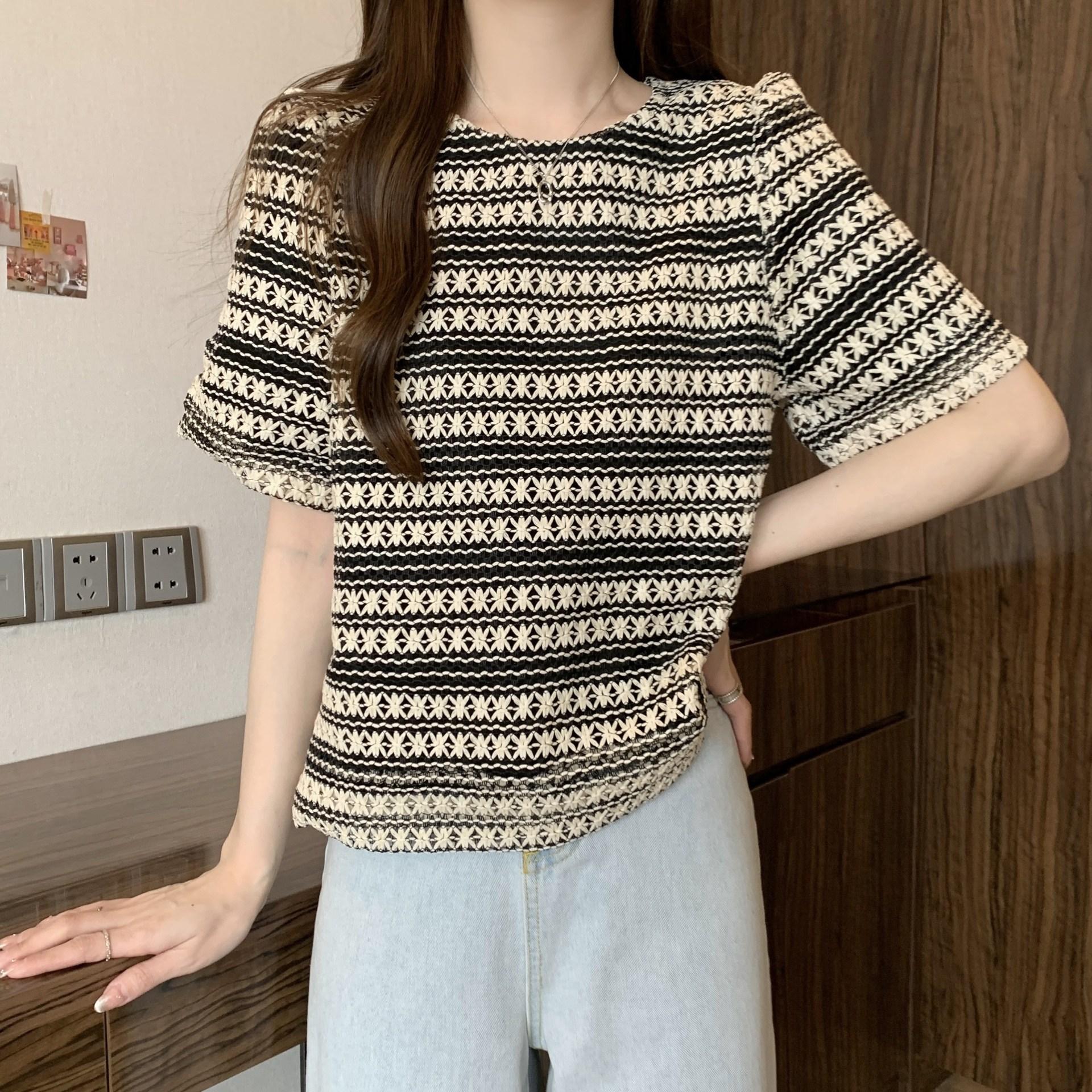Camiseta de Manga Corta con Rayas Francesas para Mujer Verano Talla Grande Cubre Gorditos Adelgazante Abdomen Encaje Retro