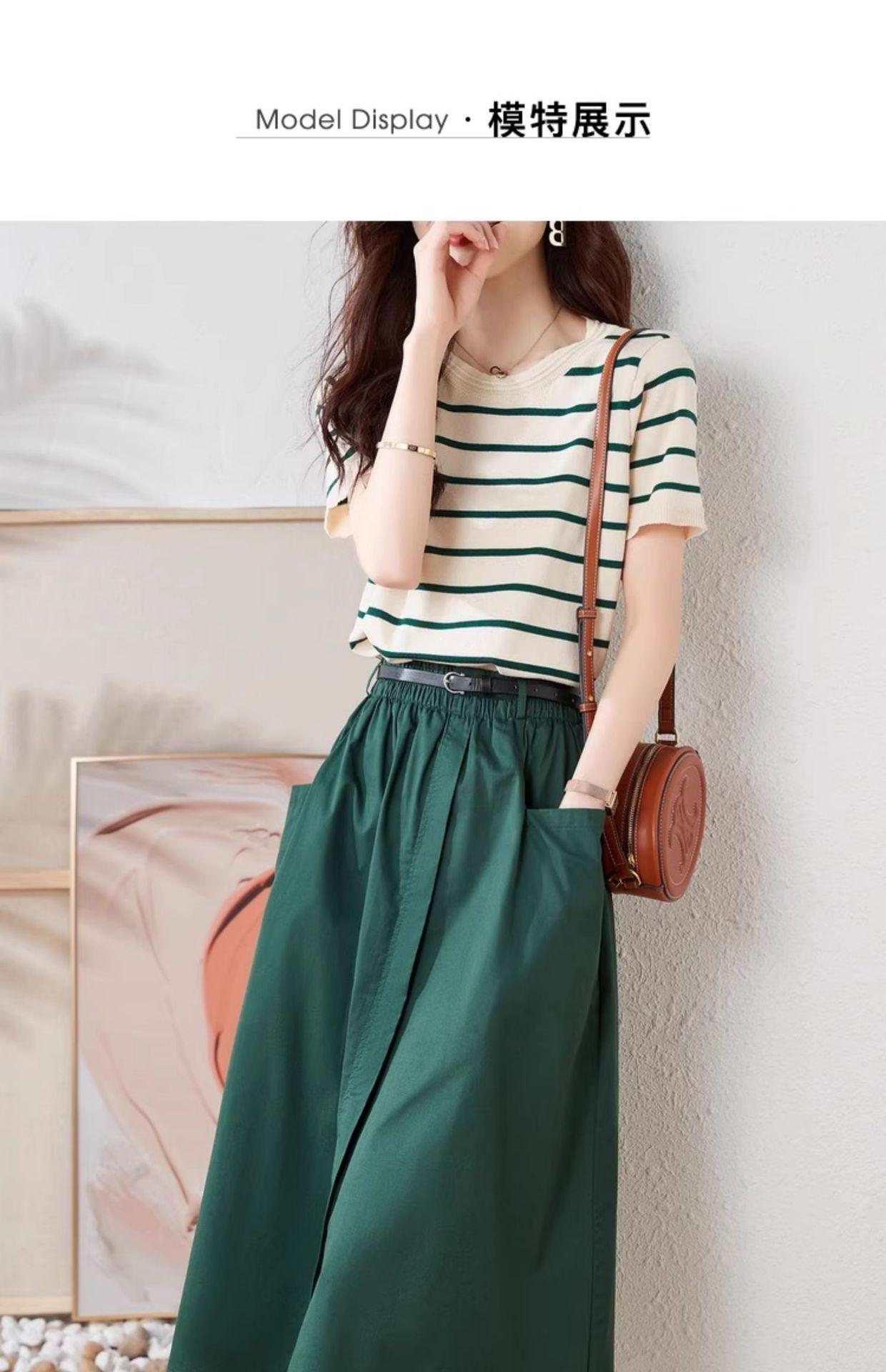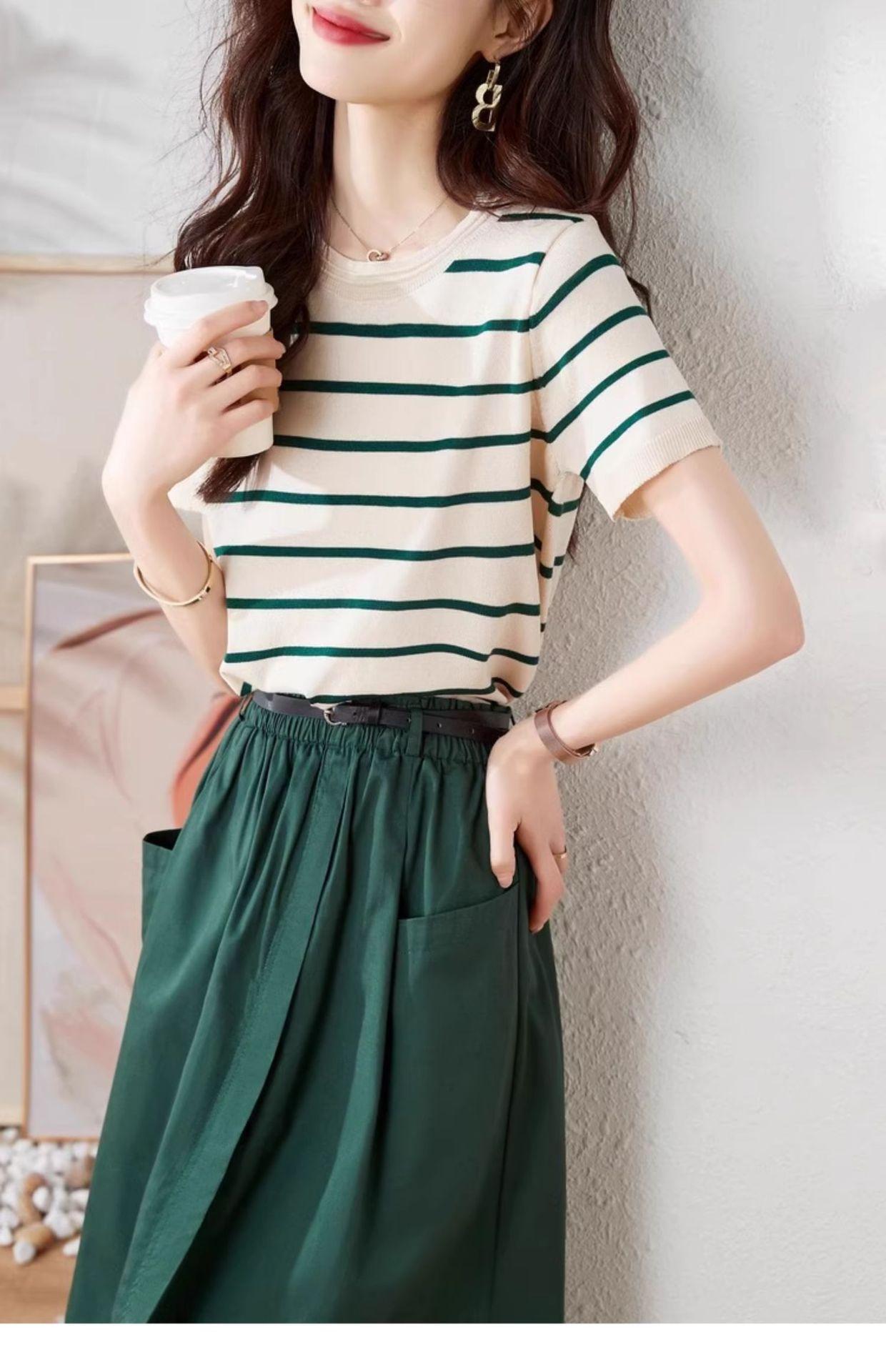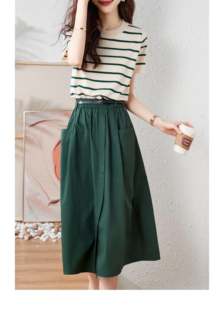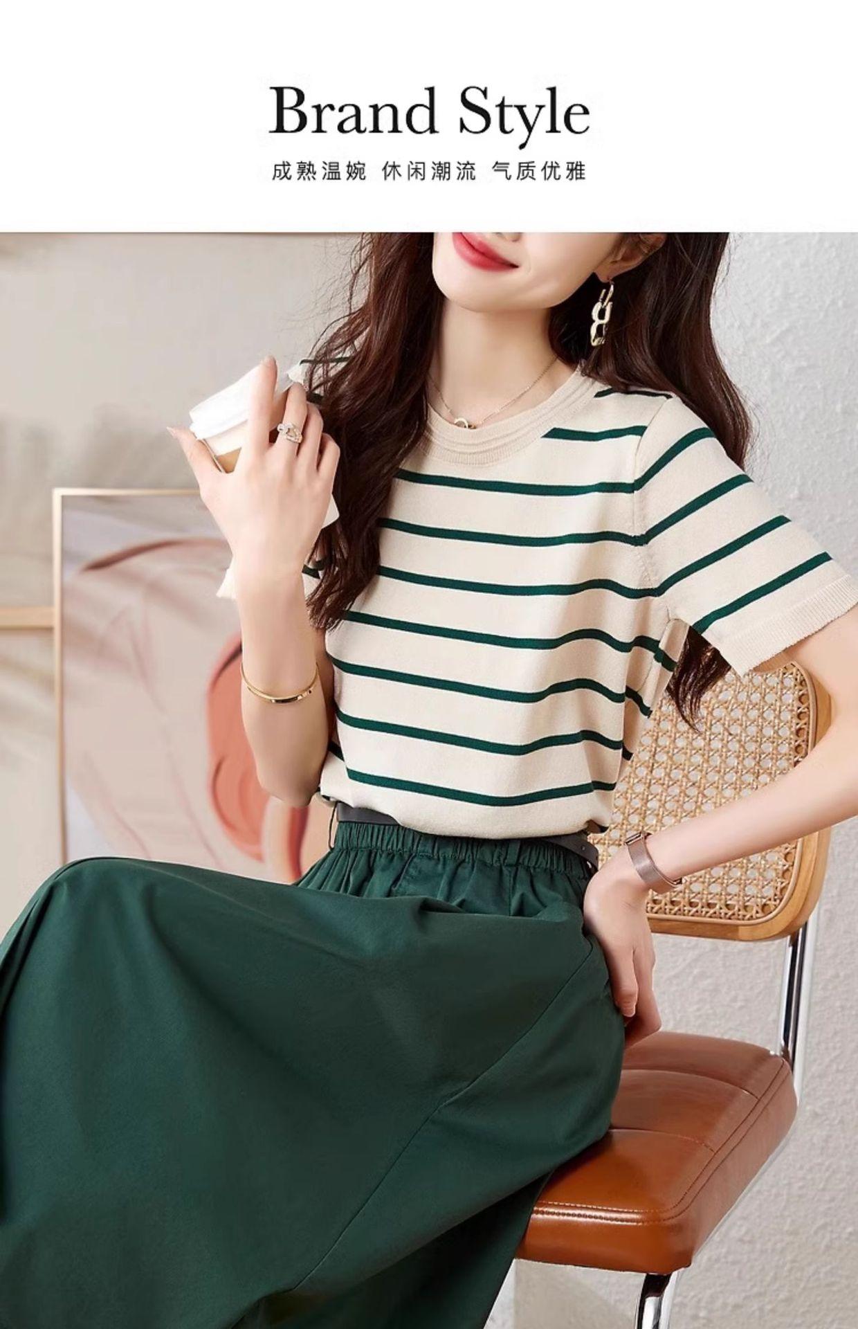 Traje de Moda Casual de Verano Nuevo 2025 para Mujer Camiseta Retro de Rayas Finas Falda de Cintura Elástica Conjunto de Dos Piezas