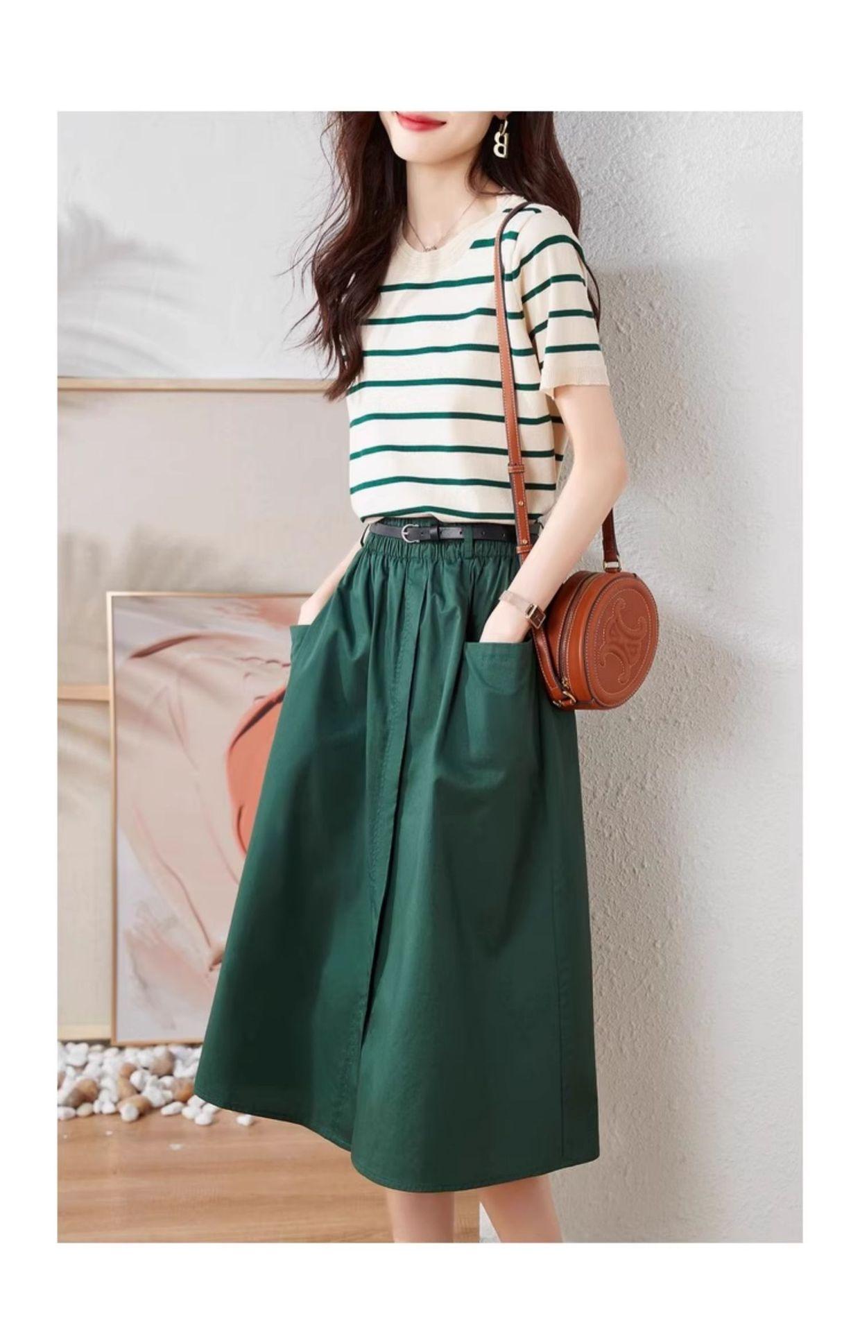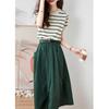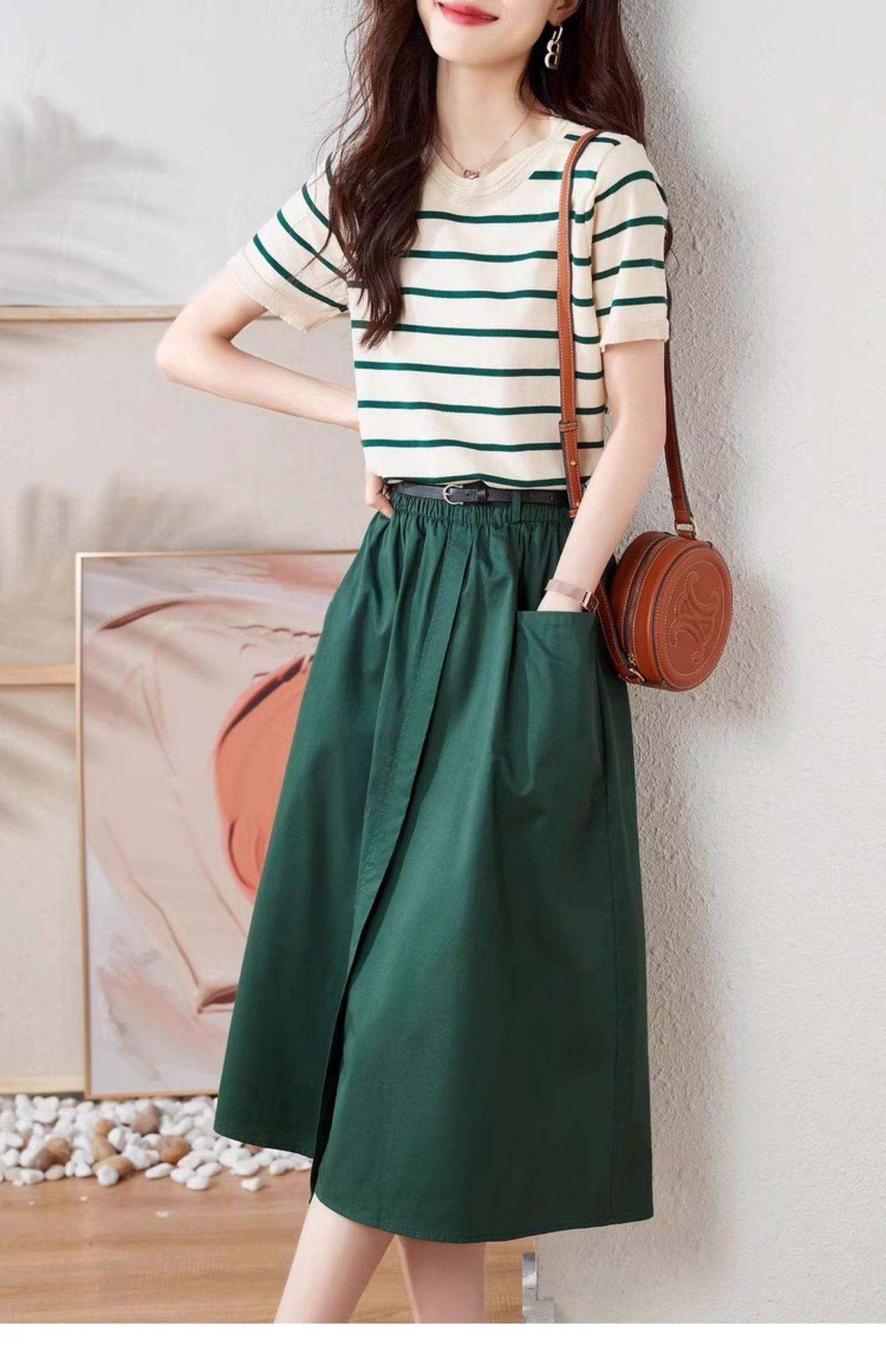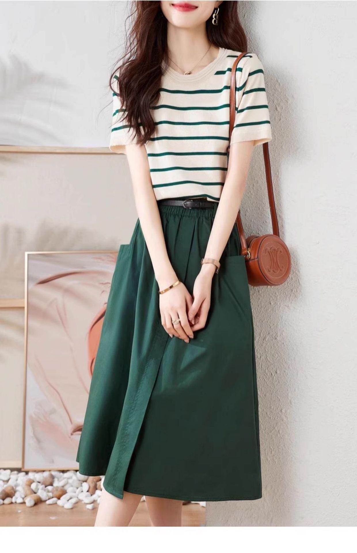 Traje de Moda Casual de Verano Nuevo 2025 para Mujer Camiseta Retro de Rayas Finas Falda de Cintura Elástica Conjunto de Dos Piezas