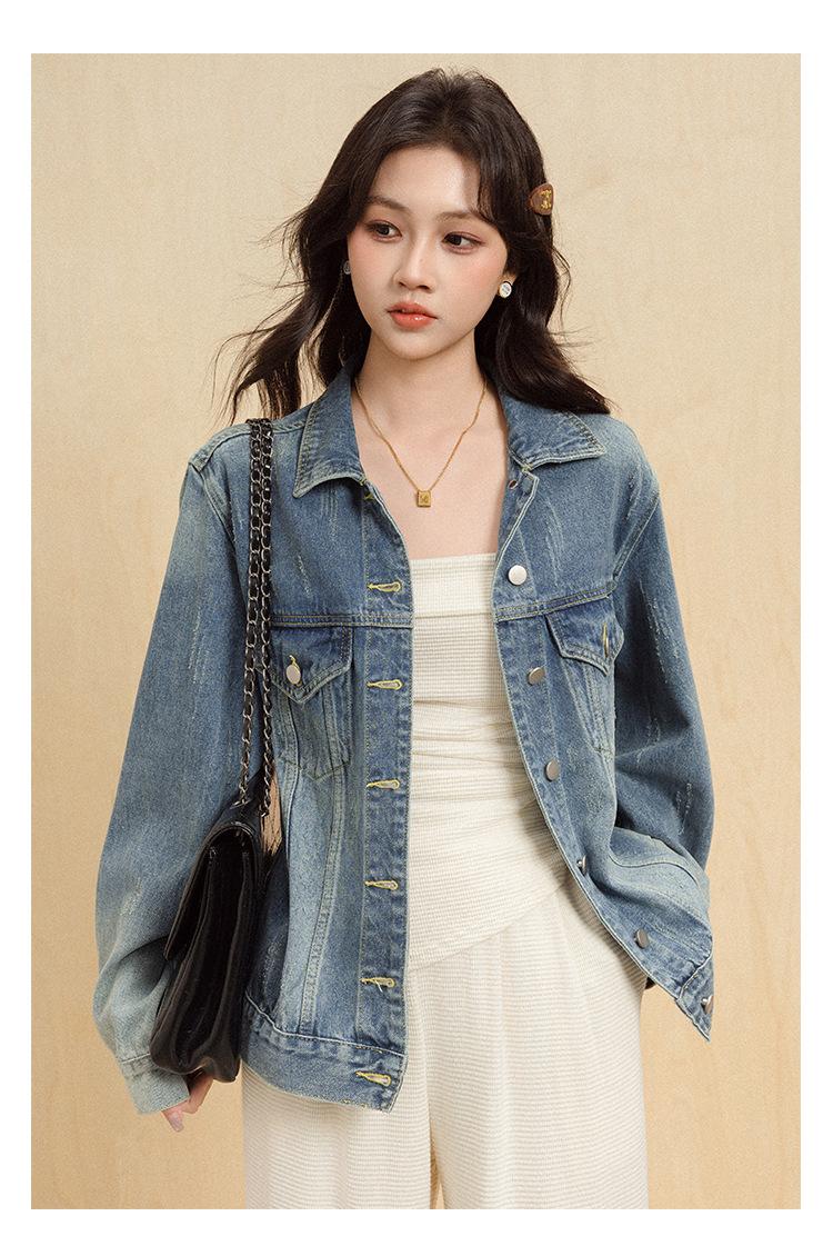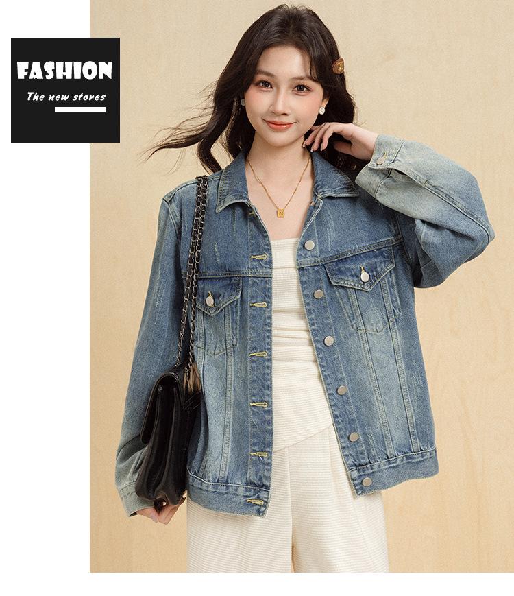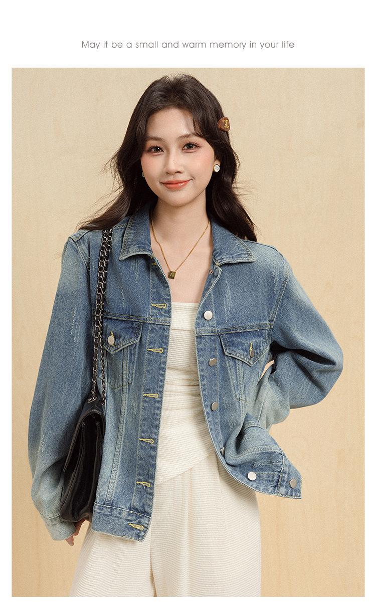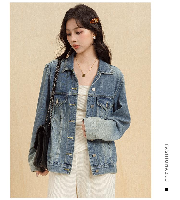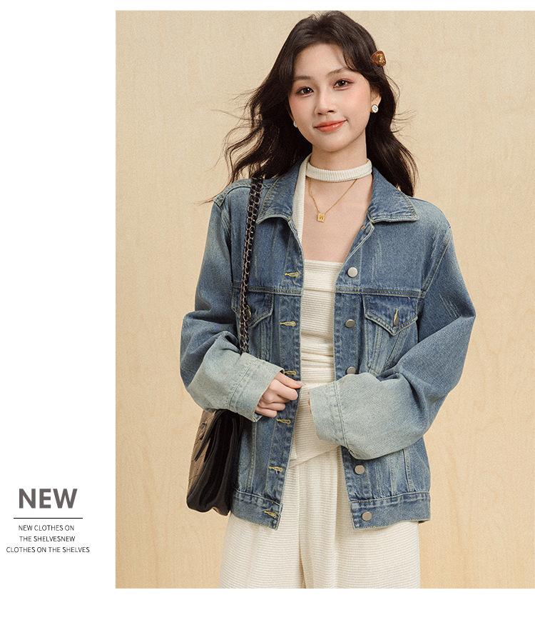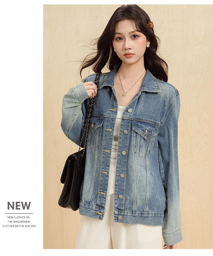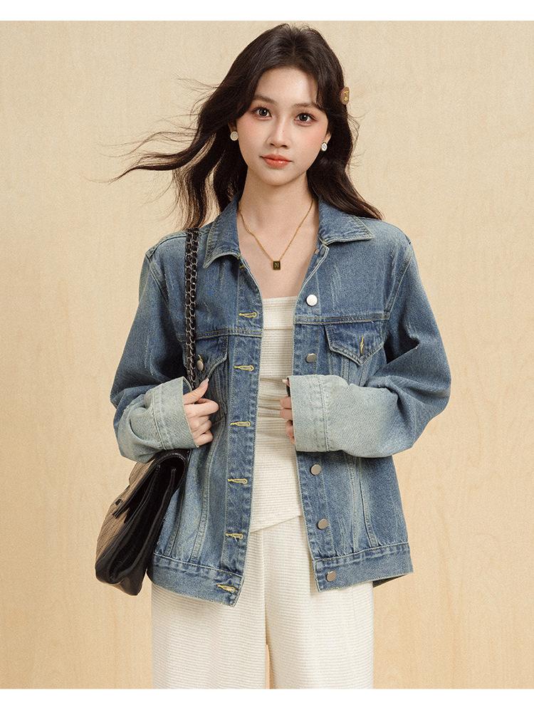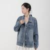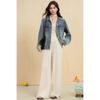 2025 Otoño Nuevo Estilo Coreano Tendencia Retro Versátil Lavado Desgastado Cuello Vuelto Versátil Estilo Hong Kong Chaqueta de Mezclilla Mujer